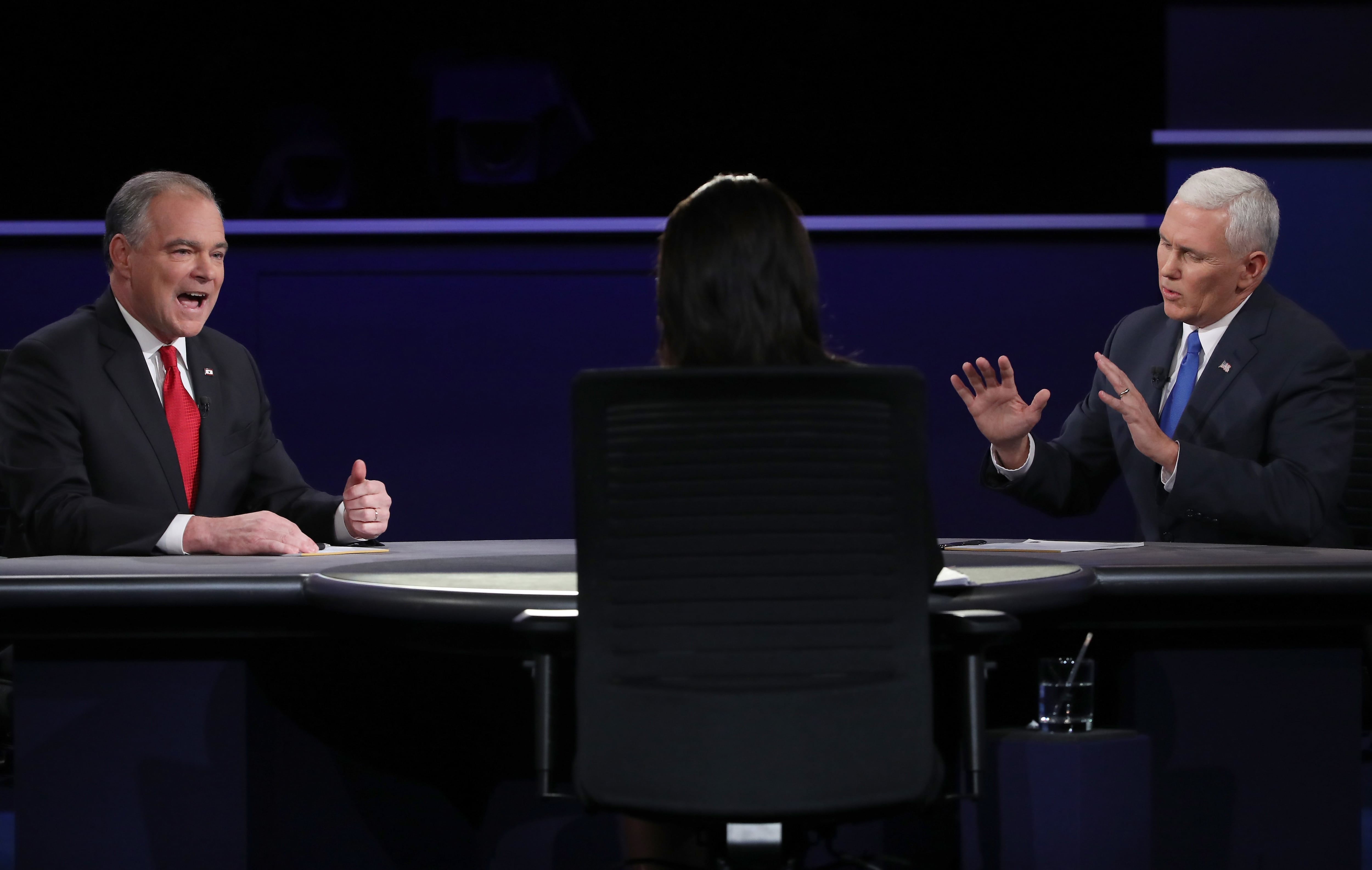 The debate pit Pence, Indiana's governor, against Kaine, the former governor of Virginia and its junior senator. Both have a son serving in the US Marine Corps, both have Catholic backgrounds — though Pence is now evangelical — and both are longtime politicians.