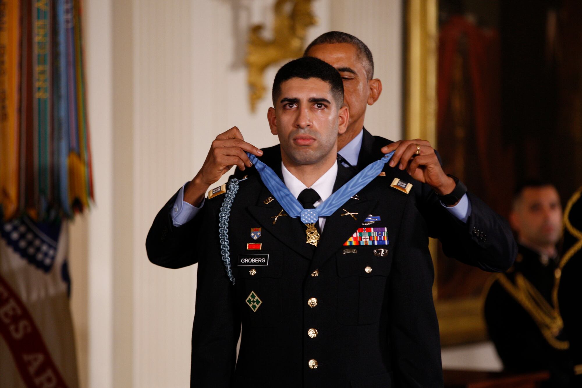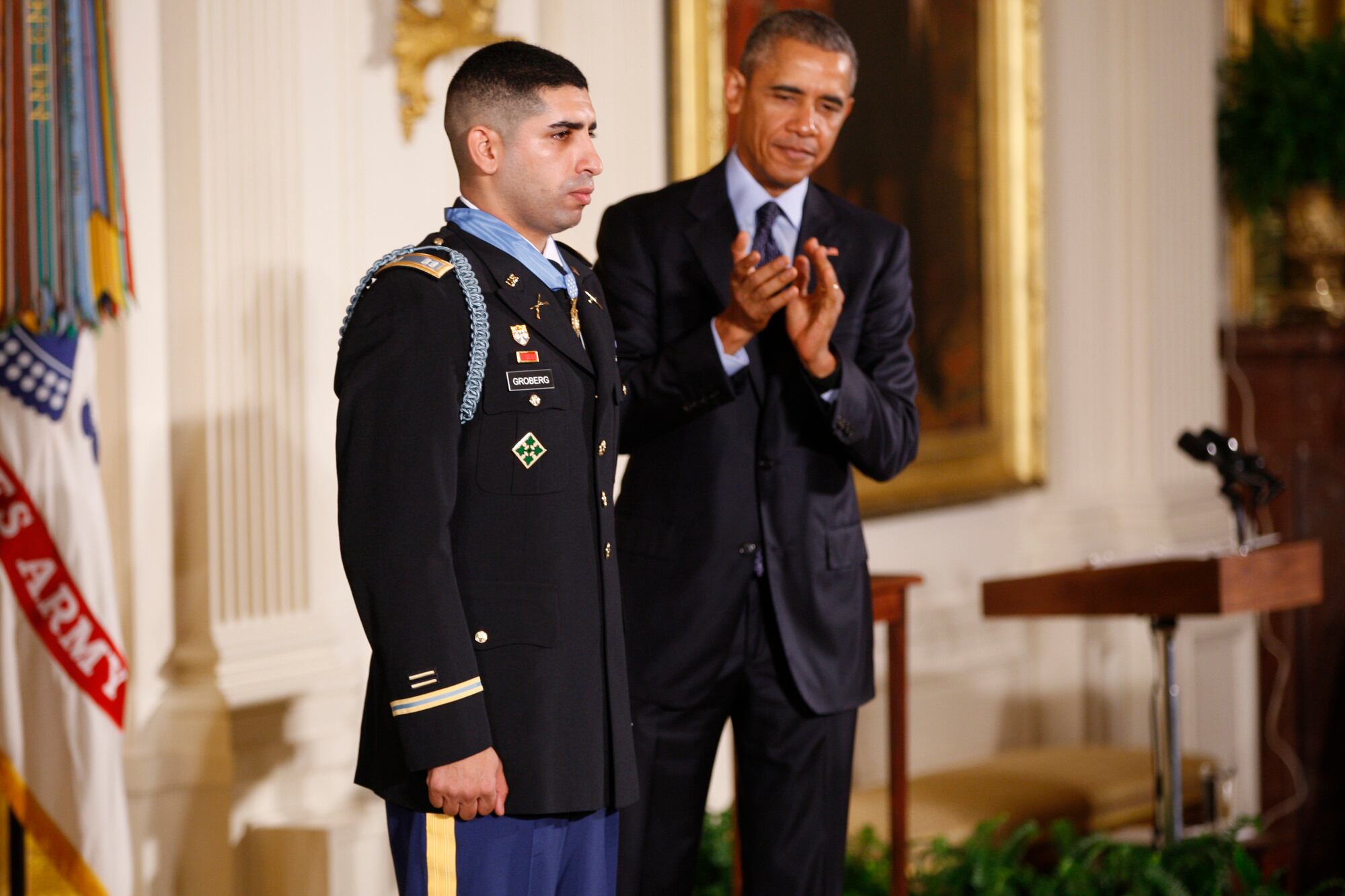 President Obama presents retired US Army Capt. Florent "Flo" Groberg with the Medal of Honor at the White House in Washington, D.C., on Thursday, November 12, 2015. Groberg earned the medal by tackling a suicide bomber in Afghanistan while serving with the 4th BCT, 4th Infantry Division on August 8, 2012. President Obama presents retired US Army Capt. Florent "Flo" Groberg with the Medal of Honor at the White House in Washington, D.C., on Thursday, November 12, 2015. Groberg earned the medal by tackling a suicide bomber in Afghanistan while serving with the 4th BCT, 4th Infantry Division on August 8, 2012. President Obama presents retired US Army Capt. Florent "Flo" Groberg with the Medal of Honor at the White House in Washington, D.C., on Thursday, November 12, 2015. Groberg earned the medal by tackling a suicide bomber in Afghanistan while serving with the 4th BCT, 4th Infantry Division on August 8, 2012. President Obama presents retired US Army Capt. Florent "Flo" Groberg with the Medal of Honor at the White House in Washington, D.C., on Thursday, November 12, 2015. Groberg earned the medal by tackling a suicide bomber in Afghanistan while serving with the 4th BCT, 4th Infantry Division on August 8, 2012. President Obama presents retired US Army Capt. Florent "Flo" Groberg with the Medal of Honor at the White House in Washington, D.C., on Thursday, November 12, 2015. Groberg earned the medal by tackling a suicide bomber in Afghanistan while serving with the 4th BCT, 4th Infantry Division on August 8, 2012.