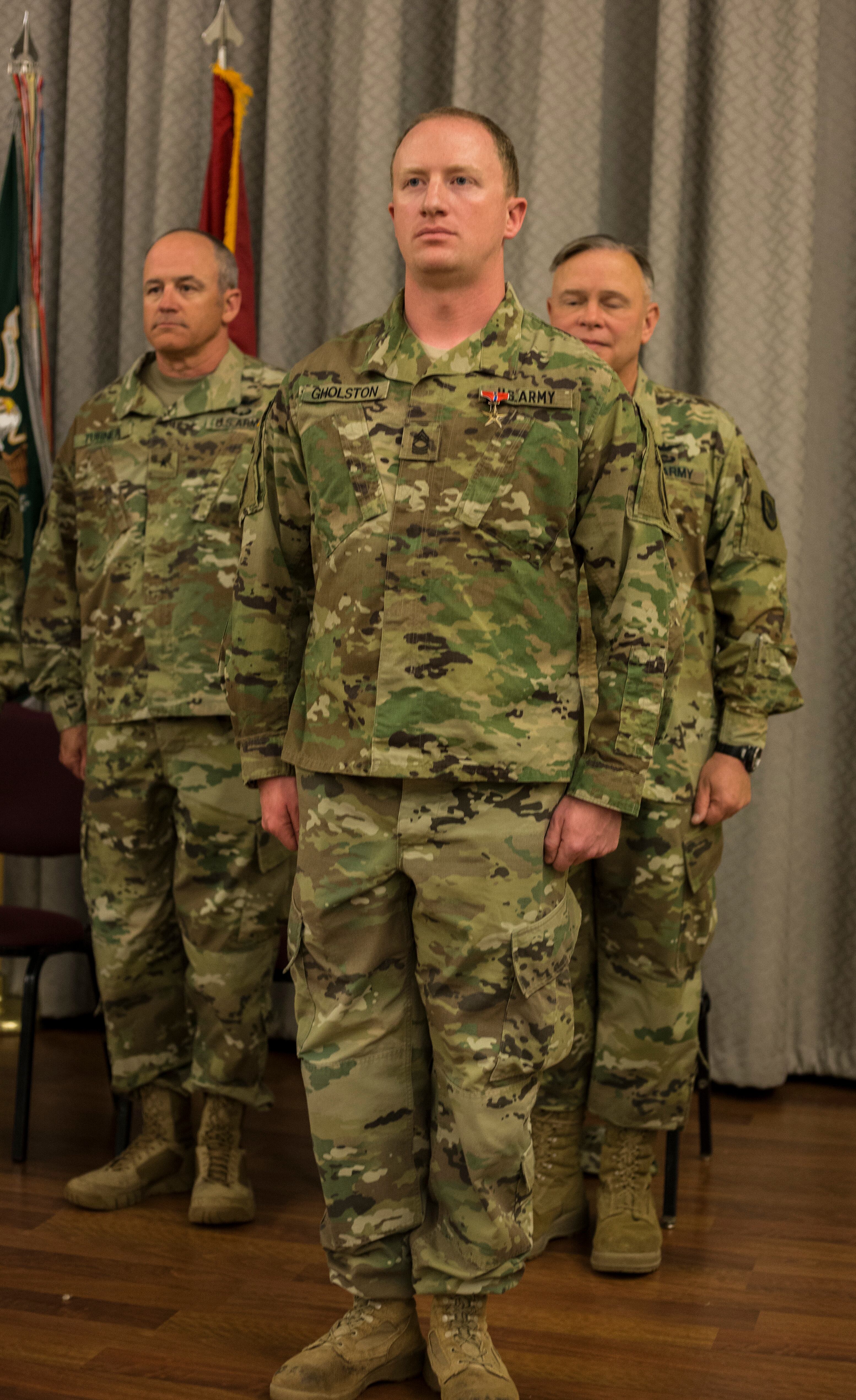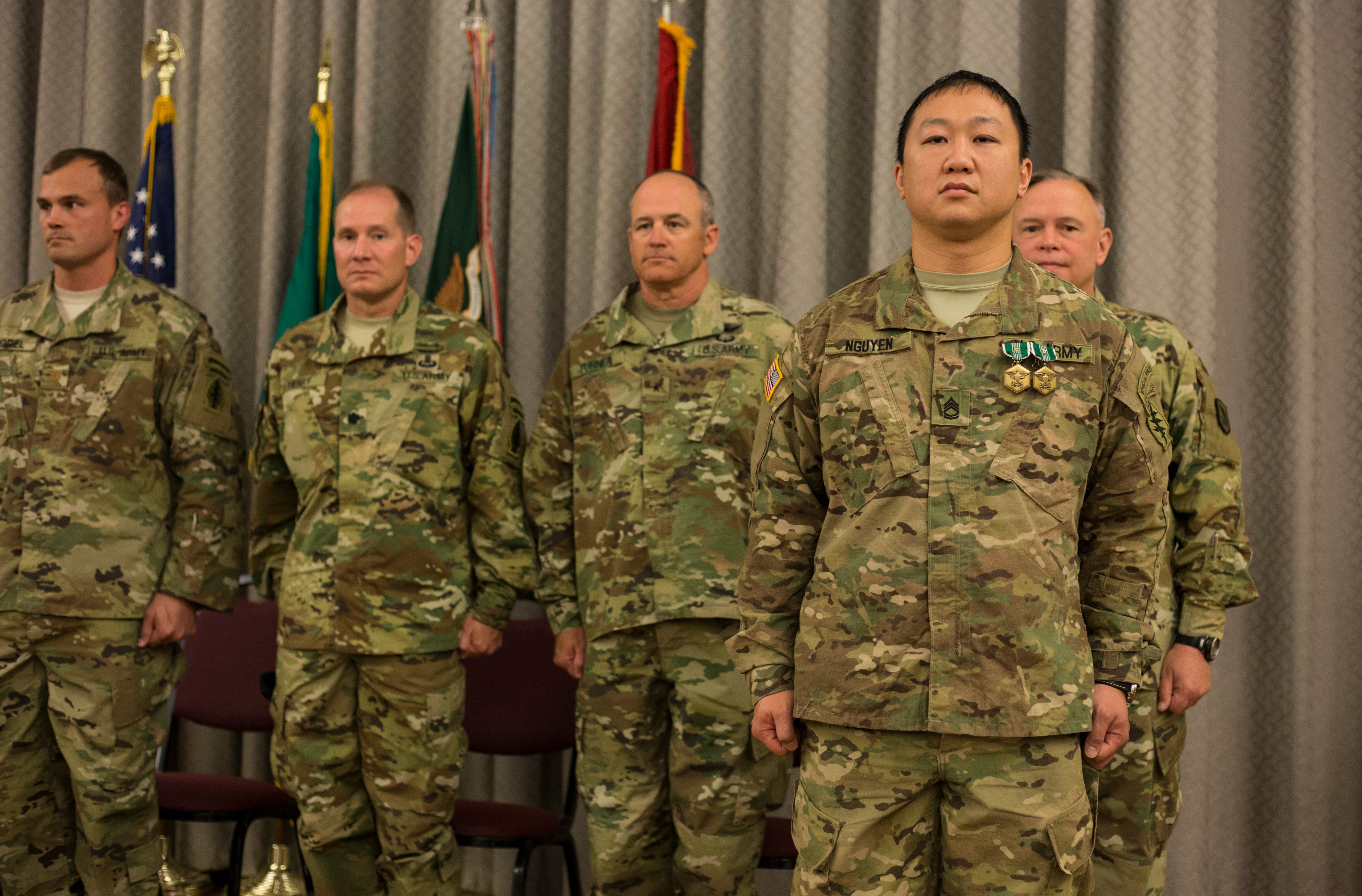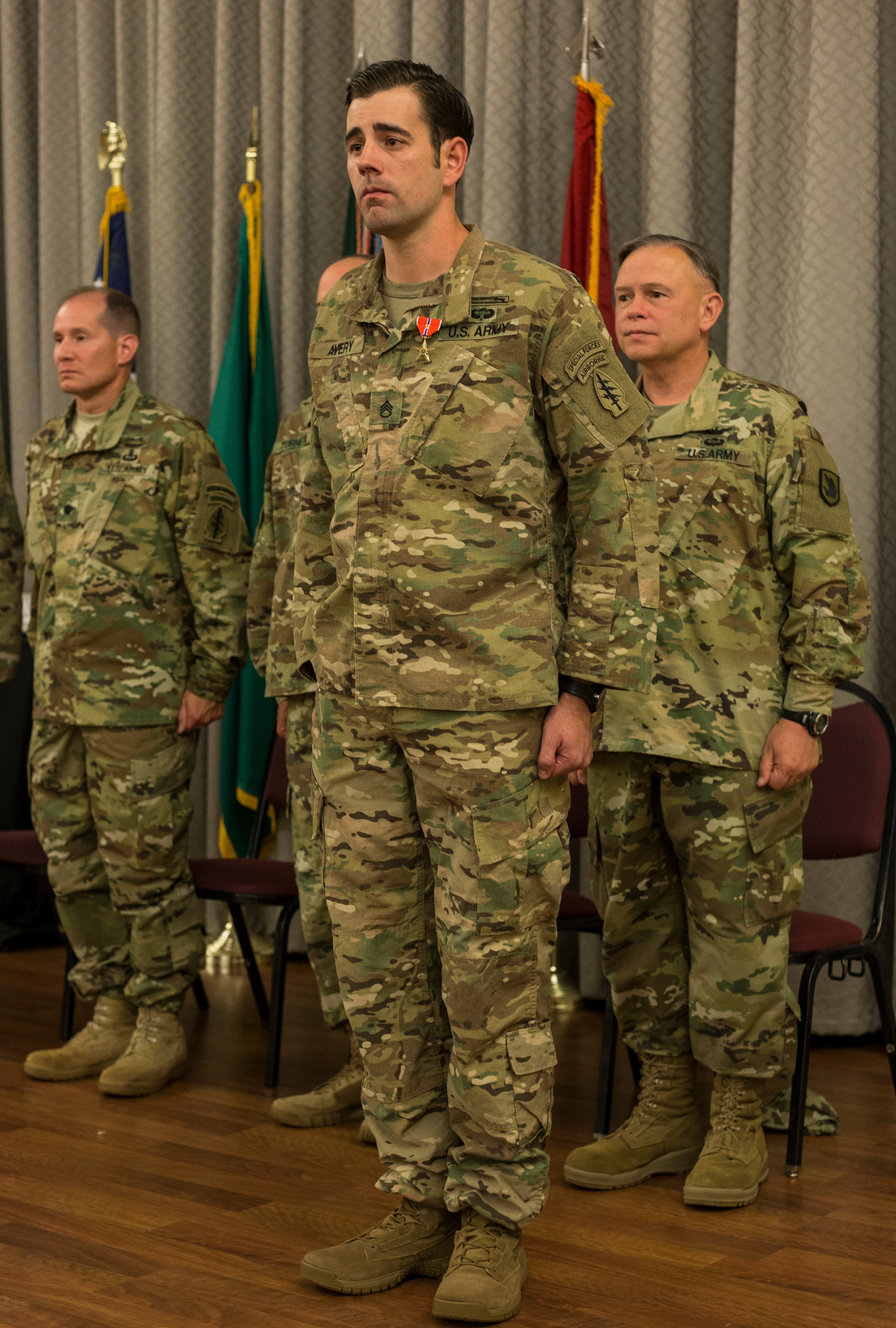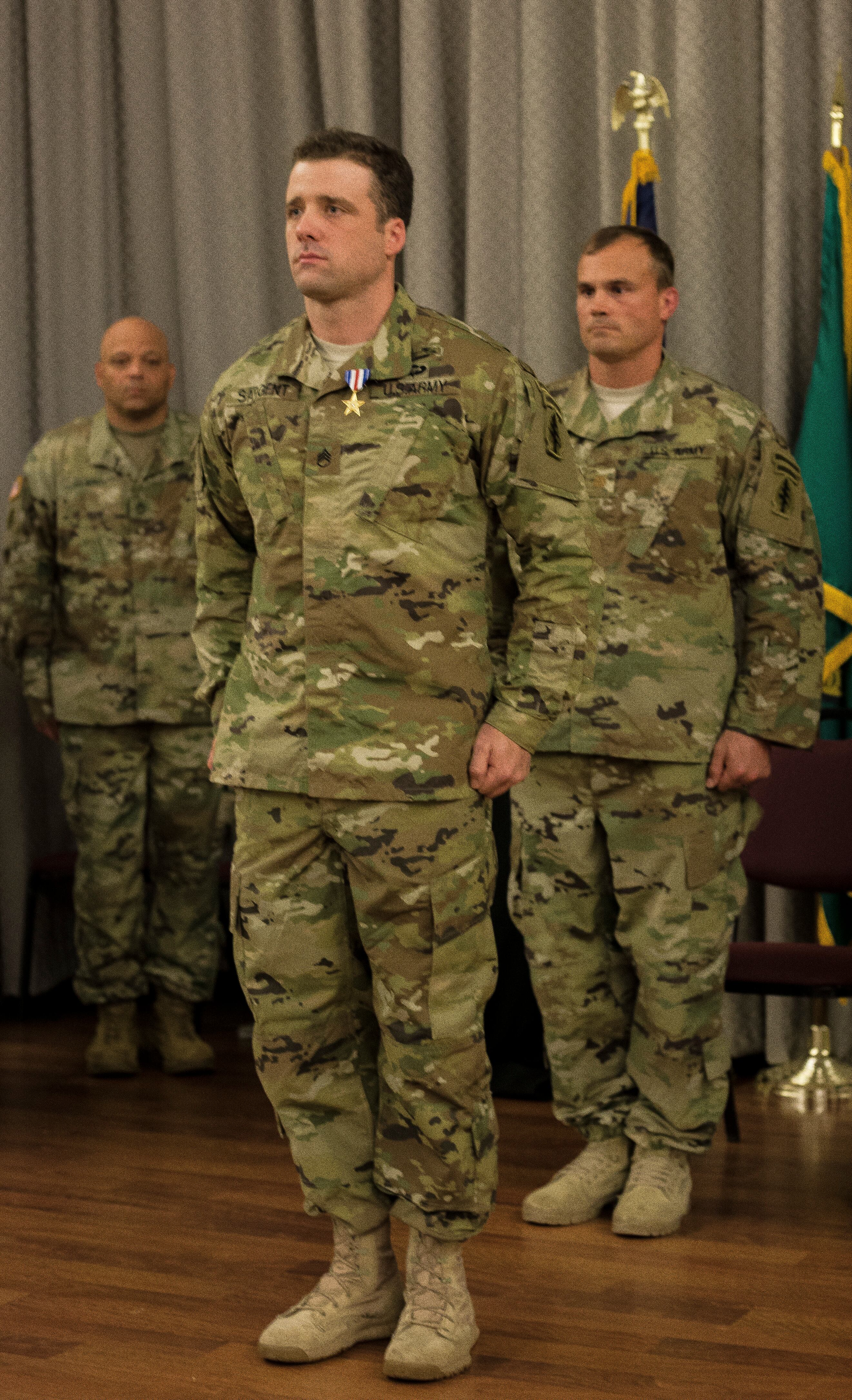 Staff Sgt. Michael Sargent, Alpha Company, 1st Battalion, 19th Special Forces Group, is recognized with the Silver Star Medal during an award ceremony on April 29, 2016 in Tacoma, Washington. Staff Sgt. Sargent distinguished himself by completely exposing himself without hesitation to extremely close enemy fire in order to secure a fallen Afghan commando and recover a fallen soldier to safety during combat action in Afghanistan on December 17, 2015. (U.S. Army National Guard photo by Sgt. 1st Class Jason Kriess)Staff Sgt. Michael Sargent, Alpha Company, 1st Battalion, 19th Special Forces Group, is recognized with the Silver Star Medal during an award ceremony on April 29, 2016 in Tacoma, Washington. Staff Sgt. Sargent distinguished himself by completely exposing himself without hesitation to extremely close enemy fire in order to secure a fallen Afghan commando and recover a fallen soldier to safety during combat action in Afghanistan on December 17, 2015. (U.S. Army National Guard photo by Sgt. 1st Class Jason Kriess)Master Sgt. Daniel Gholston, Alpha Company, 1st Battalion, 19th Special Forces Group, is recognized with the Bronze Star Medal with V device during an award ceremony on April 29, 2016 in Tacoma, Washington. Master Sgt. Gholston distinguished himself by completely exposing himself to enemy fire multiple times to aid in the evacuation of a critically wounded teammate during combat action in Helmand Province, Afghanistan on January 4, 2016. (U.S. Army National Guard photo by Sgt. 1st Class Jason Kriess)Staff Sgt. Jordan Avery, Alpha Company, 1st Battalion, 19th Special Forces Group, is recognized with the Bronze Star Medal with V device during an award ceremony on April 29, 2016 in Tacoma, Washington. Staff Sgt. Avery distinguished himself by completely exposing himself to enemy fire multiple times to aid in the evacuation of a critically wounded teammate during combat action in Helmand Province, Afghanistan on January 4, 2016. (U.S. Army National Guard photo by Sgt. 1st Class Jason Kriess)Capt. Andrew MacNeil , Alpha Company, 1st Battalion, 19th Special Forces Group, is recognized with the Army Commendation Medal with V device during an award ceremony on April 29, 2016 in Tacoma, Washington. Capt. MacNeil distinguished himself heroically during combat action in Helmand Province, Afghanistan on January 4, 2016 by completely exposing himself to enemy fire multiple times to aid in the evacuation of a critically wounded teammate. (U.S. Army National Guard photo by Sgt. 1st Class Jason Kriess)Sgt. 1st Class Tu Nguyen, Alpha Company, 1st Battalion, 19th Special Forces Group, is recognized with two Army Commendation Medals with V device during an award ceremony on April 29, 2016 in Tacoma, Washington. Sgt. 1st Class Nguyen distinguished himself heroically during two separate combat actions in Helmand Province, Afghanistan by exposing himself to enemy direct and indirect fire to render life-saving medical aid to wounded soldiers and evacuating casualties under fire. (U.S. Army National Guard photo by Sgt. 1st Class Jason Kriess)Staff Sgt. Matthew Carey, Alpha Company, 1st Battalion, 19th Special Forces Group, is recognized with the Army Commendation Medal with V device during an award ceremony on April 29, 2016 in Tacoma, Washington. Staff Sgt. Carey distinguished himself heroically during combat action in Helmand Province, Afghanistan on January 4, 2016 by exposing himself to enemy direct and indirect fire to render life-saving medical aid to six wounded soldiers and evacuating casualties under fire. (U.S. Army National Guard photo by Sgt. 1st Class Jason Kriess)