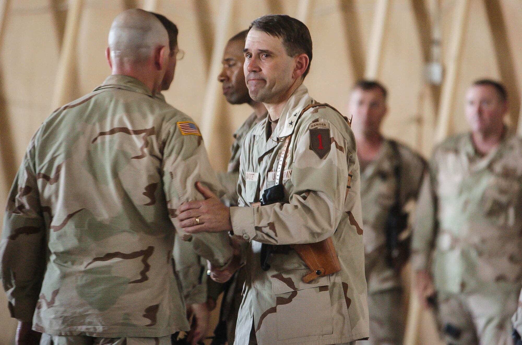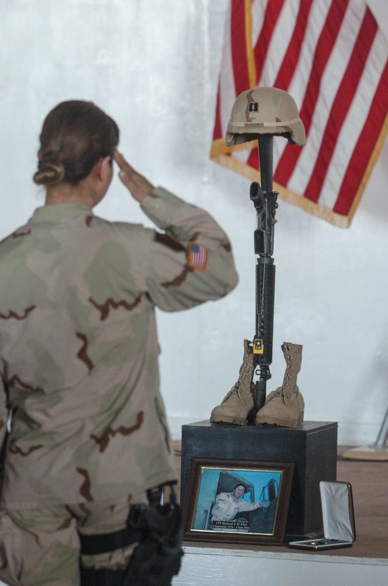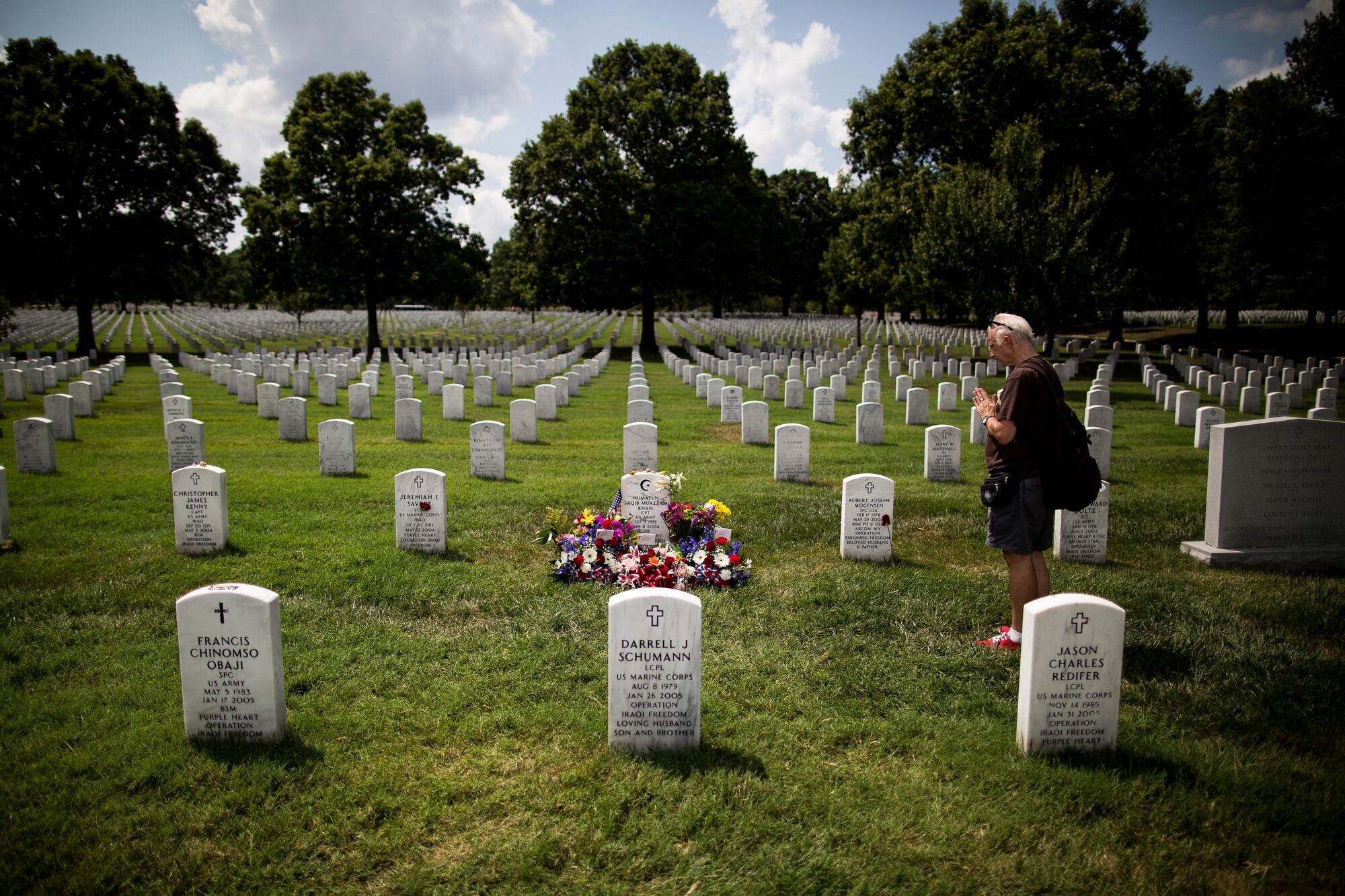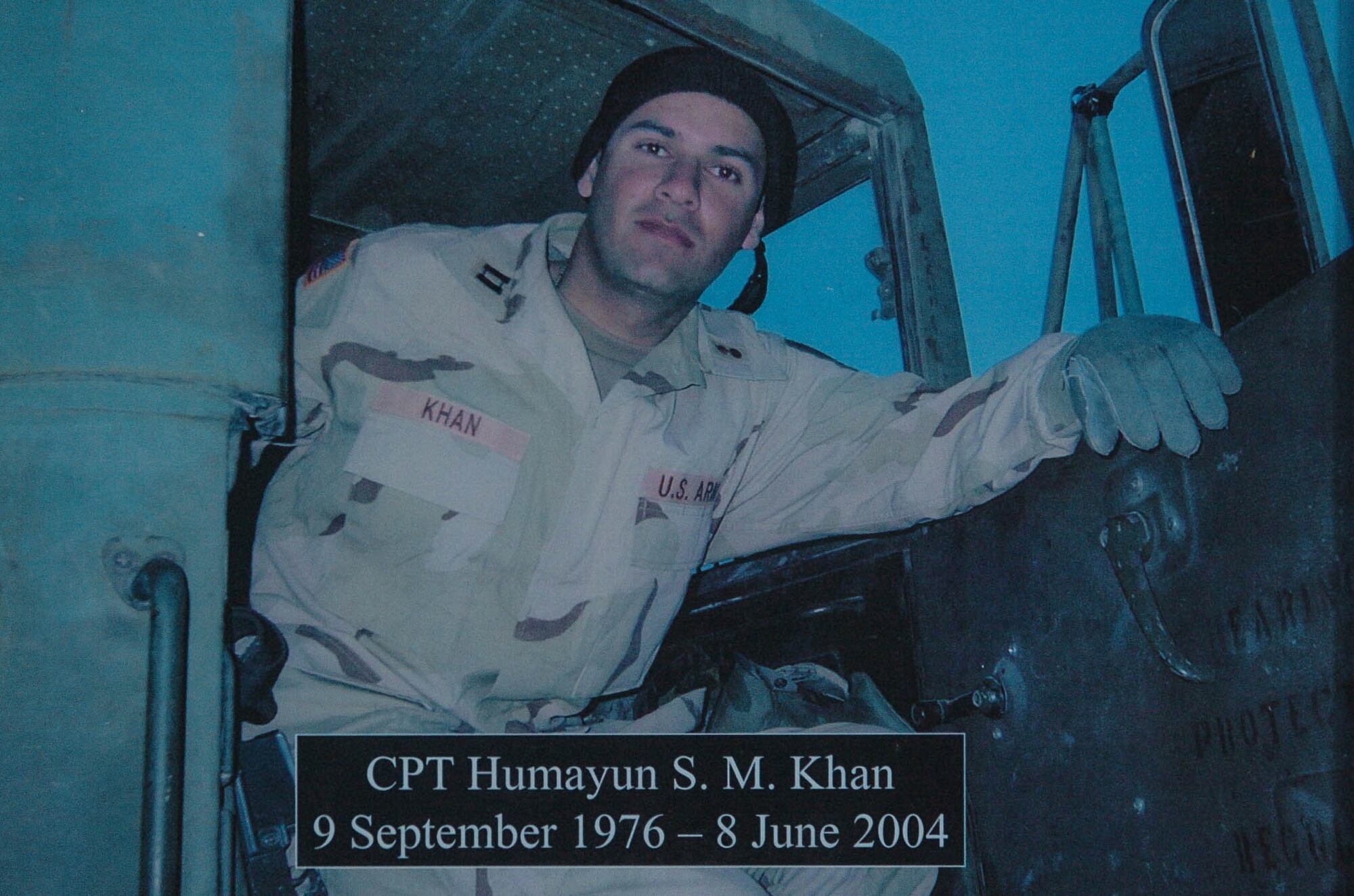 Memorial service for Captain Humayun S.M. Khan, of the 1st Infantry Division, June 11, 2004 at FOB Warhorse near Baquba, Iraq. Khan was killed in action June 8, 2004. (M. Scott Mahaskey/ Army Times)Memorial service for Captain Humayun S.M. Khan, of the 1st Infantry Division, June 11, 2004 at FOB Warhorse near Baquba, Iraq. Khan was killed in action June 8, 2004. (M. Scott Mahaskey/ Army Times)Major General John Batiste, now retired, offers his condolences to soldiers at a memorial service for Captain Humayun S.M. Khan, of the 1st Infantry Division, June 11, 2004 at FOB Warhorse near Baquba, Iraq. Khan was killed in action June 8, 2004. (M. Scott Mahaskey/ Army Times)Memorial service for Captain Humayun S.M. Khan, of the 1st Infantry Division, June 11, 2004 at FOB Warhorse near Baquba, Iraq. Khan was killed in action June 8, 2004. (M. Scott Mahaskey/ Army Times)Capt. Khan gravesite in Arlington's Section 60 shown August 2, 2016 in Arlington, VA. (M. Scott Mahaskey/Politico)Capt. Khan gravesite in Arlington's Section 60 shown August 2, 2016 in Arlington, VA. (M. Scott Mahaskey/Politico)