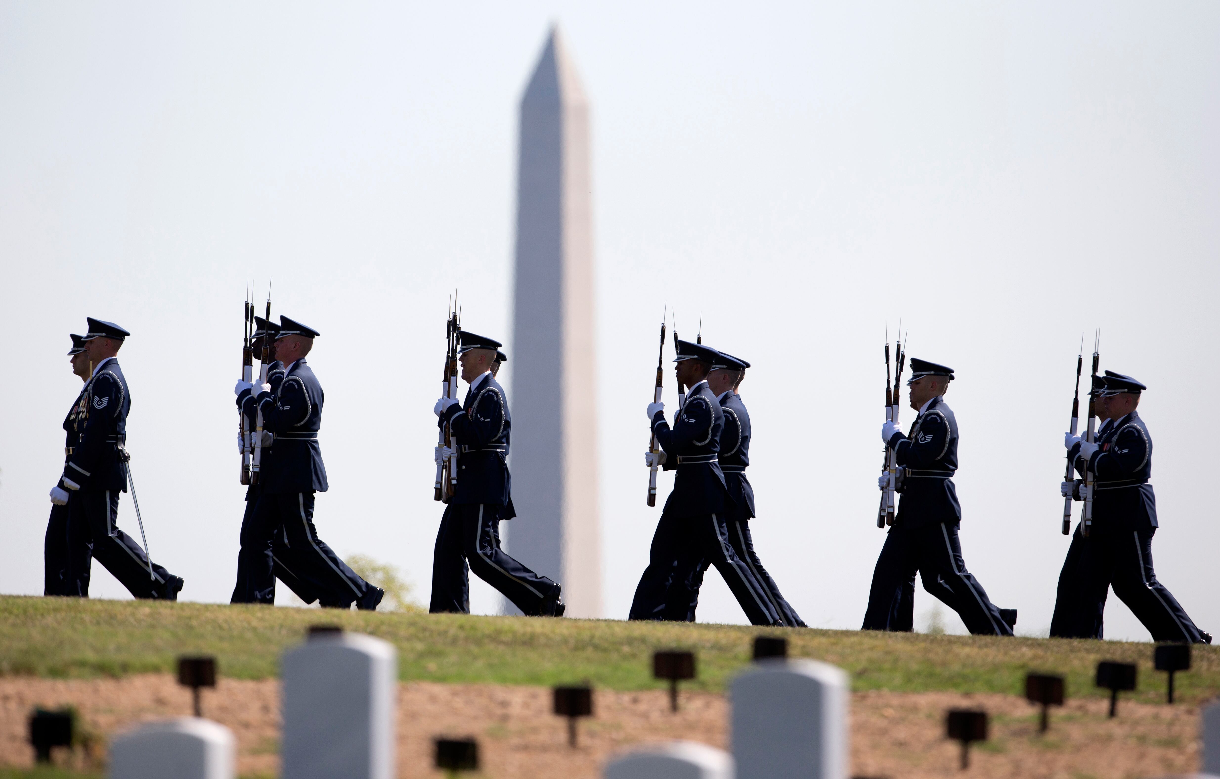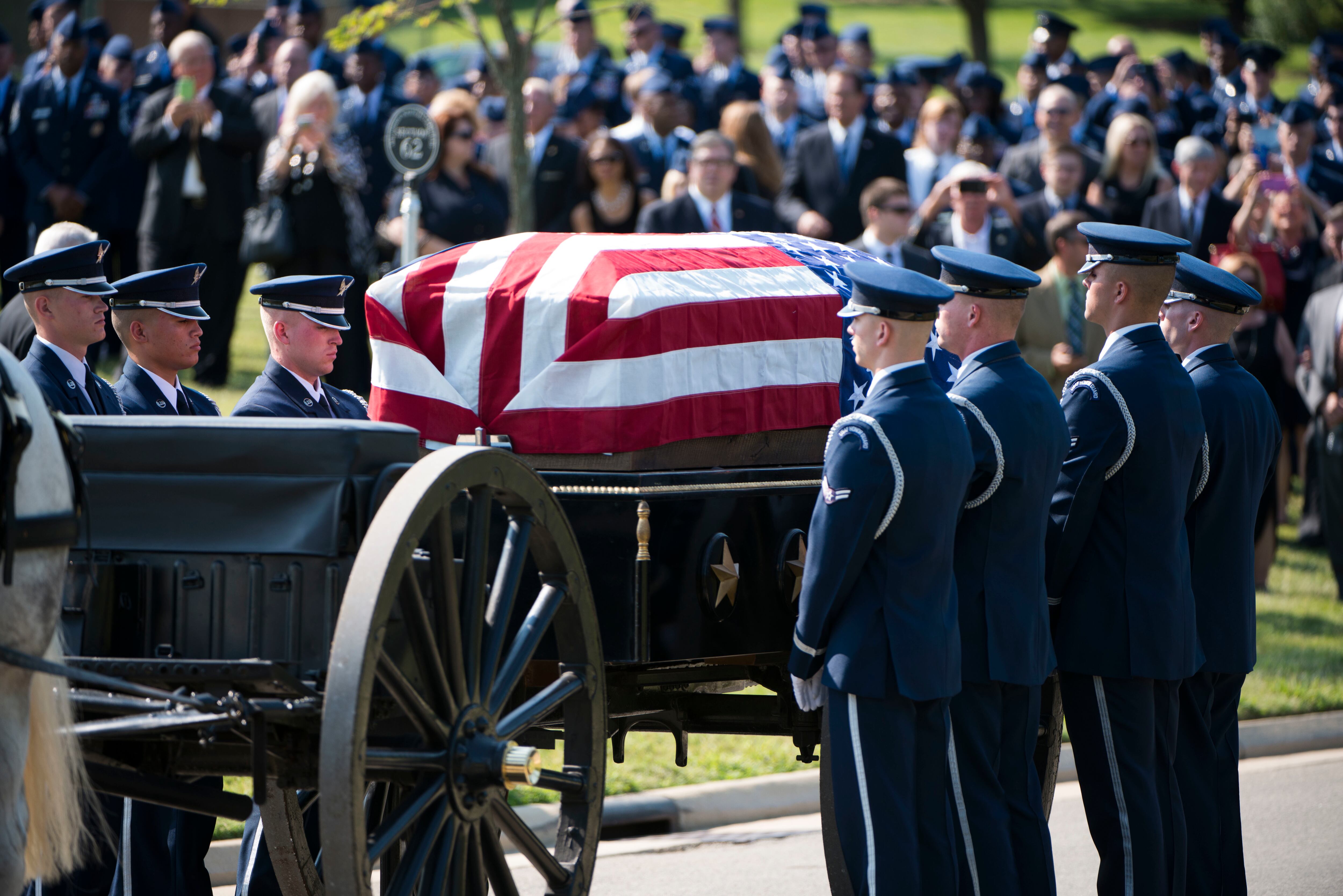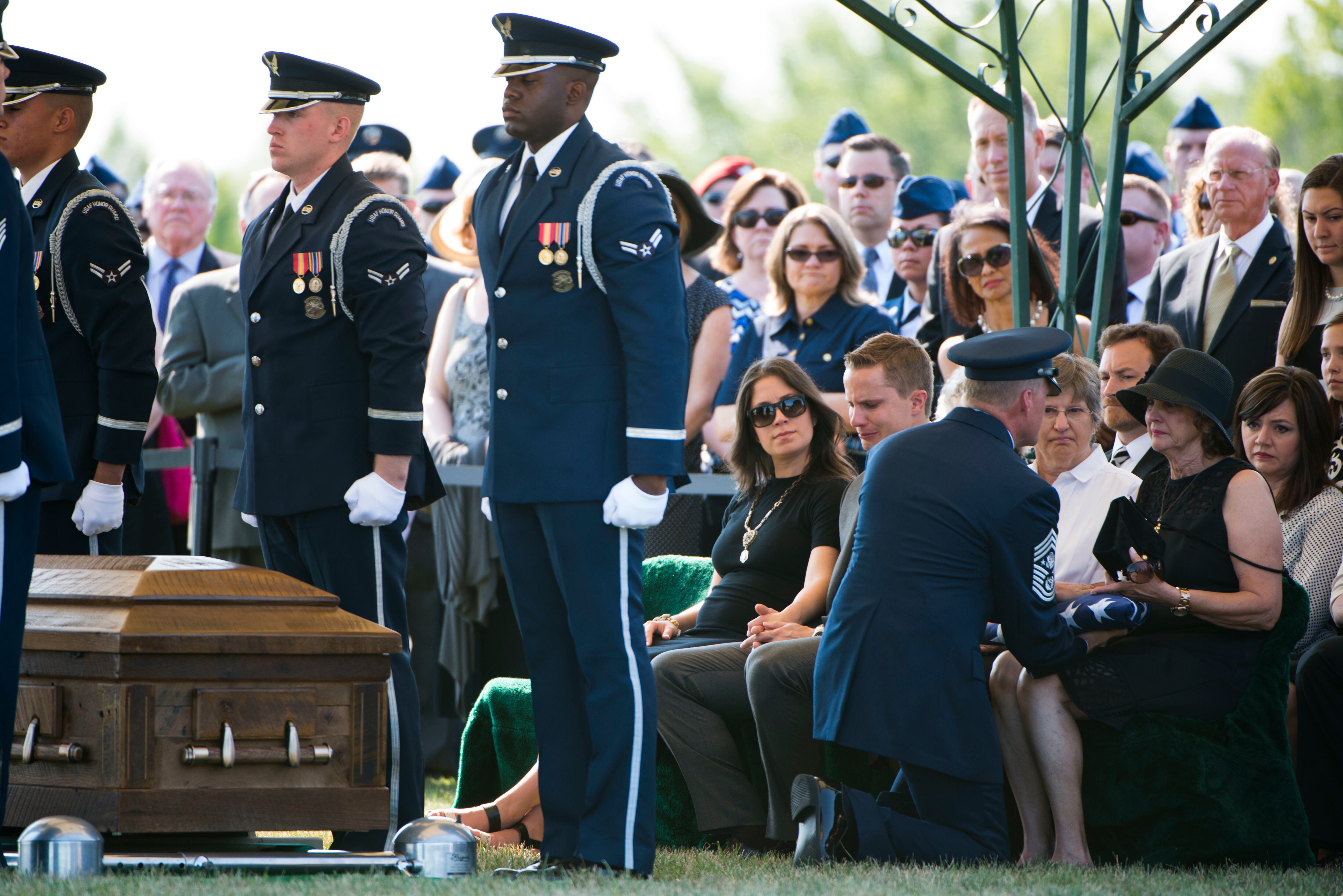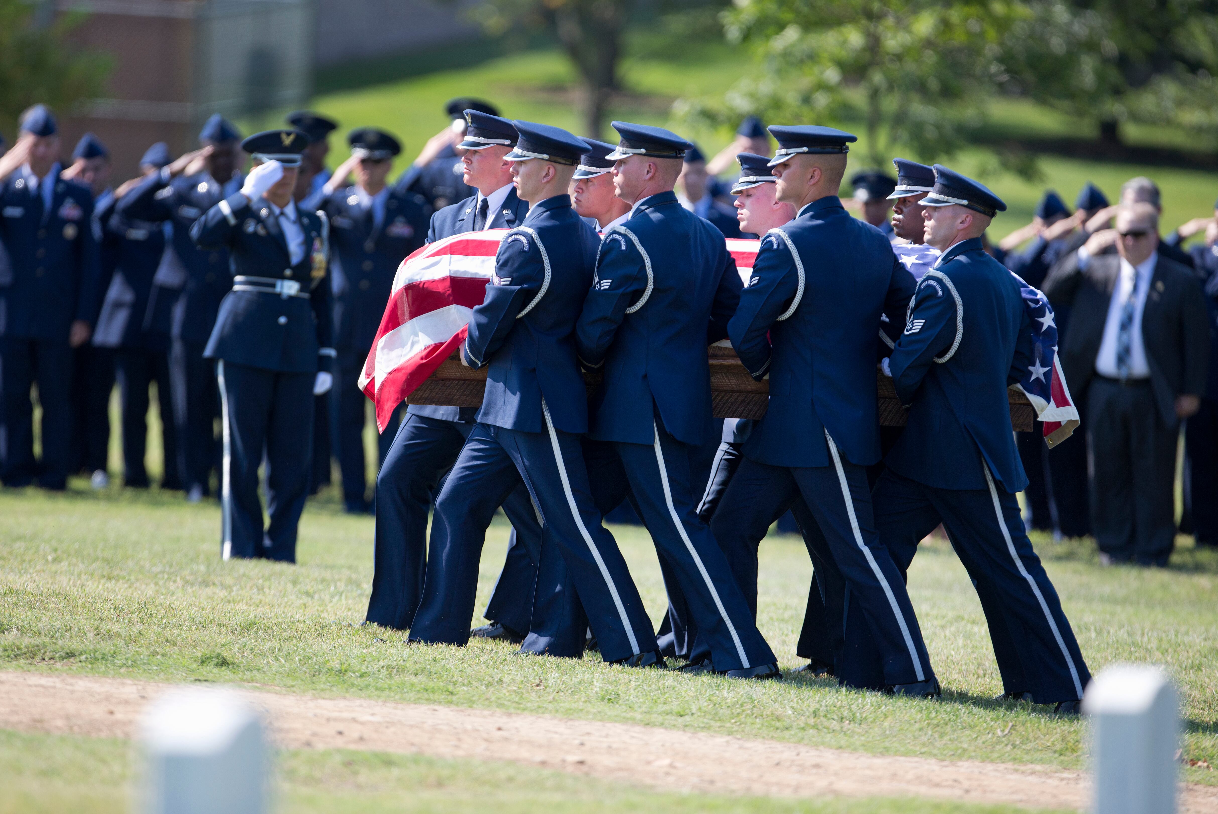 With the Washington Monument in the background, members of the U.S. Air Force Honor Guard walk at the conclusion of burial services for retired Air Force Chief Master Sgt. James C. Binnicker at Arlington National Cemetery in Arlington, Va., Friday, Aug. 14, 2015. Binnicker was the 9th chief master sergeant of the Air Force from 1986-1990. (AP Photo/Carolyn Kaster)Members of the U.S. Army Caisson Platoon, 3d U.S. Infantry Regiment (The Old Guard) and the U.S. Air Force Honor Guard approach Section 62 of Arlington National Cemetery during the graveside service for ninth Chief Master Sgt. Of the Air Force James C. Binnicker, Aug. 14, 2015, in Arlington, Va. Binnicker served in the Air Force for 33 years and retired Aug. 1, 1990, according to a U.S. Air Force press release. (U.S. Army photo by Rachel Larue/released)Members of the U.S. Air Force Honor Guard carry the flag-draped casket during a burial service for retired Air Force Chief Master Sgt. James C. Binnicker at Arlington National Cemetery in Arlington, Va., Friday, Aug. 14, 2015. Binnicker was the 9th chief master sergeant of the Air Force from 1986-1990. (AP Photo/Carolyn Kaster)Janice Binnicker, widow of retired Air Force Chief Master Sgt. James C. Binnicker, is presented with the flag from her husband's casket by Air Force Chief Master Sgt. James Cody during burial services at Arlington National Cemetery in Arlington, Va., Friday, Aug. 14, 2015. Binnicker was the 9th chief master sergeant of the Air Force from 1986-1990. (AP Photo/Carolyn Kaster)A B-52 performs a flyover during the graveside service for ninth Chief Master Sgt. Of the Air Force James C. Binnicker Aug. 14, 2015, at Arlington National Cemetery, in Arlington, Va. Binnicker served in the Air Force for 33 years and retired Aug. 1, 1990, according to a U.S. Air Force press release. (U.S. Army photo by Rachel Larue/released)Members of the U.S. Air Force Honor Guard take part in the graveside service, while family and mourners watch, for ninth Chief Master Sgt. of the Air Force James C. Binnicker, Aug. 14, 2015, at Arlington National Cemetery, in Arlington, Va. Binnicker served in the Air Force for 33 years and retired Aug. 1, 1990, according to a U.S. Air Force press release. (U.S. Army photo by Rachel Larue/released)A member of the U.S. Air Force Band plays Taps during the graveside service for ninth Chief Master Sgt. of the Air Force James C. Binnicker, Aug. 14, 2015, at Arlington National Cemetery, in Arlington, Va. Binnicker served in the Air Force for 33 years and retired Aug. 1, 1990, according to a U.S. Air Force press release. (U.S. Army photo by Rachel Larue/released)Janice Binnicker receives the American flag from Chief Master Sgt. of the Air Force James A. Cody during the graveside service for her husband, ninth Chief Master Sgt. of the Air Force James C. Binnicker, in Arlington National Cemetery, Aug. 14, 2015. Binnicker served in the Air Force for 33 years and retired Aug. 1, 1990, according to a U.S. Air Force press release. (U.S. Army photo by Rachel Larue/released)Bagpiper U.S. Air Force Tech. Sgt. Adam Tianello plays "Amazing Grace" during the graveside service for ninth Chief Master Sgt. of the Air Force James C. Binnicker, Aug. 14, 2015, at Arlington National Cemetery, in Arlington, Va. Binnicker served in the Air Force for 33 years and retired Aug. 1, 1990, according to a U.S. Air Force press release. (U.S. Army photo by Rachel Larue/released)With the Washington Monument in the background, members of the U.S. Air Force Honor Guard participate in a burial service for retired Air Force Chief Master Sgt. James C. Binnicker at Arlington National Cemetery in Arlington, Va., Friday, Aug. 14, 2015. Binnicker was the 9th chief master sergeant of the Air Force from 1986-1990. (AP Photo/Carolyn Kaster)