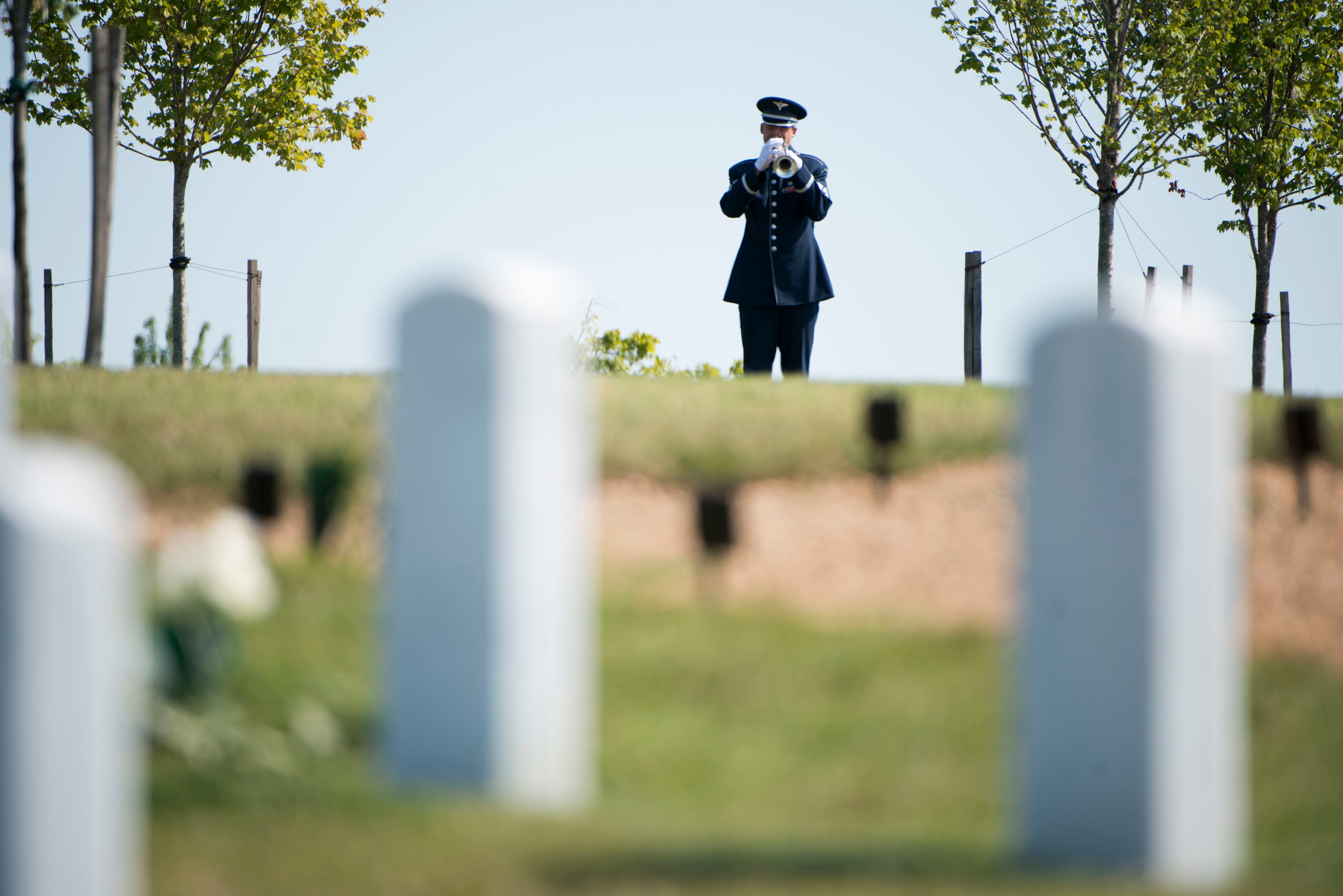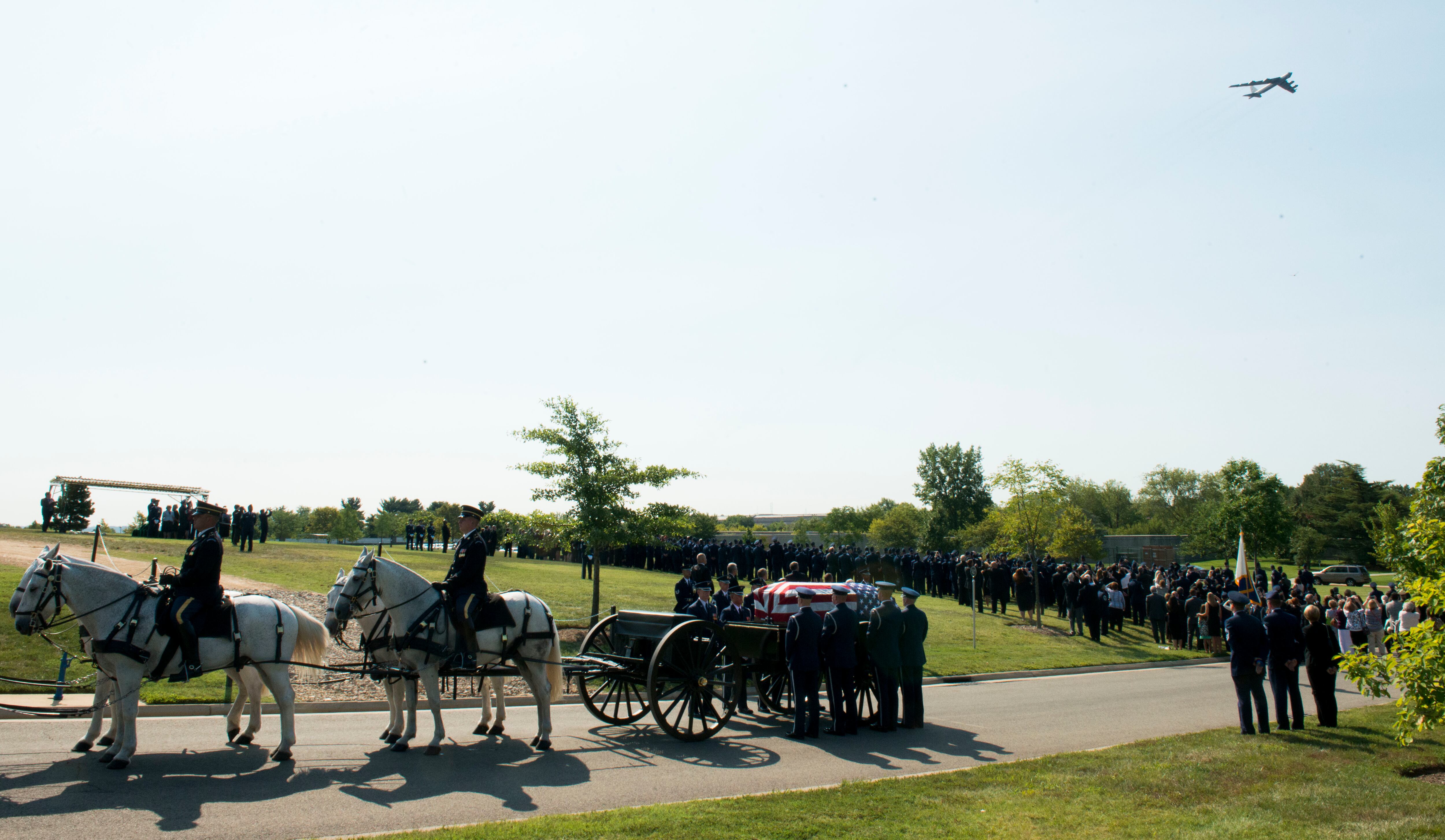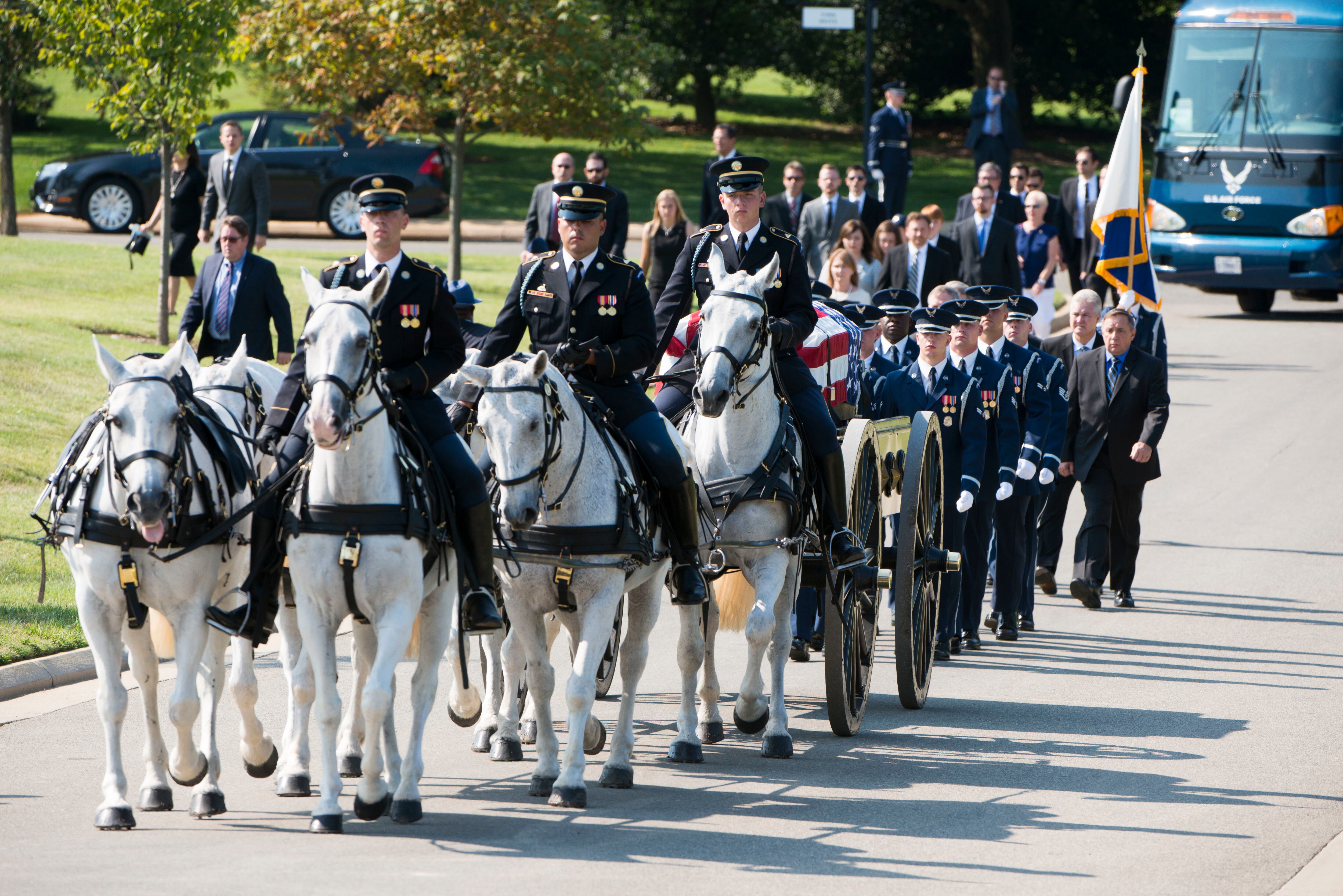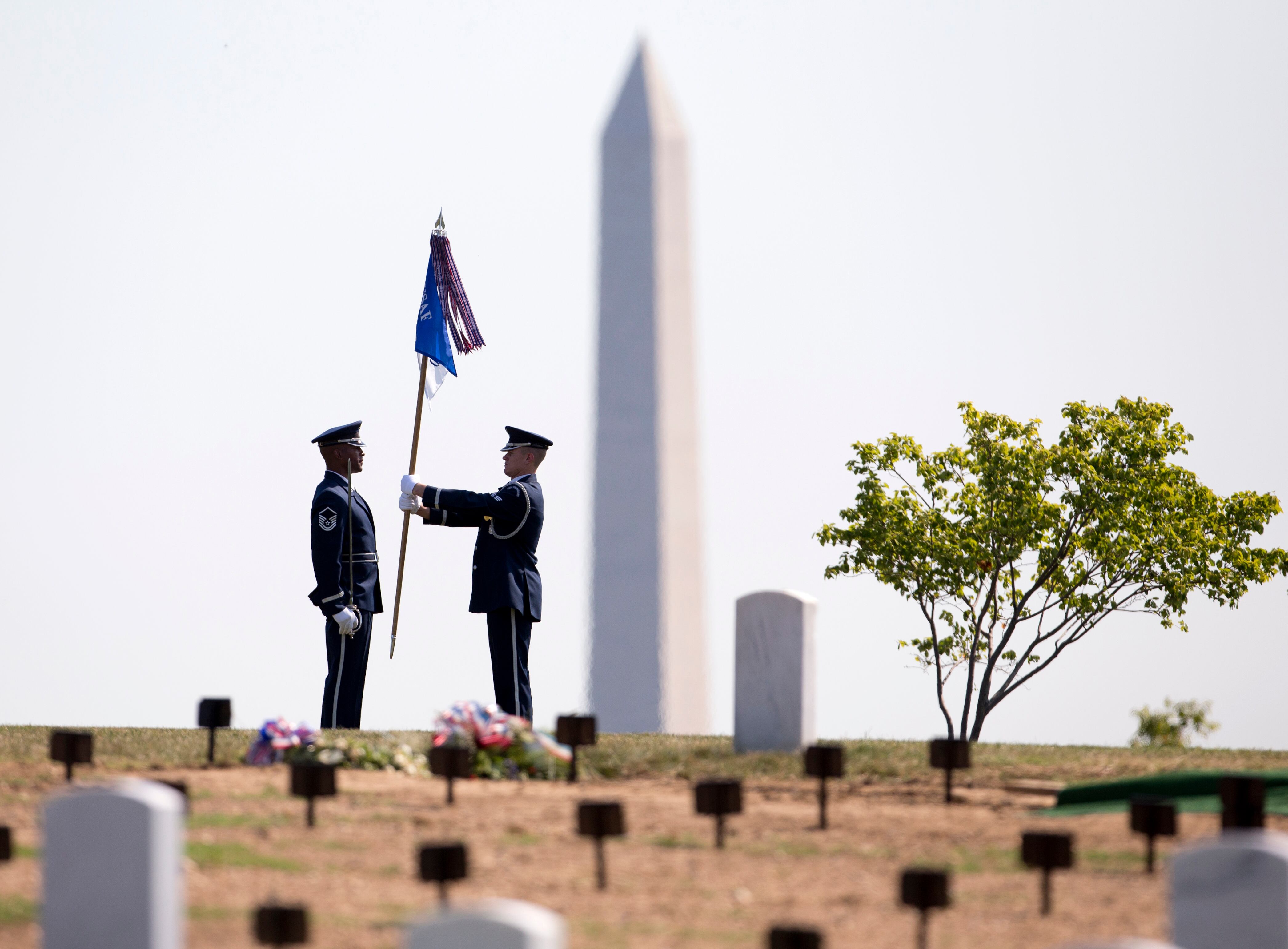 With the Washington Monument in the background, members of the U.S. Air Force Honor Guard walk at the conclusion of burial services for retired Air Force Chief Master Sgt. James C. Binnicker at Arlington National Cemetery in Arlington, Va., Friday, Aug. 14, 2015. Binnicker was the 9th chief master sergeant of the Air Force from 1986-1990. (AP Photo/Carolyn Kaster)Members of the U.S. Army Caisson Platoon, 3d U.S. Infantry Regiment (The Old Guard) and the U.S. Air Force Honor Guard approach Section 62 of Arlington National Cemetery during the graveside service for ninth Chief Master Sgt. Of the Air Force James C. Binnicker, Aug. 14, 2015, in Arlington, Va. Binnicker served in the Air Force for 33 years and retired Aug. 1, 1990, according to a U.S. Air Force press release. (U.S. Army photo by Rachel Larue/released)Members of the U.S. Air Force Honor Guard carry the flag-draped casket during a burial service for retired Air Force Chief Master Sgt. James C. Binnicker at Arlington National Cemetery in Arlington, Va., Friday, Aug. 14, 2015. Binnicker was the 9th chief master sergeant of the Air Force from 1986-1990. (AP Photo/Carolyn Kaster)Janice Binnicker, widow of retired Air Force Chief Master Sgt. James C. Binnicker, is presented with the flag from her husband's casket by Air Force Chief Master Sgt. James Cody during burial services at Arlington National Cemetery in Arlington, Va., Friday, Aug. 14, 2015. Binnicker was the 9th chief master sergeant of the Air Force from 1986-1990. (AP Photo/Carolyn Kaster)A B-52 performs a flyover during the graveside service for ninth Chief Master Sgt. Of the Air Force James C. Binnicker Aug. 14, 2015, at Arlington National Cemetery, in Arlington, Va. Binnicker served in the Air Force for 33 years and retired Aug. 1, 1990, according to a U.S. Air Force press release. (U.S. Army photo by Rachel Larue/released)Members of the U.S. Air Force Honor Guard take part in the graveside service, while family and mourners watch, for ninth Chief Master Sgt. of the Air Force James C. Binnicker, Aug. 14, 2015, at Arlington National Cemetery, in Arlington, Va. Binnicker served in the Air Force for 33 years and retired Aug. 1, 1990, according to a U.S. Air Force press release. (U.S. Army photo by Rachel Larue/released)A member of the U.S. Air Force Band plays Taps during the graveside service for ninth Chief Master Sgt. of the Air Force James C. Binnicker, Aug. 14, 2015, at Arlington National Cemetery, in Arlington, Va. Binnicker served in the Air Force for 33 years and retired Aug. 1, 1990, according to a U.S. Air Force press release. (U.S. Army photo by Rachel Larue/released)Janice Binnicker receives the American flag from Chief Master Sgt. of the Air Force James A. Cody during the graveside service for her husband, ninth Chief Master Sgt. of the Air Force James C. Binnicker, in Arlington National Cemetery, Aug. 14, 2015. Binnicker served in the Air Force for 33 years and retired Aug. 1, 1990, according to a U.S. Air Force press release. (U.S. Army photo by Rachel Larue/released)Bagpiper U.S. Air Force Tech. Sgt. Adam Tianello plays "Amazing Grace" during the graveside service for ninth Chief Master Sgt. of the Air Force James C. Binnicker, Aug. 14, 2015, at Arlington National Cemetery, in Arlington, Va. Binnicker served in the Air Force for 33 years and retired Aug. 1, 1990, according to a U.S. Air Force press release. (U.S. Army photo by Rachel Larue/released)With the Washington Monument in the background, members of the U.S. Air Force Honor Guard participate in a burial service for retired Air Force Chief Master Sgt. James C. Binnicker at Arlington National Cemetery in Arlington, Va., Friday, Aug. 14, 2015. Binnicker was the 9th chief master sergeant of the Air Force from 1986-1990. (AP Photo/Carolyn Kaster)