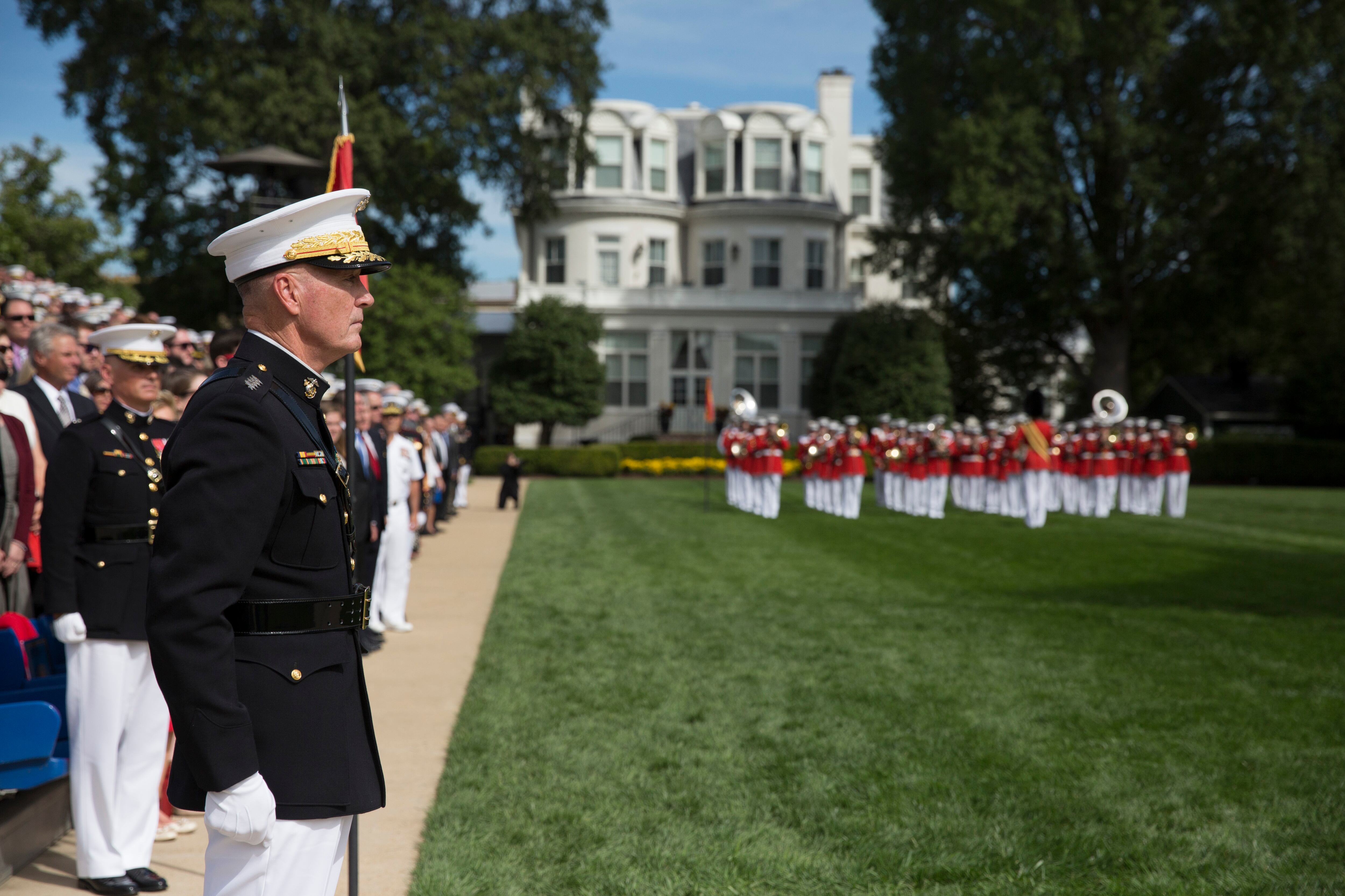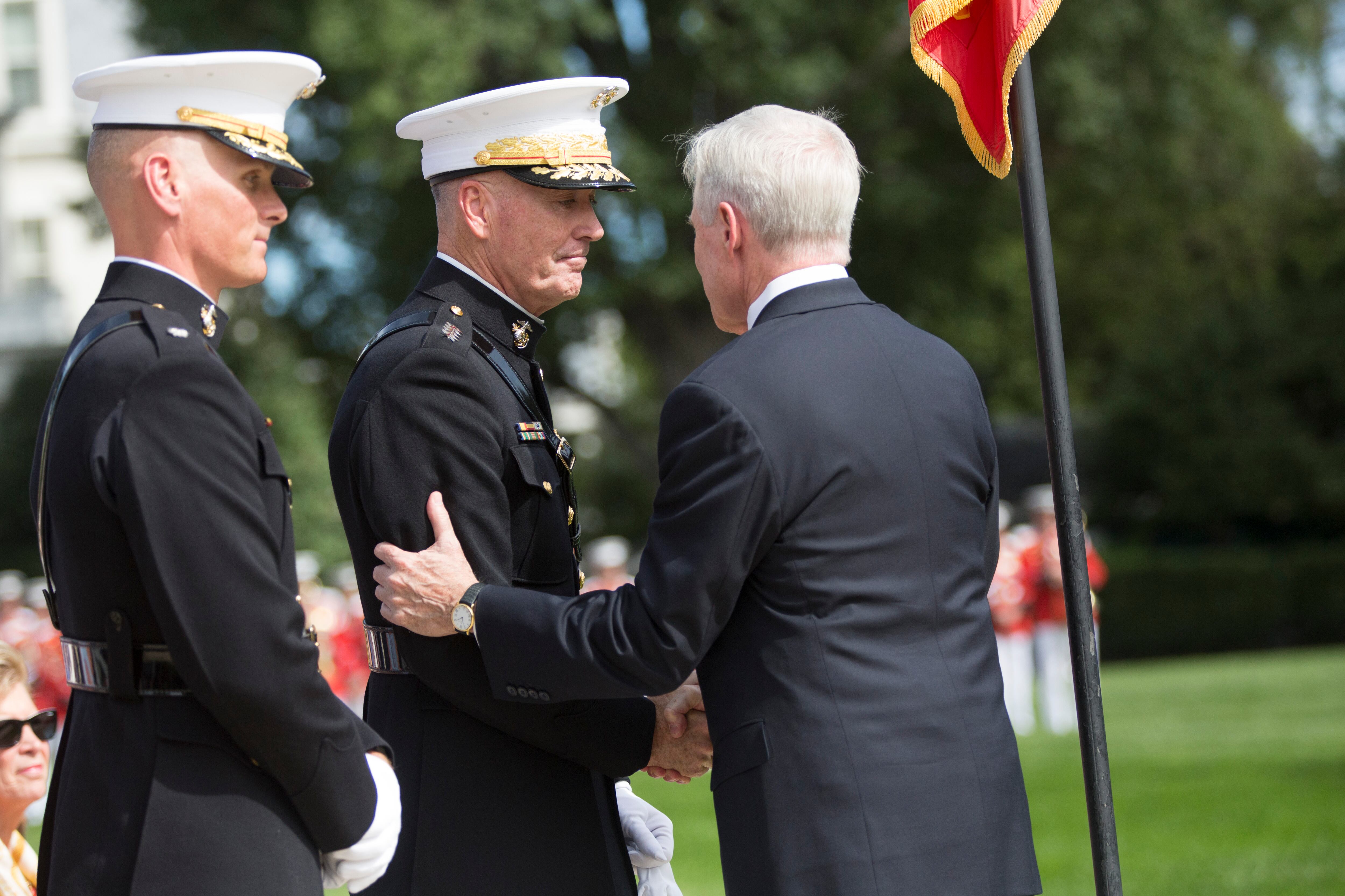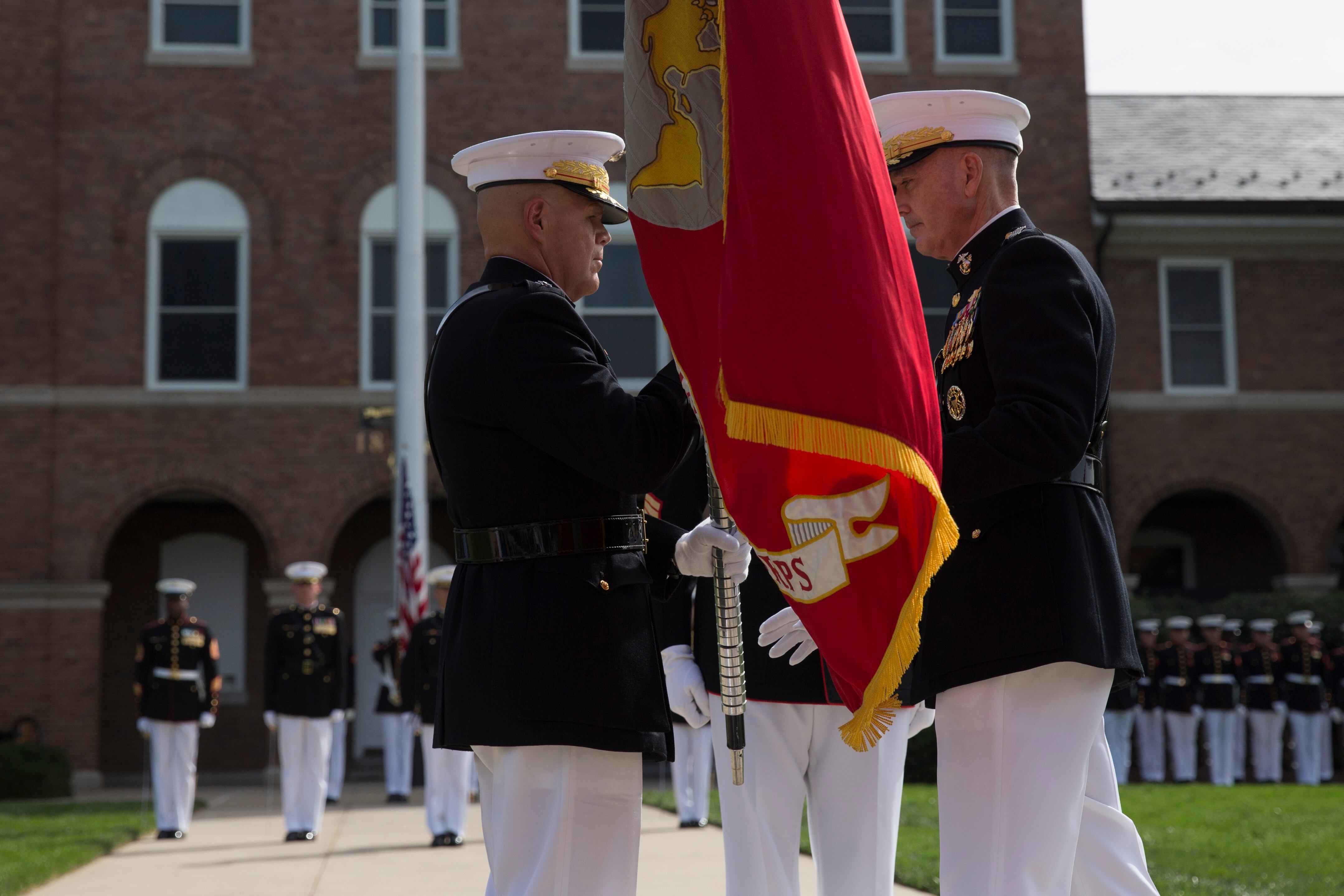 Marine Commandant Gen. Joseph Dunford Jr., the 36th commandant of the Marine Corps (right) transfers the battle colors to Gen. Gen. Robert Neller as Sergeant Major of the Marine Corps Ronald Green at the Commandant's change of command at Marine Corps Barracks Washington, Sept. 24, 2015. (Daniel Woolfolk/ Marine Corps Times)Gen. Joseph Dunford at the Commandant's change of command at Marine Corps Barracks Washington, Sept. 24, 2015. He transferred command to Gen. Robert Neller and will become the Chairman of the Joints Chief of Staff. (Daniel Woolfolk/ Marine Corps Times)Marine Commandant Gen. Joseph Dunford Jr., the 36th commandant of the Marine Corps (right) transfers the battle colors to Gen. Gen. Robert Neller at the Commandant's change of command at Marine Corps Barracks Washington, Sept. 24, 2015. (Daniel Woolfolk/ Marine Corps Times)Gen. Mark A. Welsh III , Chief of Staff of the U.S. Air Force, (center) attended the Commandant's change of command at Marine Corps Barracks Washington, Sept. 24, 2015. (Daniel Woolfolk/ Marine Corps Times)Ellyn Dunford, wife of Gen. Joseph Dunford, received a Distinguished Public Service Award from Navy Secretary Ray Mabus at Marine Corps Barracks Washington, Sept. 24, 2015 for her efforts in helping Marines. (Daniel Woolfolk/ Marine Corps Times)"The Commandant's Own" United States Marine Drum & Bugle Corps played Commandant's change of command at Marine Corps Barracks Washington, Sept. 24, 2015. (Daniel Woolfolk/ Marine Corps Times)Marines take part in the Commandant's change of command at Marine Corps Barracks Washington, Sept. 24, 2015. (Daniel Woolfolk/ Marine Corps Times)"The Commandant's Own" United States Marine Drum & Bugle Corps played Commandant's change of command at Marine Corps Barracks Washington, Sept. 24, 2015. (Daniel Woolfolk/ Marine Corps Times)Marines take part in the Commandant's change of command at Marine Corps Barracks Washington, Sept. 24, 2015. (Daniel Woolfolk/ Marine Corps Times)Defense Secretary Ashton Carter speaks at the Commandant's change of command at Marine Corps Barracks Washington, Sept. 24, 2015. (Daniel Woolfolk/ Marine Corps Times)Navy Secretary Ray Mabus shakes hands with Gen. Joseph Dunford who transferred over his role as commandant to Gen. Robert Neller at Marine Corps Barracks Washington, Sept. 24, 2015. (Daniel Woolfolk/ Marine Corps Times)Gen. Robert Neller at the Commandant's change of command at Marine Corps Barracks Washington, Sept. 24, 2015. (Daniel Woolfolk/ Marine Corps Times)Former commandant of the Marine Corps retired general James Amos greets the outgoing commandant, Gen. Joseph Dunford at the Commandant's change of command at Marine Corps Barracks Washington, Sept. 24, 2015. Dun ford will become the chairman of the Joint Chiefs of Staff. (Daniel Woolfolk/ Marine Corps Times)Members of the Silent Drill Platoon take part in the parade in review at the Commandant's change of command at Marine Corps Barracks Washington, Sept. 24, 2015. (Daniel Woolfolk/ Marine Corps Times)Gen. Joseph Dunford congratulates Gen. Robert Neller at the Commandant's change of command at Marine Corps Barracks Washington, Sept. 24, 2015. Dunford transferred command to Gen. Robert Neller and will become the Chairman of the Joints Chief of Staff. (Daniel Woolfolk/ Marine Corps Times)Members of the Silent Drill Platoon take part in the parade in review at the Commandant's change of command at Marine Corps Barracks Washington, Sept. 24, 2015. (Daniel Woolfolk/ Marine Corps Times)Members of "The Commandant's Own" —the Marine Corps Drum & Bugle Corps take part in the Commandant's change of command at Marine Corps Barracks Washington, Sept. 24, 2015. (Daniel Woolfolk/ Marine Corps Times)