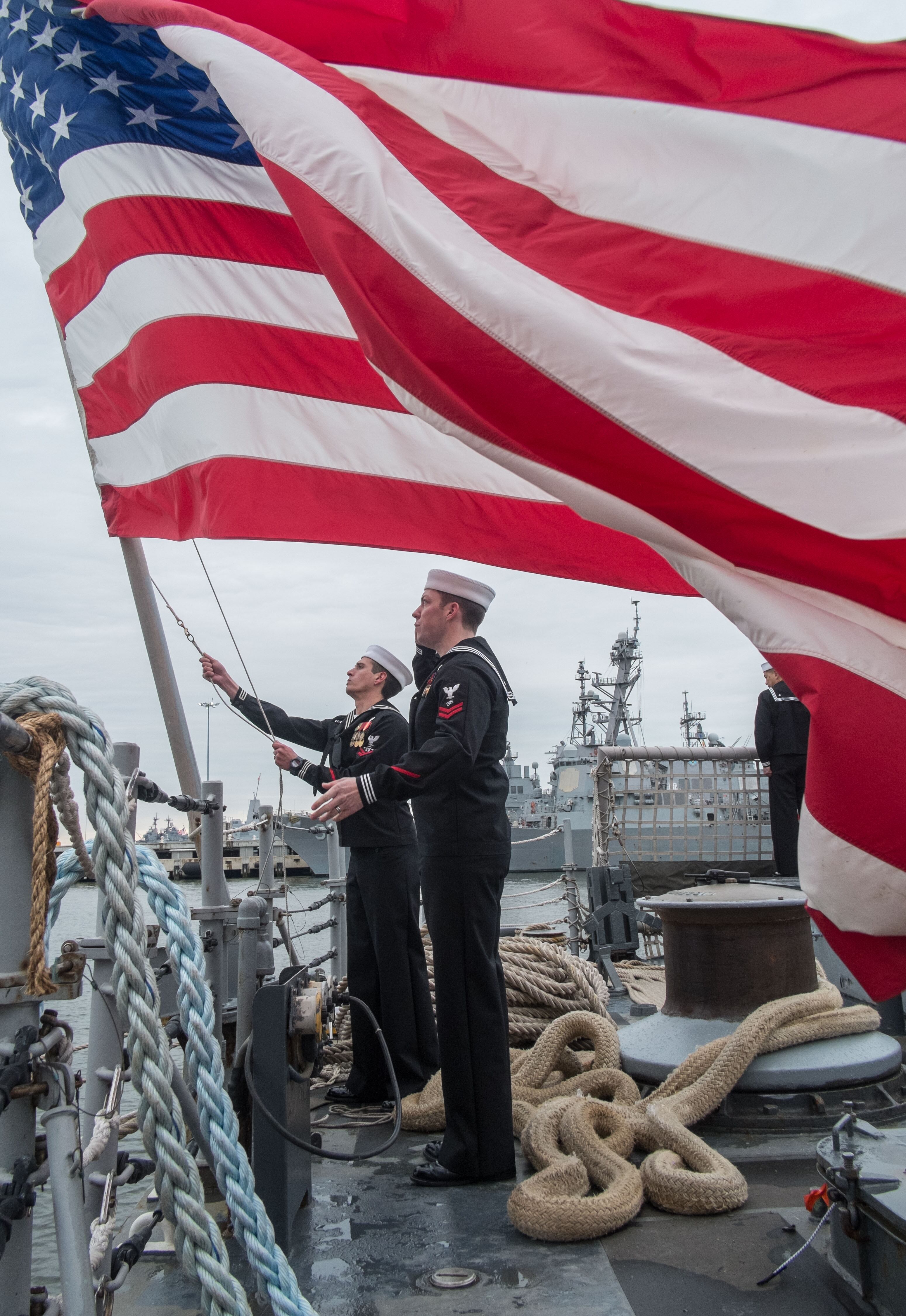Photo by Mark D. Faram Times StaffNaval Station Norfolk, Va. (Jan. 30, 2015) Ñ The remaining crew of the guided missile frigate Elrod. The ship was decommissioned Jan. 30 at Norfolk Naval staton after 29 years and 8 months of service in the fleet.