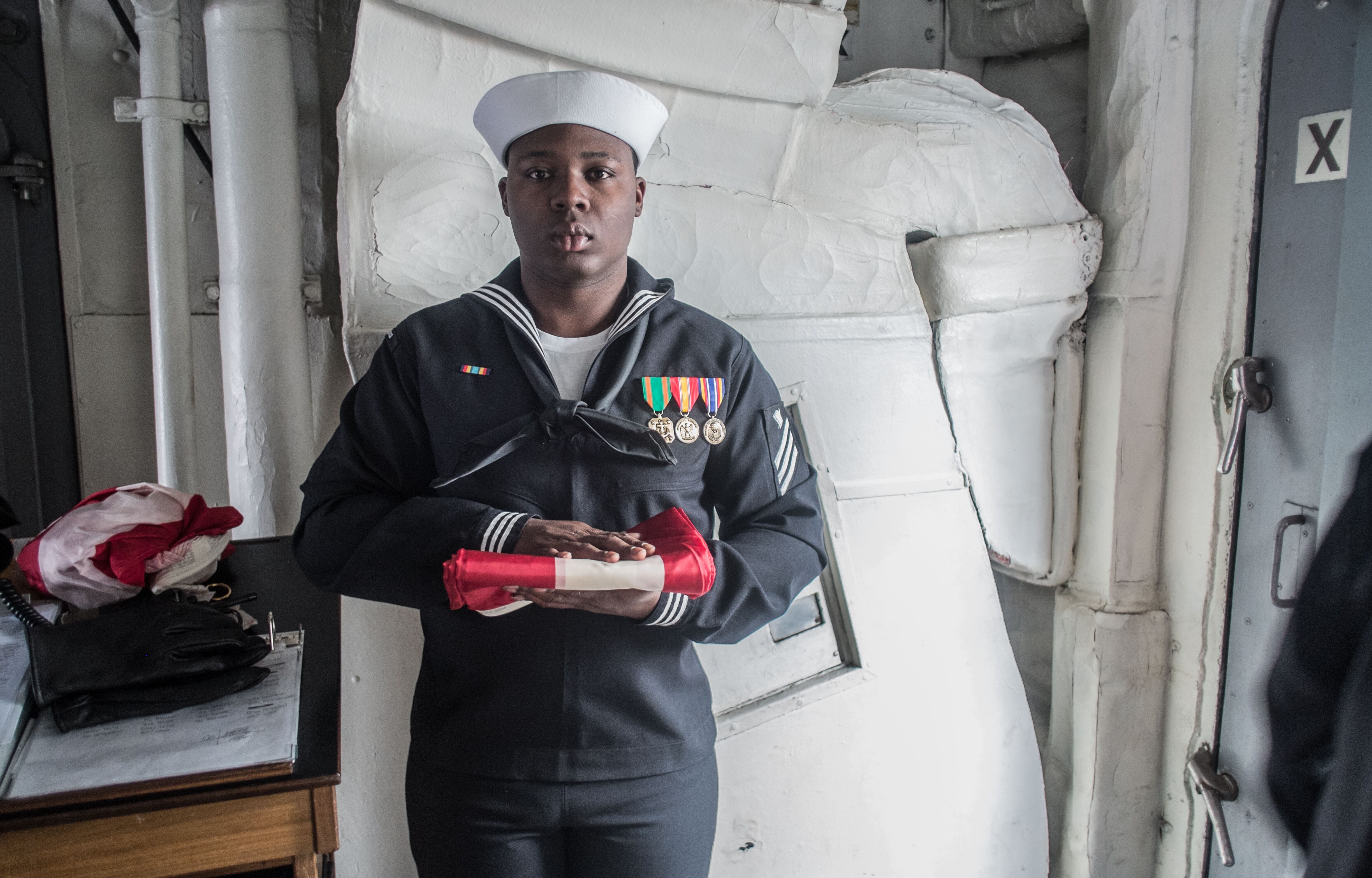 Photo by Mark D. Faram Times StaffAboard the ex-USS Elrod, Naval Station Norfolk, Va. (Jan. 30, 2015) — Lit only by the outside light Personnel Specialist Seaman Sirsamuel [cq} Corley hold the Elrod’s commissioning pennant that has been struck and folded. Corley’s final job as an Elrod crew member was deliver the pennant to the ship’s command senior chief who then presented it to the commanding officer - signifying the ship now being formally out of service.