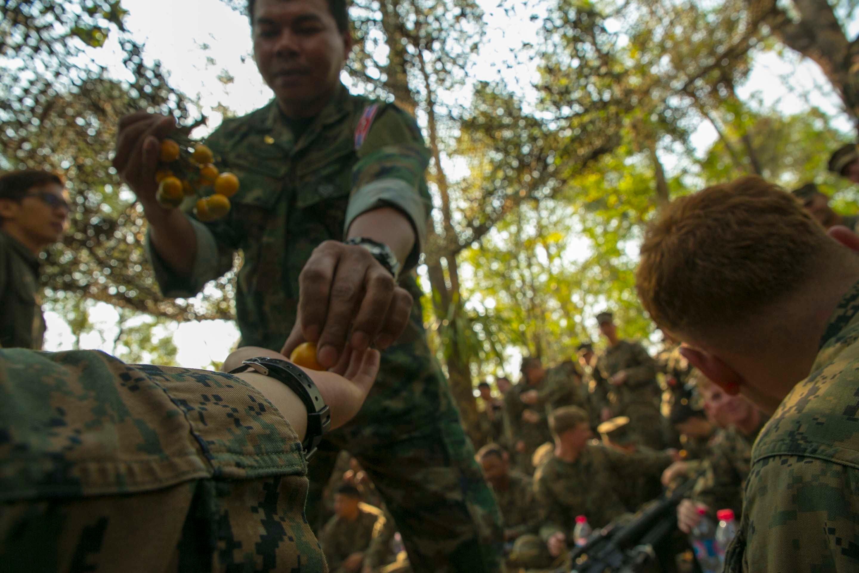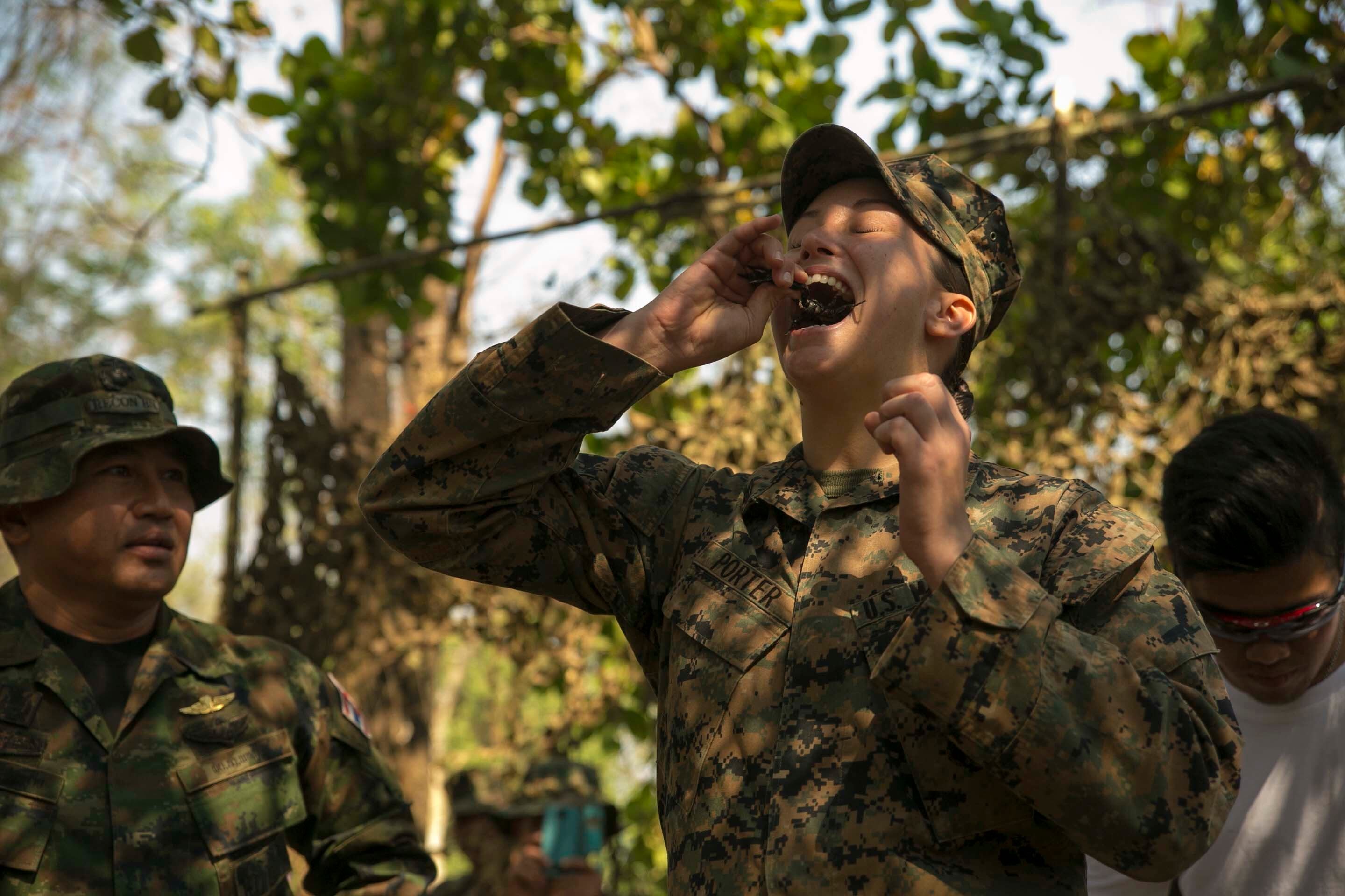Lance Cpl. Dakota Woodward, from Brandon, Florida, drinks cobra blood Feb. 8 during exercise Cobra Gold 2015. The Royal Thai Marines showed U.S. Marines various jungle survival methods. Drinking snake blood is used as a last resort in case there is nothing else to drink. Woodward is a distribution management specialist with Combat Logistics Regiment 35, 3rd Marine Logistics Group, III Marine Expeditionary Force. (U.S. Marine Corps photo by Cpl. Isaac Ibarra/Released)U.S. Marines patiently wait for their turn to get a taste of fruit Feb. 8 at Ban Chan Khrem, Thailand, during exercise Cobra Gold 2015. The Royal Thai Marines gave the U.S. Marines a taste of Thailand by sharing fruit commonly found in the local jungle. The Marines are with III Marine Expeditionary Force. (U.S. Marine Corps photo by Cpl. Isaac Ibarra/Released)Lance Cpl. James Hutsell, from Fayetteville, N.C., drinks coconut water Feb. 8 at Ban Chan Krem, Thailand, during exercise Cobra Gold 2015. The Royal Thai Marines shared several of their native fruits found in the jungle with U.S. Marines. Hutsell is a radio operator with 1st Battalion, 1st Marine Regiment, currently assigned to 4th Marine Regiment under the unit deployment program. (U.S. Marine Corps photo by Cpl. Isaac Ibarra/Released)Thinnakorn Pajorn passes fruit to U.S. Marines Feb. 8 at Ban Chan Krem, Thailand, during exercise Cobra Gold 2015. The Royal Thai Marines gave the U.S. Marines a taste of Thailand by sharing fruit commonly found in the jungle. The Marines are with III Marine Expeditionary Force. (U.S. Marine Corps photo by Cpl. Isaac Ibarra/Released)Royal Thai Marines watch U.S. Marines passing around fruit Feb. 8 at Ban Chan Krem, Thailand, during exercise Cobra Gold 2015. The excitement of the U.S. Marines brought joy to the Thai Marines who taught a lesson in jungle survival. (U.S. Marine Corps photo by Cpl. Isaac Ibarra/Released)Chaiwat Lodsin hands fruit to Cpl. Isaac Ibarra, from Naples, Fla., Feb. 8 at Ban Chan Khrem, Thailand, during exercise Cobra Gold 2015. The Royal Thai Marines gave U.S. Marines many fruits to taste to show them the different types of fruits found in the jungle. Ibarra is a combat correspondent with III Marine Expeditionary Headquarters Group, III MEF. (Marine Corps photo by Cpl. Isaac Ibarra/Released)Cpl. Kyleigh M. Porter, from Montross, Va., eats a scorpion Feb. 8 in Ban Chan Krem, Thailand, during exercise Cobra Gold 2015. The Royal Thai Marines demonstrated several jungle survival tactics and asked for U.S. Marine volunteers to participate. Porter is a radio operator with Marine Air Support Squadron 2, Marine Air Control Group 18, 1st Marine Aircraft Wing, III Marine Expeditionary Force. (Marine Corps photo by Cpl. Isaac Ibarra/Released)A Royal Thai Marine kisses a cobra’s head Feb. 8 at Ban Chan Krem, Thailand, during exercise Cobra Gold 2015. The Thai Marines demonstrated several survival techniques including how to capture a cobra and drink its blood. Drinking the snake’s blood is used as a last resort in case there is nothing else to drink. Other survival methods such as starting fires and how to eat spiders and scorpions were also taught. (U.S. Marine Corps photo by Cpl. Isaac Ibarra/Released)
