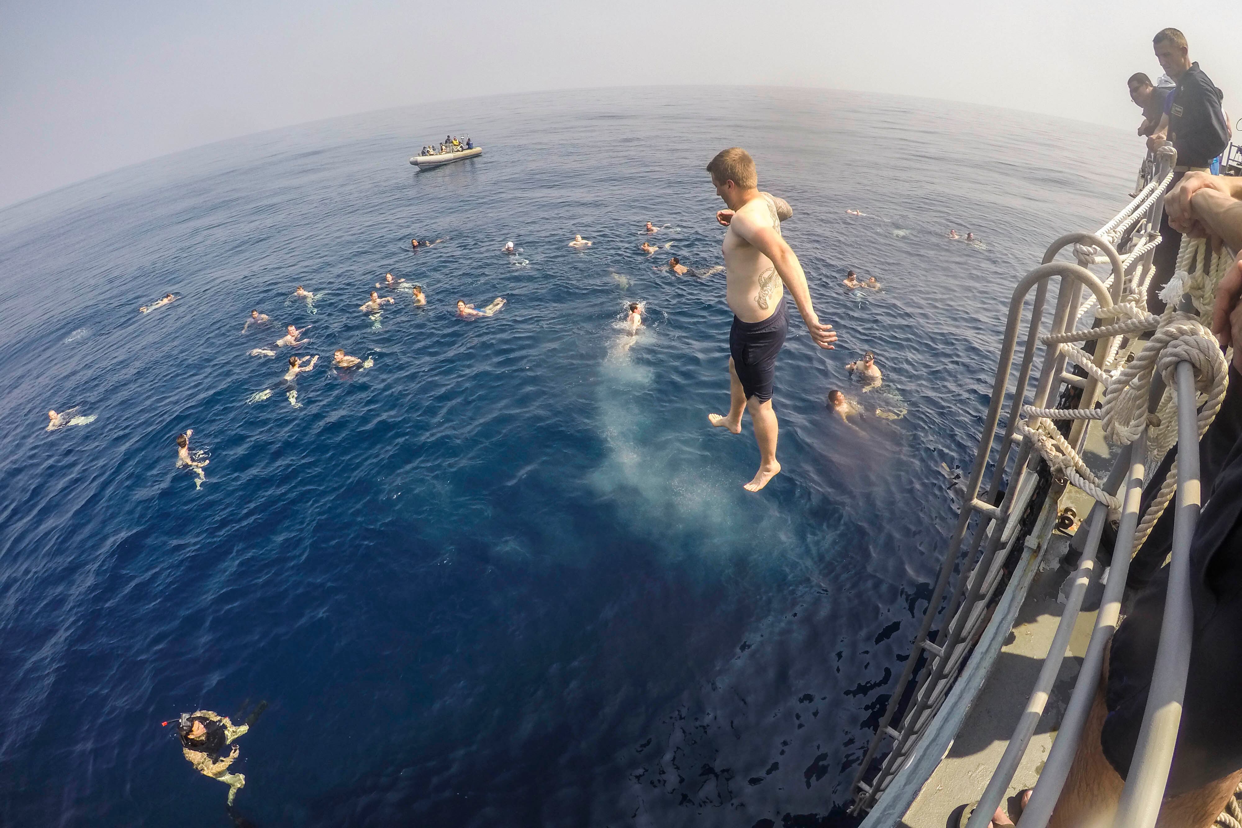 Lt. Col. Thomas Wolfe, 455th Expeditionary Operations Group deputy commander, performs preflight checks on F-16 Fighting Falcon at Bagram Air Field, Afghanistan, Feb. 1, 2016. The 421st EFS, based out of Bagram Air Field, Afghanistan, is the only dedicated fighter squadron in the country and continuously supports Operation Freedom’s Sentinel and the NATO Resolute Support mission. (U.S. Air Force photo by Tech. Sgt. Nicholas Rau)INDIAN OCEAN (Feb. 3, 2016) Logistics Specialist Seaman Curtis Peterson, assigned to the Ticonderoga-class guided-missile cruiser USS Antietam (CG 54), jumps from the ship’s fantail during a swim call. Antietam is on patrol in the 7th Fleet area of operations in support of security and stability in the Indo-Asia-Pacific. (U.S. Navy photo by Mass Communication Specialist 3rd Class David Flewellyn/Released) 160203-N-ZZ786-039
