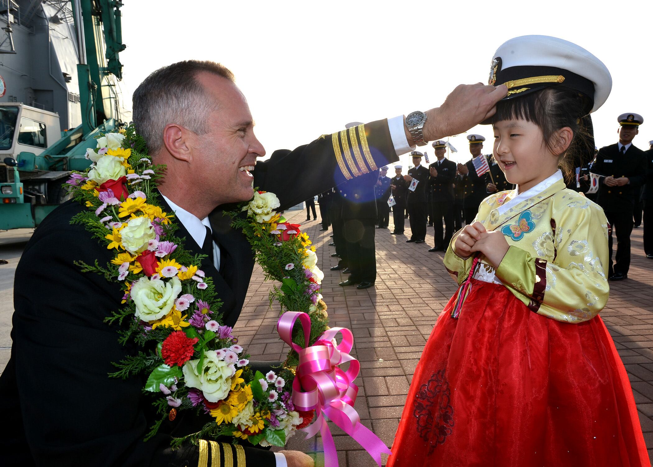 BUSAN, Republic of Korea (Nov. 21, 2014) Capt. Michael Doran, commanding officer of the Ticonderoga-class guided-missile cruiser USS Cape St. George (CG 71), is greeted by a South Korean child as the ship arrives in Busan for a port visit. Cape St. George is on deployment to the U.S. 7th Fleet area of responsibility supporting security and stability in the Indo-Asia-Pacific region. (U.S. Navy photo courtesy of Republic of Korea navy/Released)