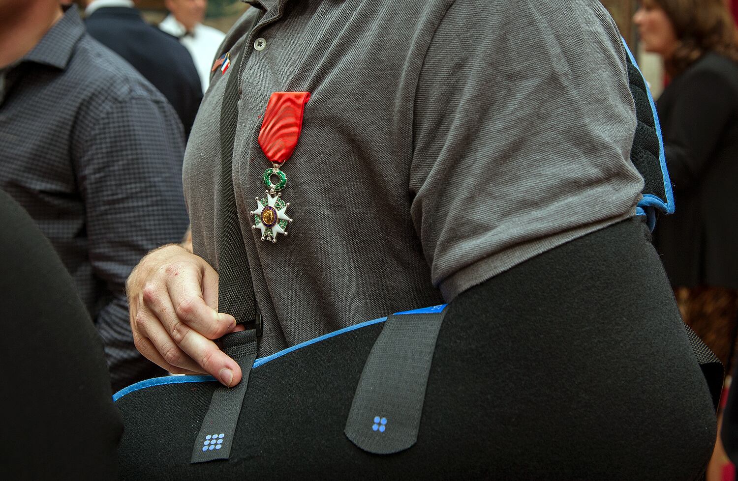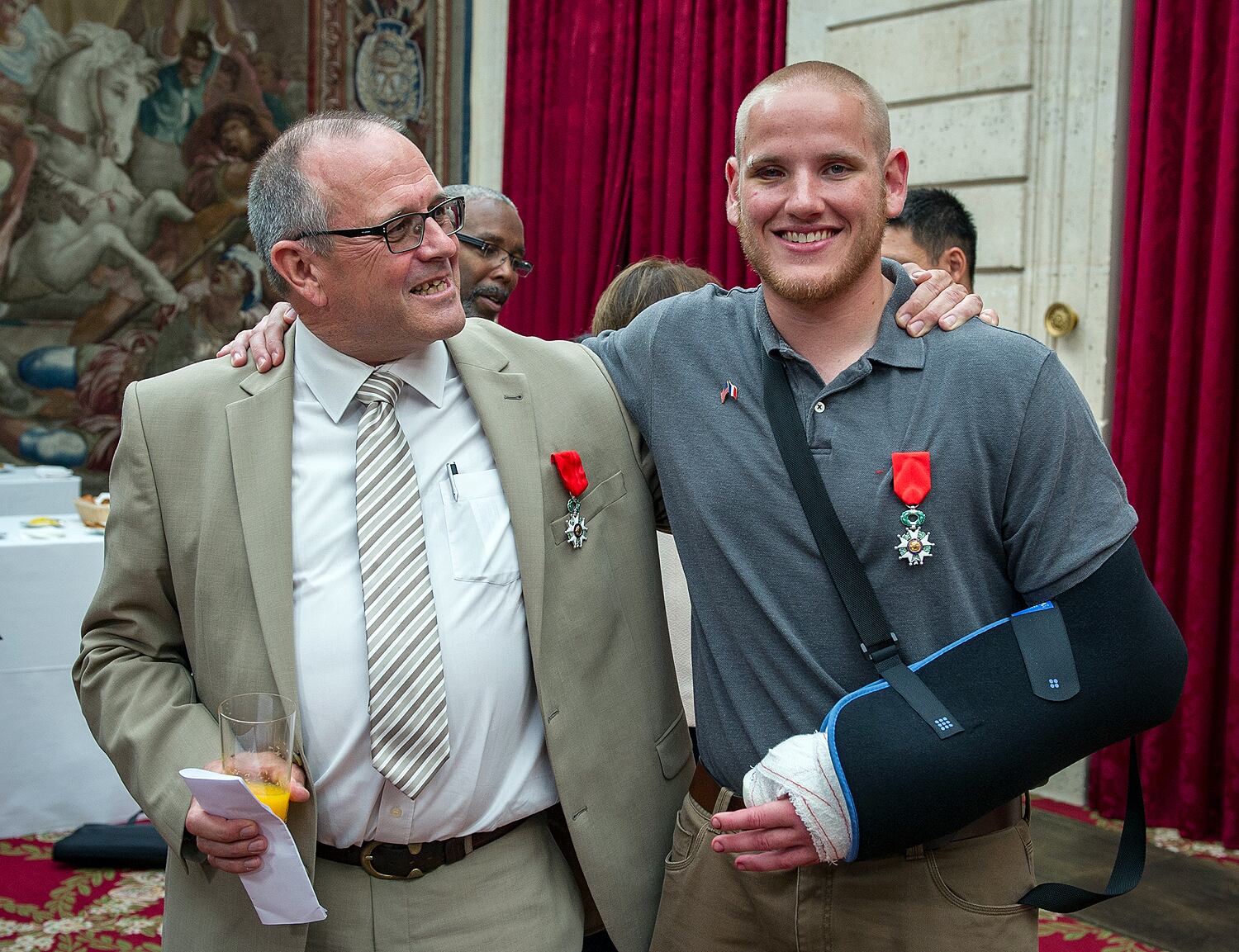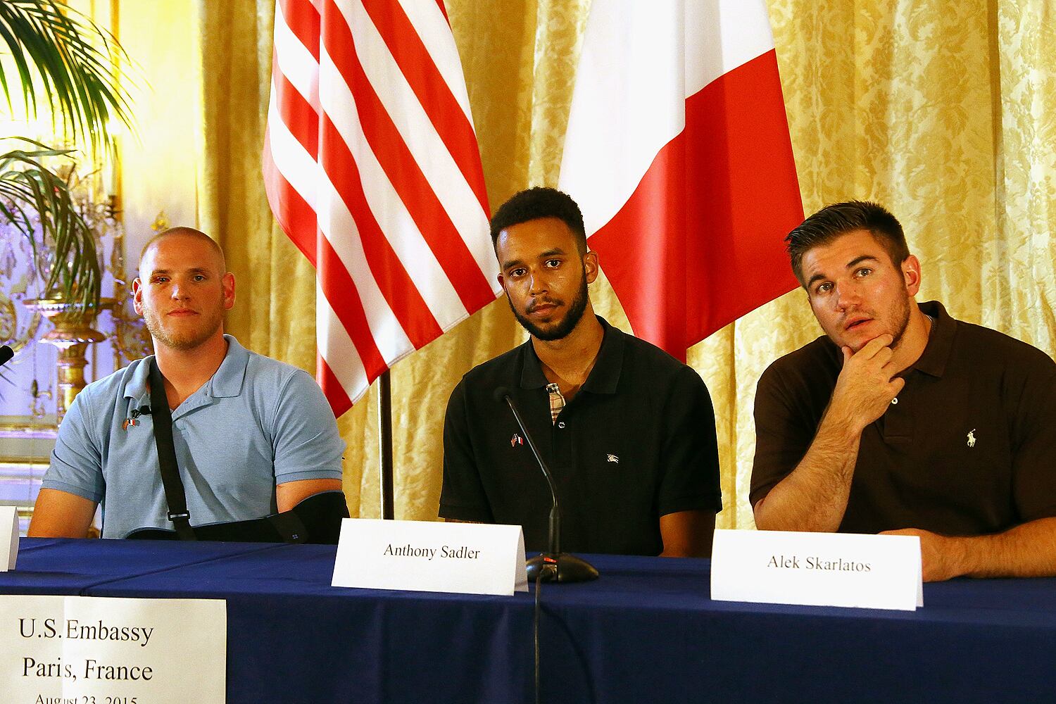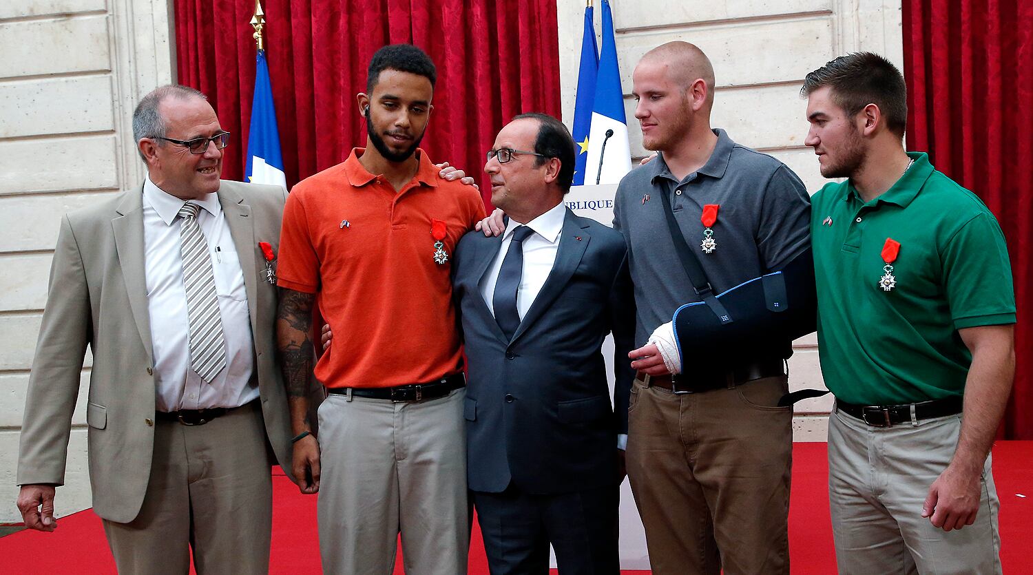 (LtoR) French President Francois Hollande shakes hands with off-duty US serviceman Spencer Stone (C), next to off-duty serviceman Alek Skarlatos and Anthony Sadler (R) and US ambassador to France Jane Hartley after a reception at the Elysee Palace in Paris on August 24, 2015, during which they have been awarded with France's top Legion d'Honneur medal in recognition of their bravery after they overpowered the train attacker. AFP PHOTO / KENZO TRIBOUILLARD (Photo credit should read KENZO TRIBOUILLARD/AFP/Getty Images)Airman 1st Class Spencer Stone was awarded the Legion of Honor at a ceremony at the Élysée in Paris Aug. 24, 2015. Stone was on vacation with his childhood friends, Aleksander Skarlatos and Anthony Sadler, when an armed gunman entered their train carrying an assault rifle, a handgun and a box cutter. The three friends, with the help of a British passenger, subdued the gunman after his rifle jammed. Stone’s medical training prepared him to begin treating wounded passengers while waiting for the authorities to arrive. Stone is an ambulatnce service technician with the 65th Medical Operations Squadron stationed at Lajes Field, Azores. (U.S. Air Force photo/Tech. Sgt. Ryan Crane)France's top Legion d'Honneur medals that have been awarded to (top, LtoR) off-duty US servicemen Aleksander Skarlatos and Spencer Stone, Antony Sadler and British business consultant Chris Norman in recognition of their bravery, after they overpowered the Moroccan gunman in the train attack on August 21, are on display on a cushion during a reception at the Elysee Palace on August 24, 2015 in Paris. AFP PHOTO / POOL / CATHERINE GASCHKAIn this August 24, 2015 US Air Force handout photo, Airman 1st Class Spencer Stone poses with Chris Norman, fellow train passenger, during a reception after French President Francois Hollande awarded them with France's top Legion d'Honneur medal at the at the Elysee Palace in Paris. Stone was on vacation with his childhood friends, Aleksander Skarlatos and Anthony Sadler, when an armed gunman entered their train carrying an assault rifle, a handgun and a box cutter. The three friends, with the help of Norman, subdued the gunman after his rifle jammed. Stone's medical training prepared him to begin treating wounded passengers while waiting for the authorities to arrive. Stone is an ambulance service technician with the 65th Medical Operations Squadron stationed at Lajes Field, Azores. AFP PHOTO / HANDOUT / US AIR FORCE / TECH SGT. RYAN CRANE == RESTRICTED TO EDITORIAL USE / MANDATORY CREDIT: "AFP PHOTO / HANDOUT / US AIR FORCE / TECH SGT.RYAN CRANE"/ NO MARKETING / NO ADVERTISING CAMPAIGNS / DISTRIBUTED AS A SERVICE TO CLIENTS ==Off-duty US servicemen Alek Skarlatos (L) and Spencer Stone leave after a reception at the Elysee Palace in Paris on August 24, 2015, during which they have been awarded with France's top Legion d'Honneur medal by the French president in recognition of their bravery after they overpowered the train attacker. AFP PHOTO / KENZO TRIBOUILLARD (Photo credit should read KENZO TRIBOUILLARD/AFP/Getty Images)U.S. Airman 1st Class Spencer Stone speaks with Jane Hartley, the U.S. ambassador to France after a Legion of Honor ceremony in Paris Aug. 24, 2015, following a foiled attack on a French train. Stone was on vacation with his childhood friends, Aleksander Skarlatos and Anthony Sadler, when an armed gunman entered their train carrying an assault rifle, a handgun and a box cutter. The three friends, with the help of a British passenger, subdued the gunman after his rifle jammed. Stone’s medical training prepared him to begin treating wounded passengers while waiting for the authorities to arrive. Stone is an ambulance service technician with the 65th Medical Operations Squadron stationed at Lajes Field, Azores. (U.S. Air Force photo/Tech. Sgt. Ryan Crane)U.S. Air Force Airman 1st Class Spencer Stone meets Chief Master Sgt. Phillip Easton, 86th Airlift Wing command chief, upon his arrival to Ramstein Air Base, Germany, Aug. 24. 2015. Stone, along with childhood friends Aleksander Skarlatos and Anthony Sadler, was recently honored by French President François Hollande with the French Legion of Honour for subduing an armed gunman when he entered their train carrying an assault rifle, a handgun and a box cutter. Stone is an ambulance service technician with the 65th Medical Operations Squadron stationed at Lajes Field, Azores. (U.S. Air Force Photo by Staff Sgt. Sara Keller)Oregon National Guardsman Aleksander Skarlatos meets Brig. Gen. Jon T. Thomas, 86th Airlift Wing commander, as he arrives at Ramstein Air Base, Germany, Aug. 24. 2015. Skarlatos, along with childhood friends Airman 1st Class Spencer Stone and Anthony Sadler, was recently honored by French President François Hollande with the French Legion of Honour for subduing an armed gunman when he entered their train carrying an assault rifle, a handgun and a box cutter. (U.S. Air Force Photo/Staff Sgt. Sara Keller)(Right to left) Airman 1st Class Spencer Stone, Aleksander Skarlatos and Anthony Sadler pose for a photo in Paris Aug. 23, 2015, following a foiled attack on a French train. Stone was on vacation with his childhood friends, Aleksander Skarlatos and Anthony Sadler, when an armed gunman entered their train carrying an assault rifle, a handgun and a box cutter. The three friends, with the help of a British passenger, subdued the gunman after his rifle jammed. Stone’s medical background prepared him to begin treating wounded passengers while waiting for the authorities to arrive. Stone is an ambulance service technician with the 65th Medical Operations Squadron stationed at Lajes Field, Azores. (U.S. Air Force photo/Tech. Sgt. Ryan Crane)U.S. Airman 1st Class Spencer Stone hugs his mother for the first time in Paris Aug. 24, 2015, following a foiled attack on a French train. Stone was on vacation with his childhood friends, Aleksander Skarlatos and Anthony Sadler, when an armed gunman ent