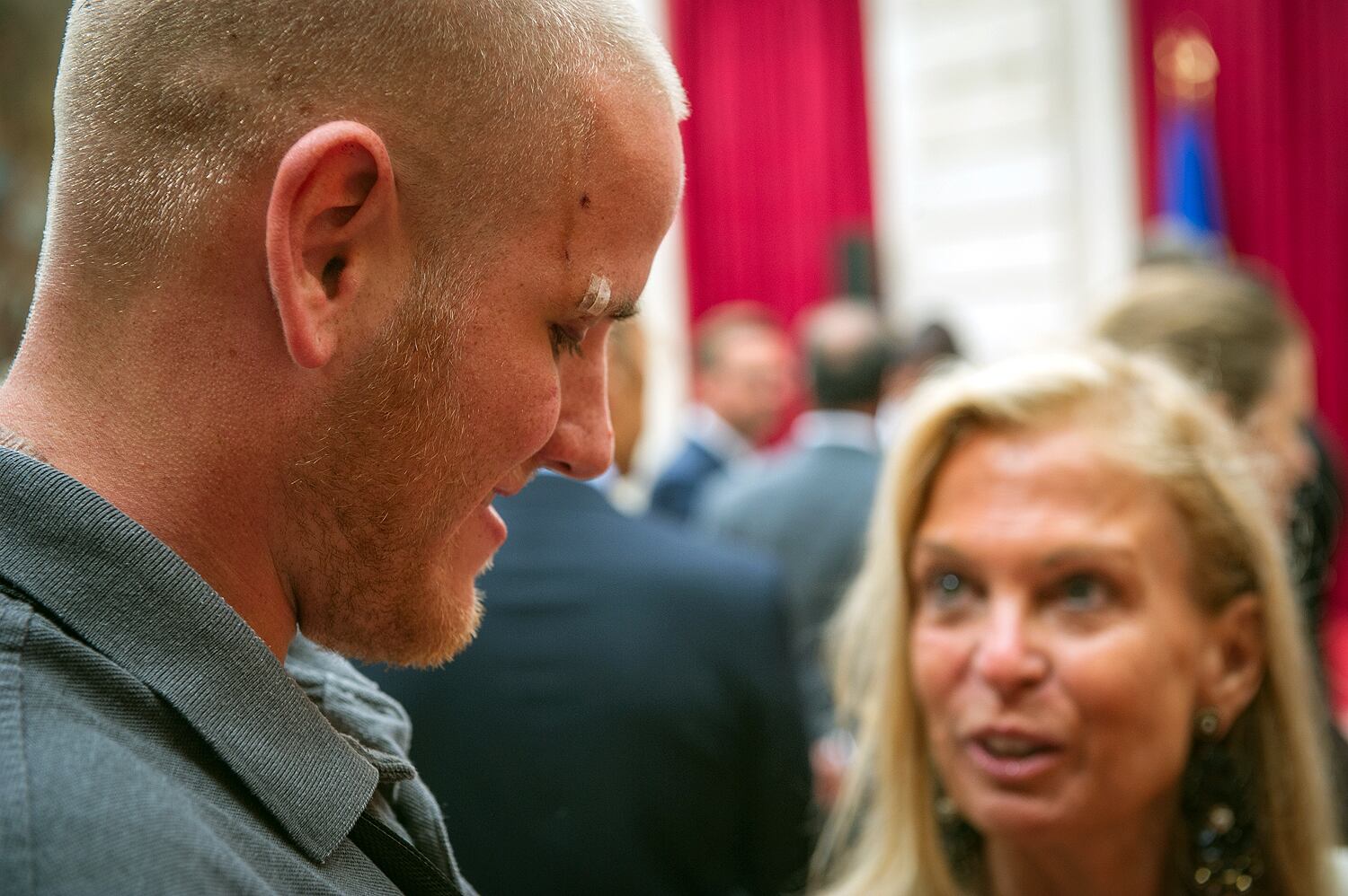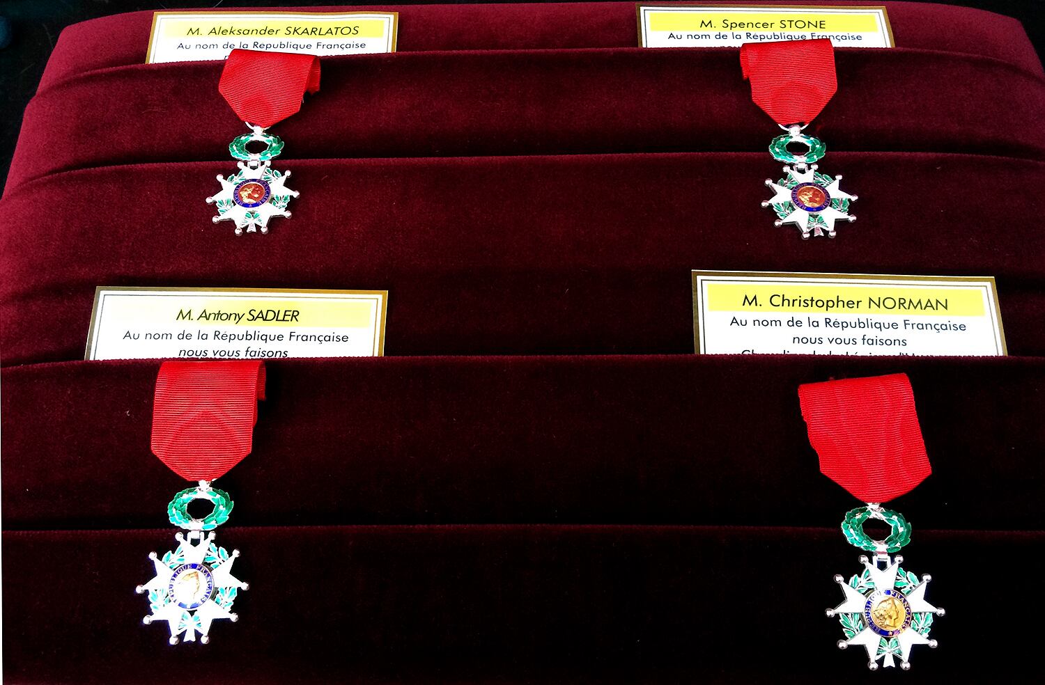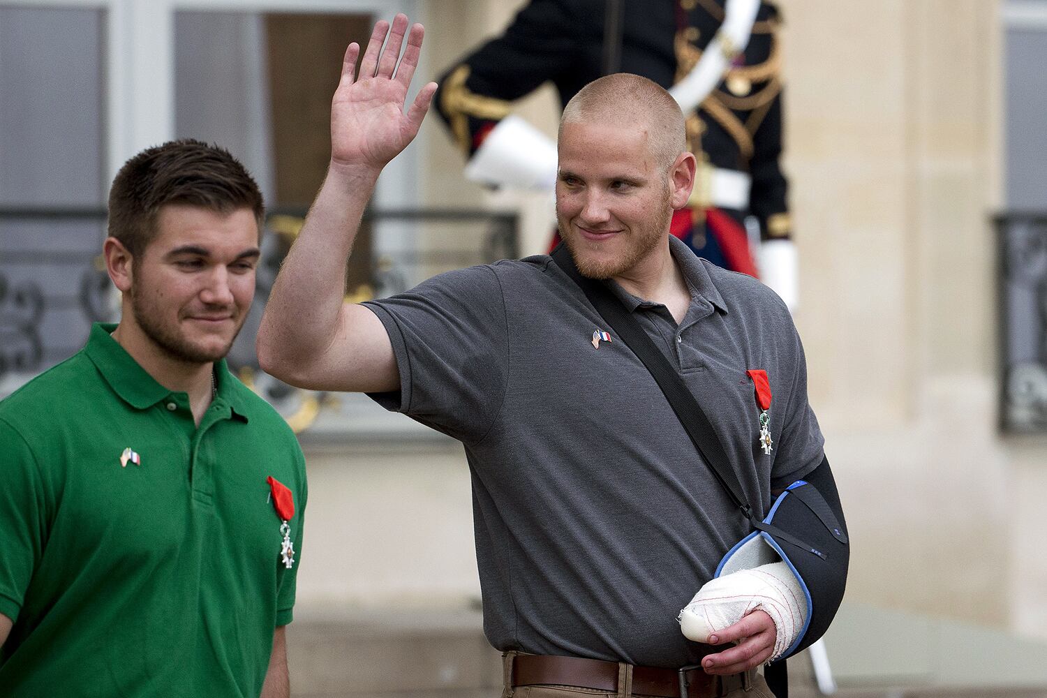 (LtoR) French President Francois Hollande shakes hands with off-duty US serviceman Spencer Stone (C), next to off-duty serviceman Alek Skarlatos and Anthony Sadler (R) and US ambassador to France Jane Hartley after a reception at the Elysee Palace in Paris on August 24, 2015, during which they have been awarded with France's top Legion d'Honneur medal in recognition of their bravery after they overpowered the train attacker. AFP PHOTO / KENZO TRIBOUILLARD (Photo credit should read KENZO TRIBOUILLARD/AFP/Getty Images)Airman 1st Class Spencer Stone was awarded the Legion of Honor at a ceremony at the Élysée in Paris Aug. 24, 2015. Stone was on vacation with his childhood friends, Aleksander Skarlatos and Anthony Sadler, when an armed gunman entered their train carrying an assault rifle, a handgun and a box cutter. The three friends, with the help of a British passenger, subdued the gunman after his rifle jammed. Stone’s medical training prepared him to begin treating wounded passengers while waiting for the authorities to arrive. Stone is an ambulatnce service technician with the 65th Medical Operations Squadron stationed at Lajes Field, Azores. (U.S. Air Force photo/Tech. Sgt. Ryan Crane)France's top Legion d'Honneur medals that have been awarded to (top, LtoR) off-duty US servicemen Aleksander Skarlatos and Spencer Stone, Antony Sadler and British business consultant Chris Norman in recognition of their bravery, after they overpowered the Moroccan gunman in the train attack on August 21, are on display on a cushion during a reception at the Elysee Palace on August 24, 2015 in Paris. AFP PHOTO / POOL / CATHERINE GASCHKAIn this August 24, 2015 US Air Force handout photo, Airman 1st Class Spencer Stone poses with Chris Norman, fellow train passenger, during a reception after French President Francois Hollande awarded them with France's top Legion d'Honneur medal at the at the Elysee Palace in Paris. Stone was on vacation with his childhood friends, Aleksander Skarlatos and Anthony Sadler, when an armed gunman entered their train carrying an assault rifle, a handgun and a box cutter. The three friends, with the help of Norman, subdued the gunman after his rifle jammed. Stone's medical training prepared him to begin treating wounded passengers while waiting for the authorities to arrive. Stone is an ambulance service technician with the 65th Medical Operations Squadron stationed at Lajes Field, Azores. AFP PHOTO / HANDOUT / US AIR FORCE / TECH SGT. RYAN CRANE == RESTRICTED TO EDITORIAL USE / MANDATORY CREDIT: "AFP PHOTO / HANDOUT / US AIR FORCE / TECH SGT.RYAN CRANE"/ NO MARKETING / NO ADVERTISING CAMPAIGNS / DISTRIBUTED AS A SERVICE TO CLIENTS ==Off-duty US servicemen Alek Skarlatos (L) and Spencer Stone leave after a reception at the Elysee Palace in Paris on August 24, 2015, during which they have been awarded with France's top Legion d'Honneur medal by the French president in recognition of their bravery after they overpowered the train attacker. AFP PHOTO / KENZO TRIBOUILLARD (Photo credit should read KENZO TRIBOUILLARD/AFP/Getty Images)U.S. Airman 1st Class Spencer Stone speaks with Jane Hartley, the U.S. ambassador to France after a Legion of Honor ceremony in Paris Aug. 24, 2015, following a foiled attack on a French train. Stone was on vacation with his childhood friends, Aleksander Skarlatos and Anthony Sadler, when an armed gunman entered their train carrying an assault rifle, a handgun and a box cutter. The three friends, with the help of a British passenger, subdued the gunman after his rifle jammed. Stone’s medical training prepared him to begin treating wounded passengers while waiting for the authorities to arrive. Stone is an ambulance service technician with the 65th Medical Operations Squadron stationed at Lajes Field, Azores. (U.S. Air Force photo/Tech. Sgt. Ryan Crane)U.S. Air Force Airman 1st Class Spencer Stone meets Chief Master Sgt. Phillip Easton, 86th Airlift Wing command chief, upon his arrival to Ramstein Air Base, Germany, Aug. 24. 2015. Stone, along with childhood friends Aleksander Skarlatos and Anthony Sadler, was recently honored by French President François Hollande with the French Legion of Honour for subduing an armed gunman when he entered their train carrying an assault rifle, a handgun and a box cutter. Stone is an ambulance service technician with the 65th Medical Operations Squadron stationed at Lajes Field, Azores. (U.S. Air Force Photo by Staff Sgt. Sara Keller)Oregon National Guardsman Aleksander Skarlatos meets Brig. Gen. Jon T. Thomas, 86th Airlift Wing commander, as he arrives at Ramstein Air Base, Germany, Aug. 24. 2015. Skarlatos, along with childhood friends Airman 1st Class Spencer Stone and Anthony Sadler, was recently honored by French President François Hollande with the French Legion of Honour for subduing an armed gunman when he entered their train carrying an assault rifle, a handgun and a box cutter. (U.S. Air Force Photo/Staff Sgt. Sara Keller)(Right to left) Airman 1st Class Spencer Stone, Aleksander Skarlatos and Anthony Sadler pose for a photo in Paris Aug. 23, 2015, following a foiled attack on a French train. Stone was on vacation with his childhood friends, Aleksander Skarlatos and Anthony Sadler, when an armed gunman entered their train carrying an assault rifle, a handgun and a box cutter. The three friends, with the help of a British passenger, subdued the gunman after his rifle jammed. Stone’s medical background prepared him to begin treating wounded passengers while waiting for the authorities to arrive. Stone is an ambulance service technician with the 65th Medical Operations Squadron stationed at Lajes Field, Azores. (U.S. Air Force photo/Tech. Sgt. Ryan Crane)U.S. Airman 1st Class Spencer Stone hugs his mother for the first time in Paris Aug. 24, 2015, following a foiled attack on a French train. Stone was on vacation with his childhood friends, Aleksander Skarlatos and Anthony Sadler, when an armed gunman ent