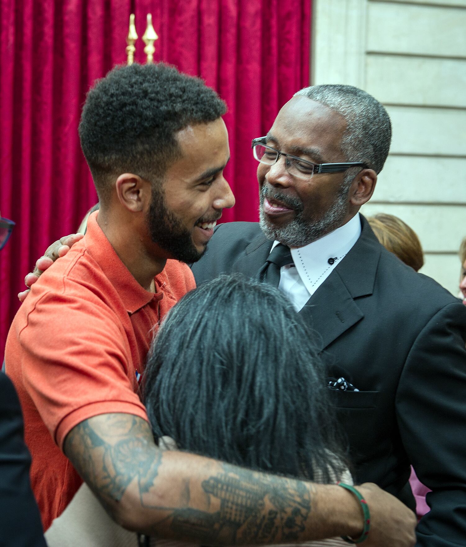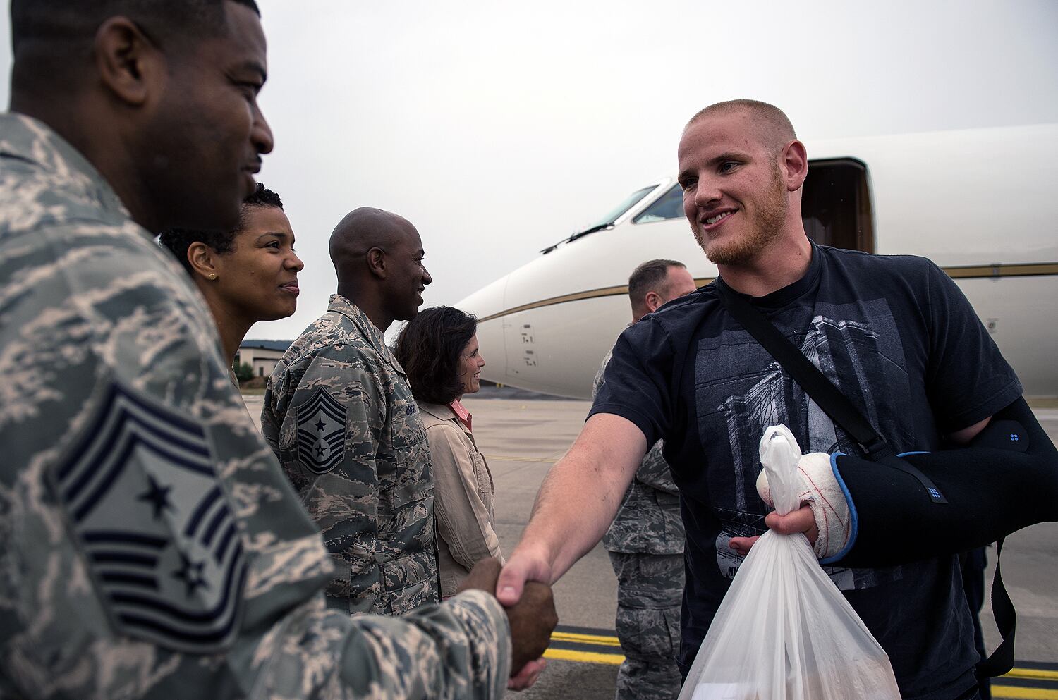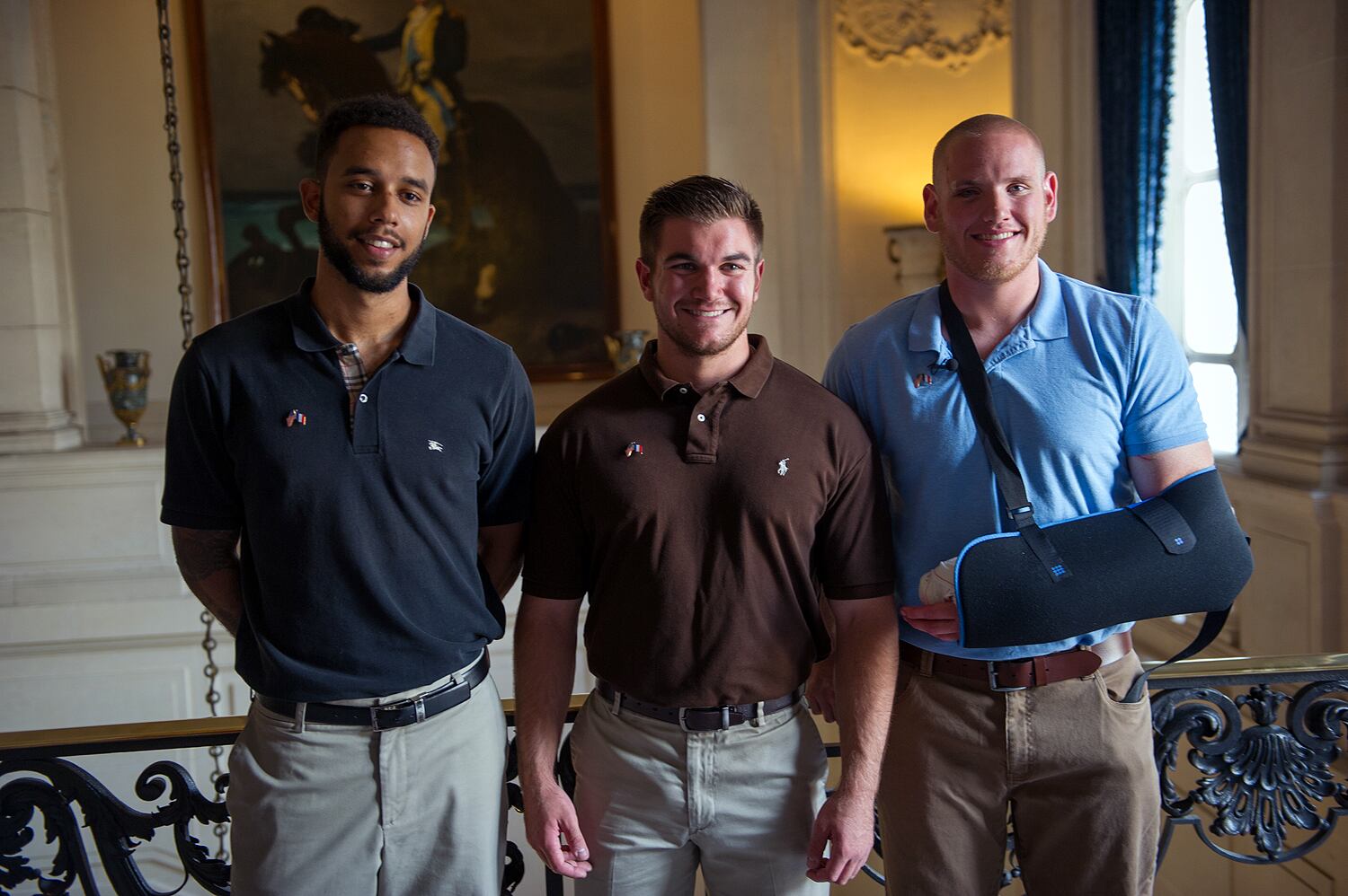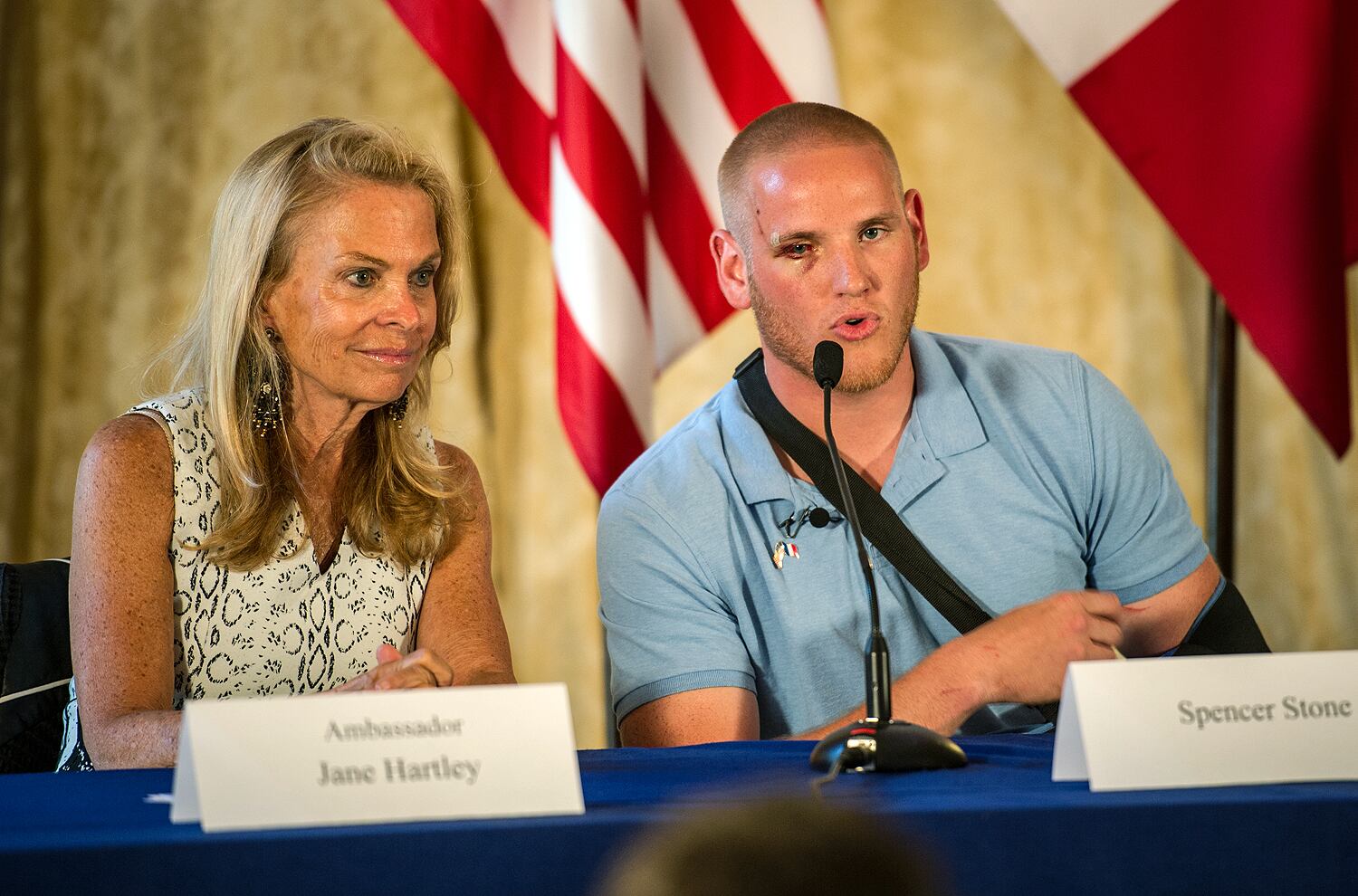 (LtoR) French President Francois Hollande shakes hands with off-duty US serviceman Spencer Stone (C), next to off-duty serviceman Alek Skarlatos and Anthony Sadler (R) and US ambassador to France Jane Hartley after a reception at the Elysee Palace in Paris on August 24, 2015, during which they have been awarded with France's top Legion d'Honneur medal in recognition of their bravery after they overpowered the train attacker. AFP PHOTO / KENZO TRIBOUILLARD (Photo credit should read KENZO TRIBOUILLARD/AFP/Getty Images)Airman 1st Class Spencer Stone was awarded the Legion of Honor at a ceremony at the Élysée in Paris Aug. 24, 2015. Stone was on vacation with his childhood friends, Aleksander Skarlatos and Anthony Sadler, when an armed gunman entered their train carrying an assault rifle, a handgun and a box cutter. The three friends, with the help of a British passenger, subdued the gunman after his rifle jammed. Stone’s medical training prepared him to begin treating wounded passengers while waiting for the authorities to arrive. Stone is an ambulatnce service technician with the 65th Medical Operations Squadron stationed at Lajes Field, Azores. (U.S. Air Force photo/Tech. Sgt. Ryan Crane)France's top Legion d'Honneur medals that have been awarded to (top, LtoR) off-duty US servicemen Aleksander Skarlatos and Spencer Stone, Antony Sadler and British business consultant Chris Norman in recognition of their bravery, after they overpowered the Moroccan gunman in the train attack on August 21, are on display on a cushion during a reception at the Elysee Palace on August 24, 2015 in Paris. AFP PHOTO / POOL / CATHERINE GASCHKAIn this August 24, 2015 US Air Force handout photo, Airman 1st Class Spencer Stone poses with Chris Norman, fellow train passenger, during a reception after French President Francois Hollande awarded them with France's top Legion d'Honneur medal at the at the Elysee Palace in Paris. Stone was on vacation with his childhood friends, Aleksander Skarlatos and Anthony Sadler, when an armed gunman entered their train carrying an assault rifle, a handgun and a box cutter. The three friends, with the help of Norman, subdued the gunman after his rifle jammed. Stone's medical training prepared him to begin treating wounded passengers while waiting for the authorities to arrive. Stone is an ambulance service technician with the 65th Medical Operations Squadron stationed at Lajes Field, Azores. AFP PHOTO / HANDOUT / US AIR FORCE / TECH SGT. RYAN CRANE == RESTRICTED TO EDITORIAL USE / MANDATORY CREDIT: "AFP PHOTO / HANDOUT / US AIR FORCE / TECH SGT.RYAN CRANE"/ NO MARKETING / NO ADVERTISING CAMPAIGNS / DISTRIBUTED AS A SERVICE TO CLIENTS ==Off-duty US servicemen Alek Skarlatos (L) and Spencer Stone leave after a reception at the Elysee Palace in Paris on August 24, 2015, during which they have been awarded with France's top Legion d'Honneur medal by the French president in recognition of their bravery after they overpowered the train attacker. AFP PHOTO / KENZO TRIBOUILLARD (Photo credit should read KENZO TRIBOUILLARD/AFP/Getty Images)U.S. Airman 1st Class Spencer Stone speaks with Jane Hartley, the U.S. ambassador to France after a Legion of Honor ceremony in Paris Aug. 24, 2015, following a foiled attack on a French train. Stone was on vacation with his childhood friends, Aleksander Skarlatos and Anthony Sadler, when an armed gunman entered their train carrying an assault rifle, a handgun and a box cutter. The three friends, with the help of a British passenger, subdued the gunman after his rifle jammed. Stone’s medical training prepared him to begin treating wounded passengers while waiting for the authorities to arrive. Stone is an ambulance service technician with the 65th Medical Operations Squadron stationed at Lajes Field, Azores. (U.S. Air Force photo/Tech. Sgt. Ryan Crane)U.S. Air Force Airman 1st Class Spencer Stone meets Chief Master Sgt. Phillip Easton, 86th Airlift Wing command chief, upon his arrival to Ramstein Air Base, Germany, Aug. 24. 2015. Stone, along with childhood friends Aleksander Skarlatos and Anthony Sadler, was recently honored by French President François Hollande with the French Legion of Honour for subduing an armed gunman when he entered their train carrying an assault rifle, a handgun and a box cutter. Stone is an ambulance service technician with the 65th Medical Operations Squadron stationed at Lajes Field, Azores. (U.S. Air Force Photo by Staff Sgt. Sara Keller)Oregon National Guardsman Aleksander Skarlatos meets Brig. Gen. Jon T. Thomas, 86th Airlift Wing commander, as he arrives at Ramstein Air Base, Germany, Aug. 24. 2015. Skarlatos, along with childhood friends Airman 1st Class Spencer Stone and Anthony Sadler, was recently honored by French President François Hollande with the French Legion of Honour for subduing an armed gunman when he entered their train carrying an assault rifle, a handgun and a box cutter. (U.S. Air Force Photo/Staff Sgt. Sara Keller)(Right to left) Airman 1st Class Spencer Stone, Aleksander Skarlatos and Anthony Sadler pose for a photo in Paris Aug. 23, 2015, following a foiled attack on a French train. Stone was on vacation with his childhood friends, Aleksander Skarlatos and Anthony Sadler, when an armed gunman entered their train carrying an assault rifle, a handgun and a box cutter. The three friends, with the help of a British passenger, subdued the gunman after his rifle jammed. Stone’s medical background prepared him to begin treating wounded passengers while waiting for the authorities to arrive. Stone is an ambulance service technician with the 65th Medical Operations Squadron stationed at Lajes Field, Azores. (U.S. Air Force photo/Tech. Sgt. Ryan Crane)U.S. Airman 1st Class Spencer Stone hugs his mother for the first time in Paris Aug. 24, 2015, following a foiled attack on a French train. Stone was on vacation with his childhood friends, Aleksander Skarlatos and Anthony Sadler, when an armed gunman ent