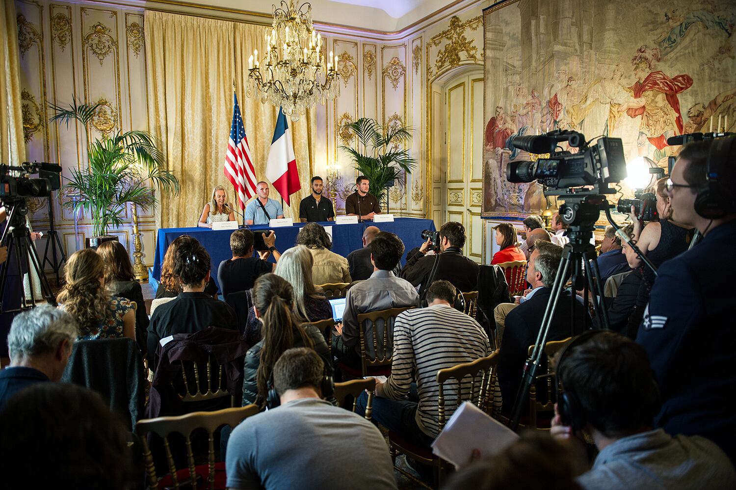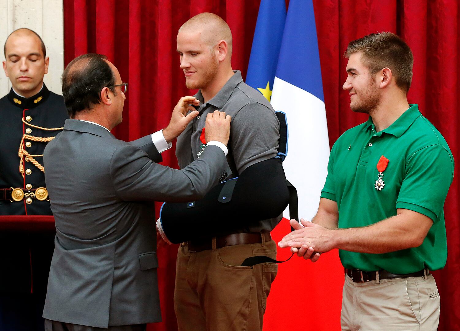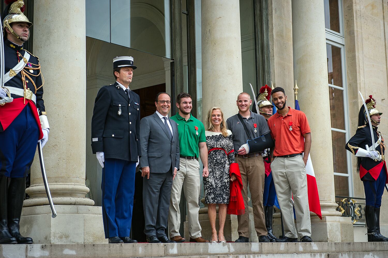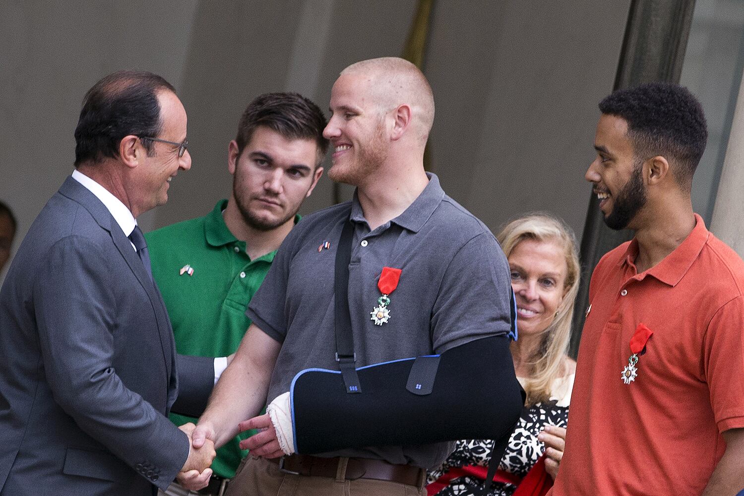 French President François Hollande stops for a photo with Airman 1st Class Spencer Stone, Aleksander Skarlatos, Anthony Sadler and Jane Hartley, U.S. ambassador to France, after a Legion of Honor ceremony at the Élysée in Paris Aug. 24, 2015. Stone was on vacation with his childhood friends, Aleksander Skarlatos and Anthony Sadler, when an armed gunman entered their train carrying an assault rifle, a handgun and a box cutter. The three friends, with the help of a British passenger, subdued the gunman after his rifle jammed. Stone’s medical training prepared him to begin treating wounded passengers while waiting for the authorities to arrive. Stone is an ambulance service technician with the 65th Medical Operations Squadron stationed at Lajes Field, Azores. (U.S. Air Force photo/Tech. Sgt. Ryan Crane)French President Francois Hollande (C) poses with (LtoR) British businessman Chris Norman and Anthony Sadler from the US, and off-duty US servicemen Spencer Stone, and Alek Skarlatos during a reception in their honor at the Elysee Palace on August 24, 2015 in Paris, after Hollande awarded them with France's top Legion d'Honneur medal in recognition of their bravery after they overpowered the train attacker. AFP PHOTO / POOL / MICHEL EULER French President Francois Hollande (2nd L) awards France's top Legion d'Honneur medal to off-duty US serviceman Spencer Stone (2nd R), while with US serviceman Alek Skarlatos applauds during a reception at the Elysee Palace on August 24, 2015 in Paris, in recognition of their bravery, after they overpowered the Moroccan gunman in the train attack on August 21. AFP PHOTO / POOL / MICHEL EULER