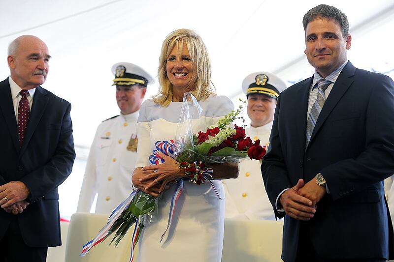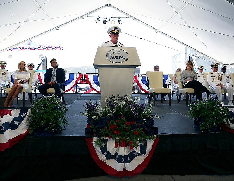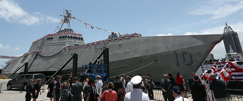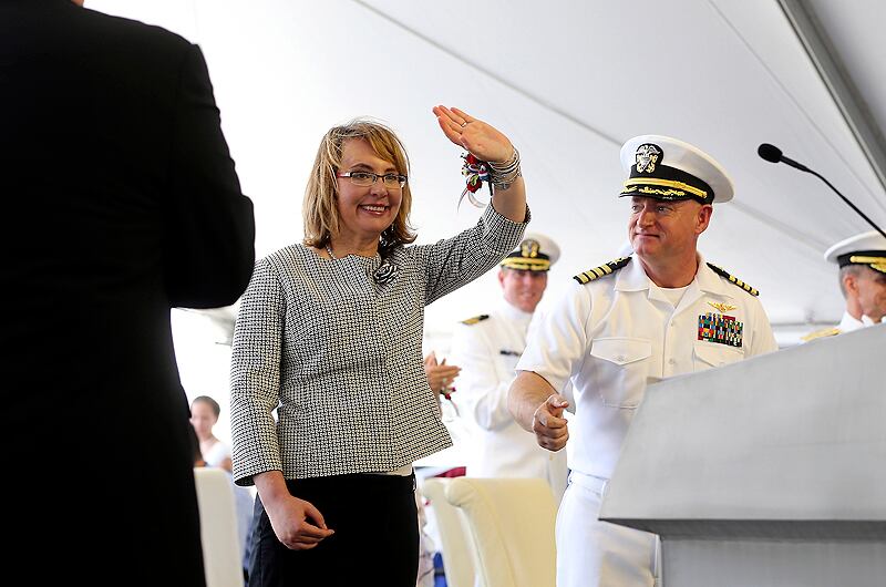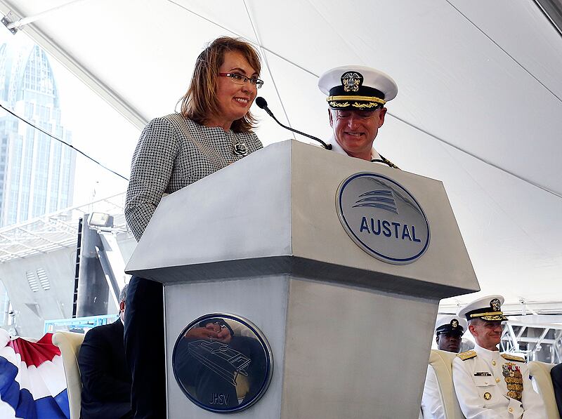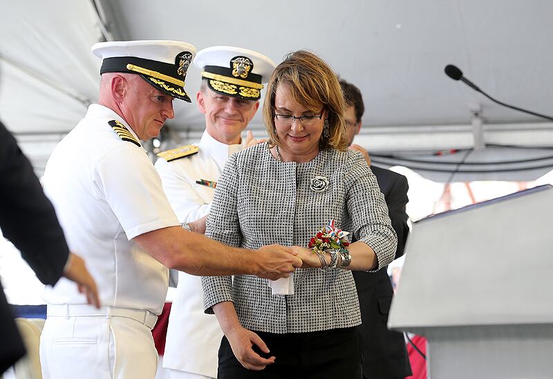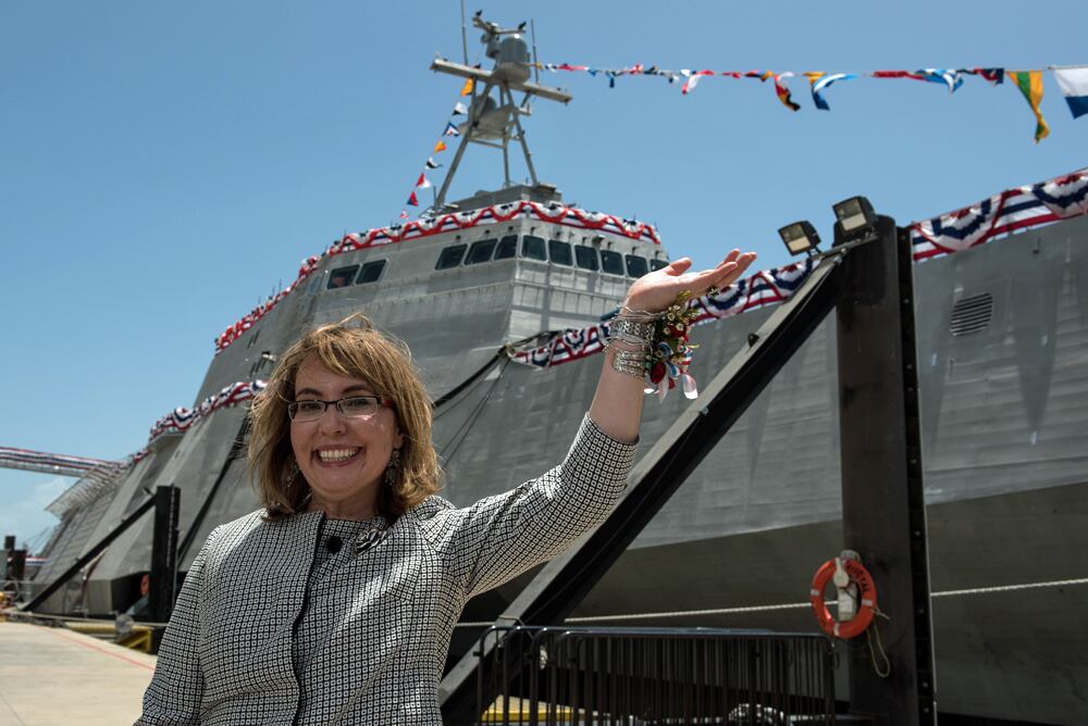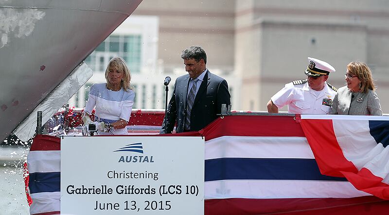 MOBILE, Ala. (June 13, 2015) Former U.S. Rep. Gabrielle "Gabby" Giffords waves to a crowd in front of the littoral combat ship, USS Gabrielle Giffords (LCS 10), named for her. Giffords was on the stage as Dr. Jill Biden christened the ship at Austal USA in Mobile, Ala. The 419-foot ship was built at the Austal shipyard and is the Navy's 10th littoral combat ship designed to operate in shallow waters near the coast. It is 16th U.S. naval ship to be named for a woman and only the 13th since 1850 to be named for a living person. (Photo courtesy Austal USA/Released)The USS Gabrielle Giffords, a littoral combat ship built at the Austal USA shipyards in Mobile, Ala, is decorated for a christening ceremony Saturday, June 13, 2015, in Mobile, Ala. Former U.S. Rep. Gabrielle "Gabby" Giffords of Arizona had a Navy vessel named in her honor during a ceremony at a Mobile, Alabama, shipyard Saturday afternoon. (Mike Brantley/AL.com via AP) MAGS OUT; MANDATORY CREDITJill Biden, wife of Vice President Joe Biden, left, smashes a champagne bottle on the bow as other dignitaries, including Austal USA President Craig Perciavalle, second from left, former U.S. Rep. Gabrielle Giffords of Arizona, right, and her husband retired U.S. Navy Capt. Mark Kelly, watch from the platform Saturday, June 13, 2015, in Mobile, Ala. Former U.S. Rep. Gabrielle "Gabby" Giffords of Arizona had a Navy vessel named in her honor during a ceremony at a Mobile, Alabama, shipyard Saturday afternoon. (Mike Brantley/AL.com via AP) MAGS OUT; MANDATORY CREDITRetired U.S. Navy Capt. Capt. Mark Kelly, speaks at the podium during a ceremony as his wife, former U.S. Rep. Gabrielle Giffords of Arizona, right, and Jill Biden, wife of Vice President Joe Biden listen Saturday, June 13, 2015, in Mobile, Ala. Former U.S. Rep. Gabrielle "Gabby" Giffords of Arizona had a Navy vessel named in her honor during a ceremony at a Mobile, Alabama, shipyard Saturday afternoon. (Mike Brantley/AL.com via AP) MAGS OUT; MANDATORY CREDITFormer U.S. Rep. Gabrielle Giffords of Arizona is helped to the podium by her husband, retired U.S. Navy Capt. Mark Kelly, as the USS Gabrielle Giffords, a littoral combat ship built at the Austal USA shipyards in Mobile, Ala, is christened during a ceremony Saturday, June 13, 2015, in Mobile, Ala. Former U.S. Rep. Gabrielle "Gabby" Giffords of Arizona had a Navy vessel named in her honor during a ceremony at a Mobile, Alabama, shipyard Saturday afternoon. (Mike Brantley/AL.com via AP) MAGS OUT; MANDATORY CREDITFormer U.S. Rep. Gabrielle Giffords of Arizona delivers remarks with her husband, retired U.S. Navy Capt. Mark Kelly, by her side as the USS Gabrielle Giffords, a littoral combat ship built at the Austal USA shipyards is christened during a ceremony, Saturday, June 13, 2015, in Mobile, Ala. Former U.S. Rep. Gabrielle "Gabby" Giffords of Arizona had a Navy vessel named in her honor during a ceremony at a Mobile, Alabama, shipyard Saturday afternoon. (Mike Brantley/AL.com via AP) MAGS OUT; MANDATORY CREDITFormer U.S. Rep. Gabrielle Giffords of Arizona and husband retired U.S.Navy Captain Mark Kelly greet the crowd during a ceremony, Saturday, June 13, 2015, in Mobile, Ala. Former U.S. Rep. Gabrielle "Gabby" Giffords of Arizona had a Navy vessel named in her honor during a ceremony at a Mobile, Alabama, shipyard Saturday afternoon. (Mike Brantley/AL.com via AP) MAGS OUT; MANDATORY CREDITJill Biden wife of Vice President Joe Biden, stands with Dennis V. McGinn, left, assistant secretary of the Navy for energy, and Carlo Perciavalle, right, president of Austal USA, during a ceremony, Saturday, June 13, 2015, in Mobile, Ala. Former U.S. Rep. Gabrielle "Gabby" Giffords of Arizona had a Navy vessel named in her honor during a ceremony at a Mobile, Alabama, shipyard Saturday afternoon. (Mike Brantley/AL.com via AP) MAGS OUT; MANDATORY CREDIT