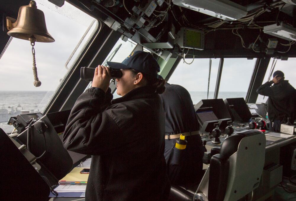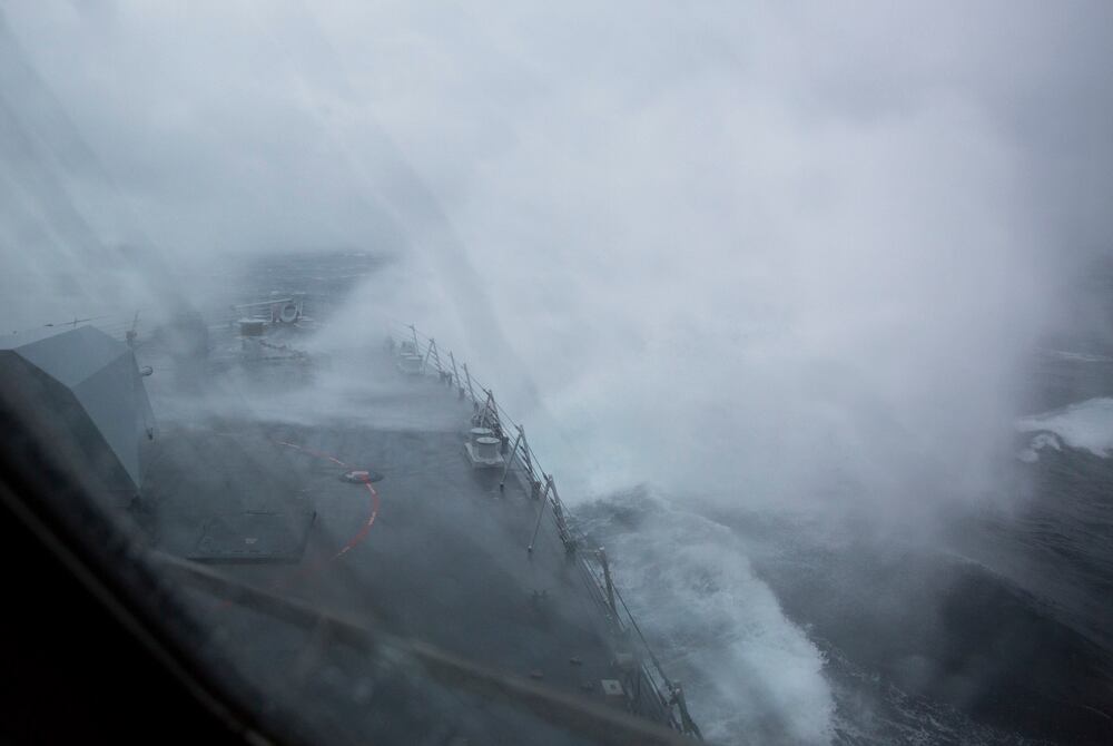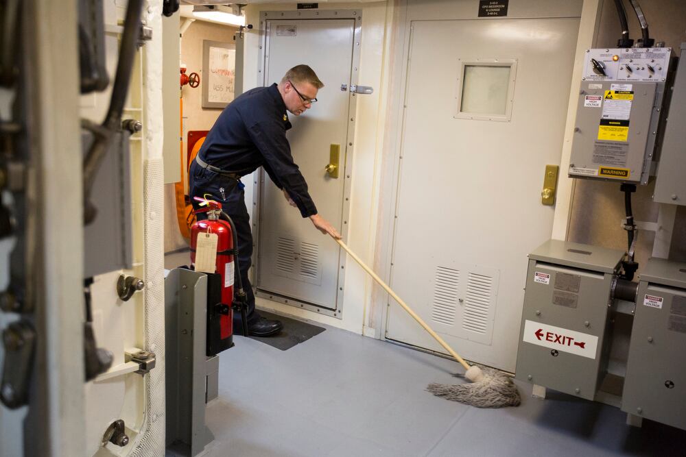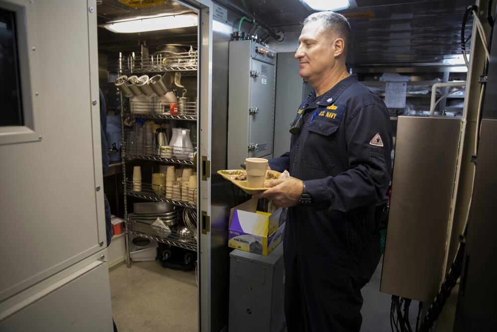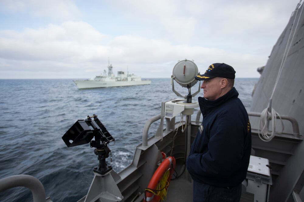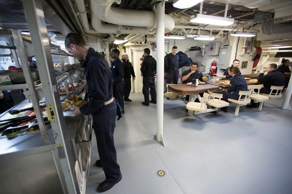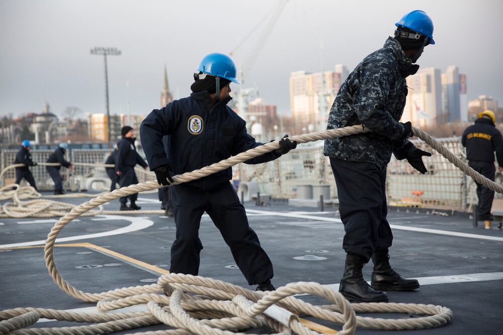 LSC Grace Felipe and CS2 Kevin Ingram pull in a line as the crew of USS Milwaukee, LCS-5, prepares to depart from Halifax, Nova Scotia on Monday, December 7, 2015.Cmdr. Ken Bridgewater, commanding officer of USS Milwaukee, LCS-5, watches from the bridge wing as a Canadian naval vessel pulls alongside near Halifax, Nova Scotia on Monday, December 7, 2015.Lt.j.g. William Foster helps sweep up the AMZ aboard USS Milwaukee, LCS-5, while in transit from Halifax, Nova Scotia to Joint Base Little Creek, Va. on Tuesday, December 8, 2015. LCS-5 was commissioned in Milwaukee and will ultimately head to San Diego.HM1 Renee Hotchkiss trains on the bridge of USS Milwaukee, LCS-5, while in transit from Halifax, Nova Scotia to Joint Base Little Creek, Va. on Monday, December 7, 2015.Waves break over the bow of USS Milwaukee, LCS-5, while in transit from Halifax, Nova Scotia to Joint Base Little Creek, Va. on Tuesday, December 8, 2015. The crew of USS Milwaukee eat lunch while in transit from Halifax, Nova Scotia to Joint Base Little Creek, Va. on Wednesday, December 9, 2015.Cmdr. Ken Bridgewater, commanding officer of USS Milwaukee, waits in line to clear his tray following dinner on Monday, December 7, 2015. All sailors are expected to pitch in due to having a smaller crew than a traditional ship.Command Master Chief Mark Christman swabs a passageway after breakfast while the USS Milwaukee, transits from Halifax, Nova Scotia to Joint Base Little Creek, Va. on Wednesday, December 9, 2015. The smaller LCS crew forces sailors of all ranks to pitch in where necessary.