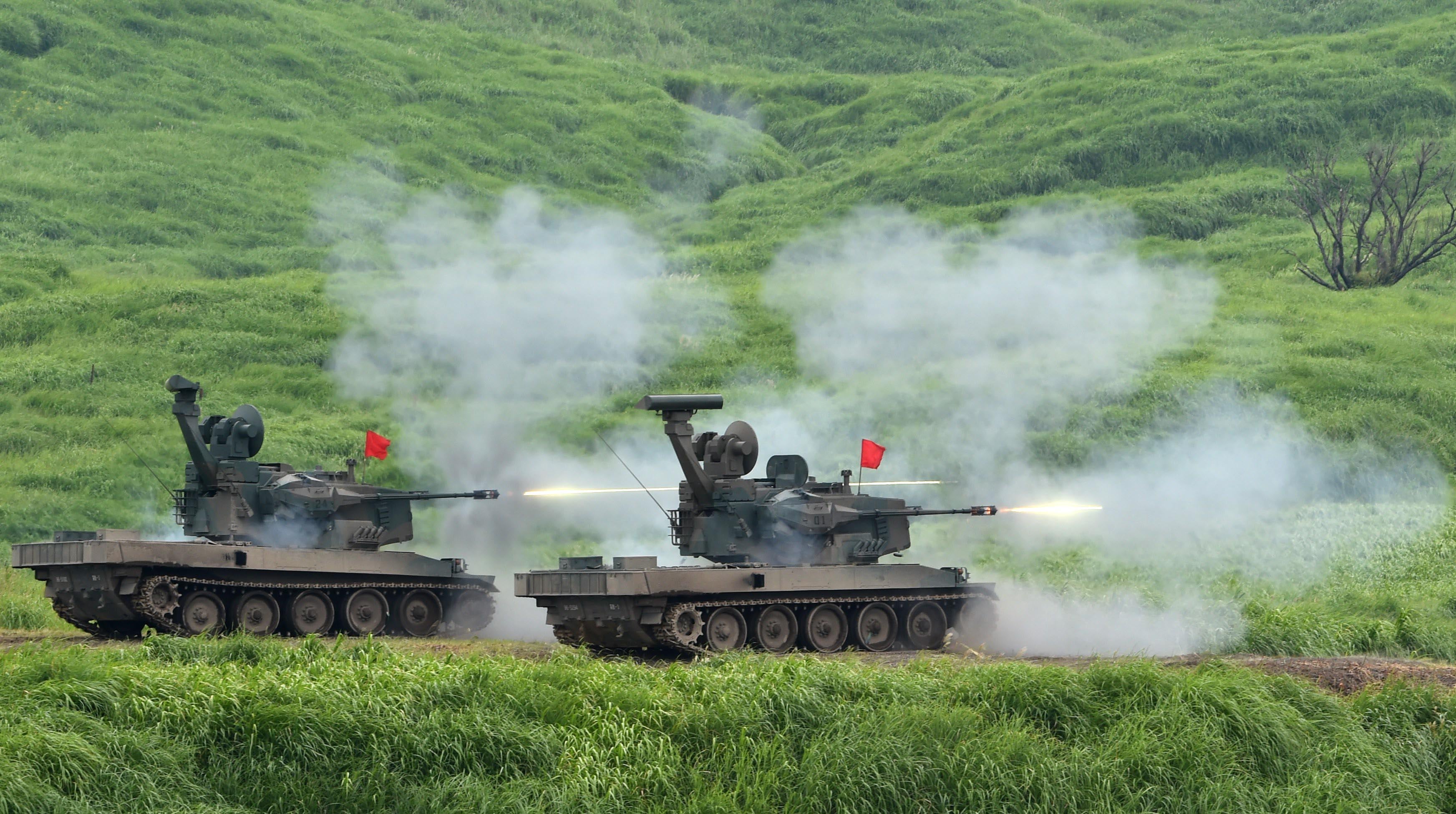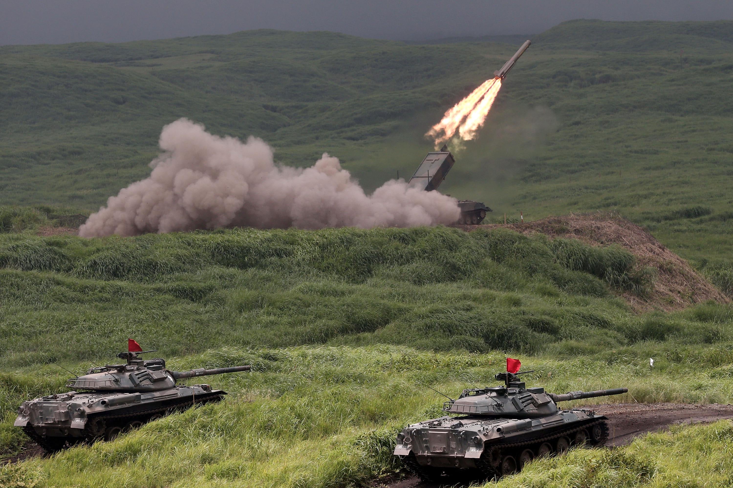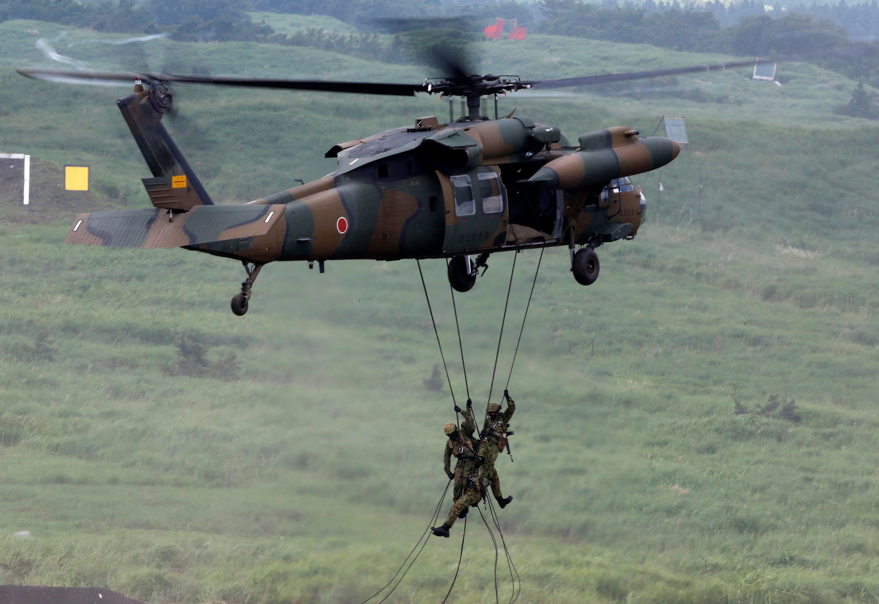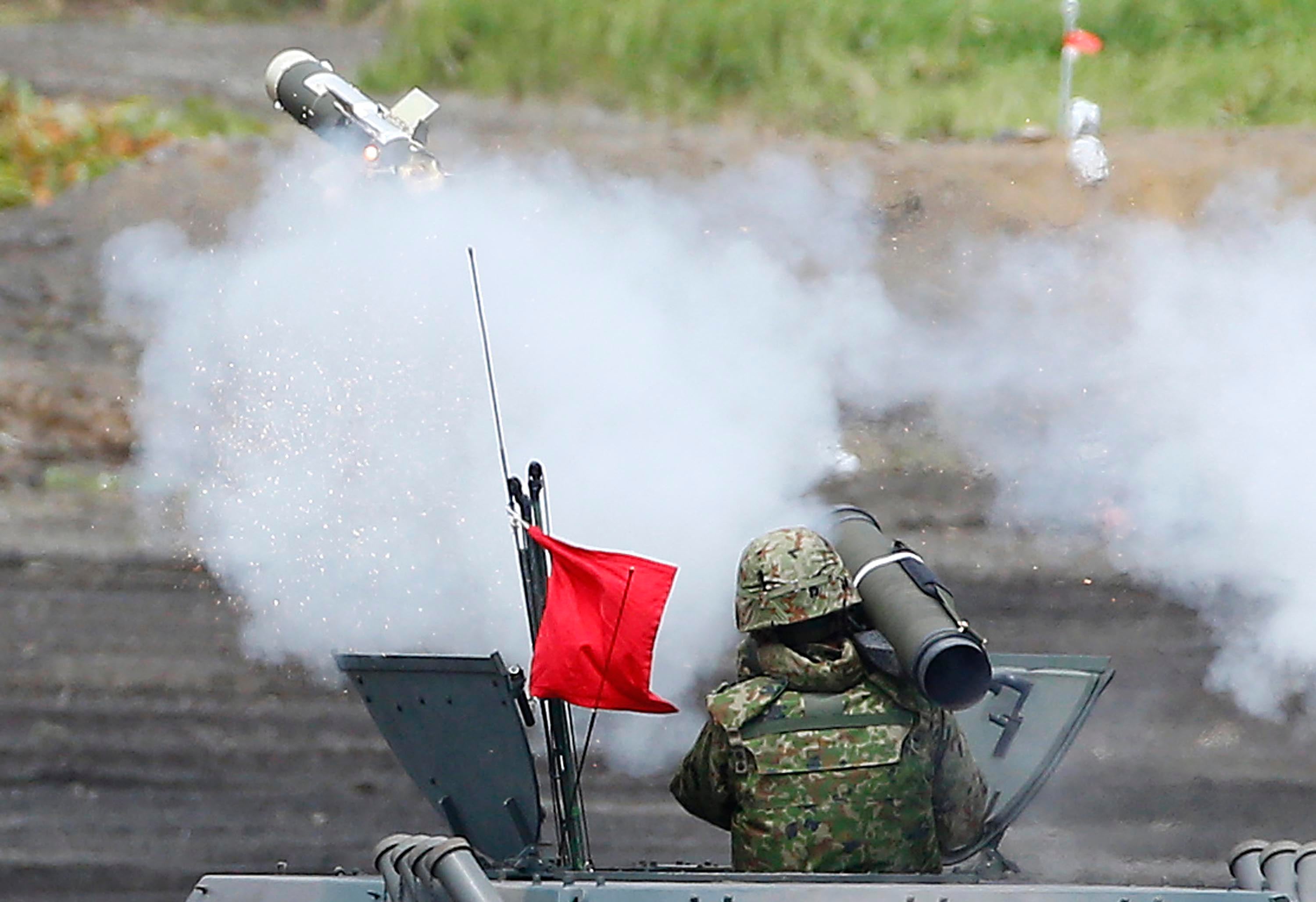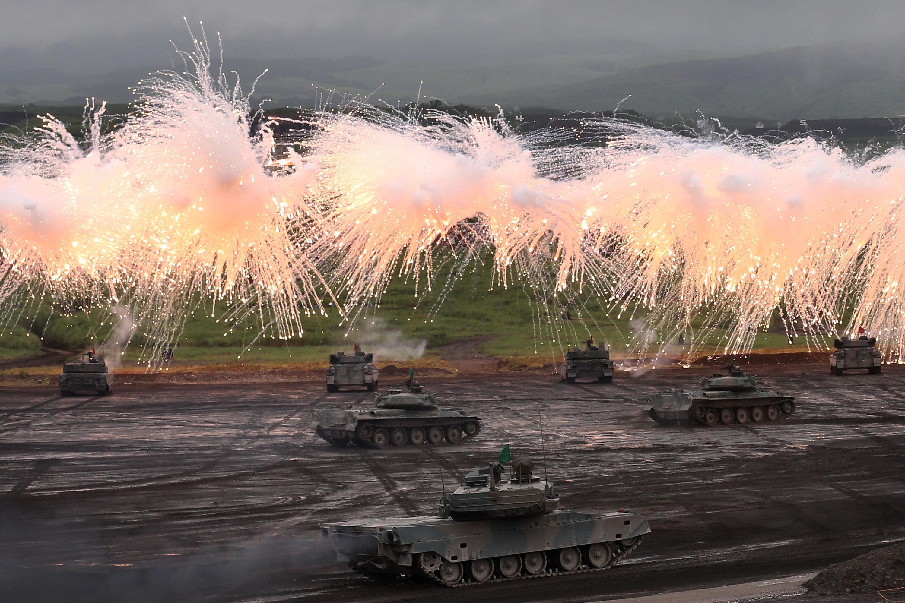 Japan Ground Self Defense Forces' AH-1S helicopter fires a TOW anti-tank missile during an exercise in its Higashi-Fuji training ground in Gotemba, some 100 kilometre west of Tokyo on August 19, 2014. A total of 2,300 personnels, 80 tanks and armoured vehicles, 20 aircrafts and 600 vehicles participated in the exercise. AFP PHOTO / TOSHIFUMI KITAMURATOSHIFUMI KITAMURA/AFP/Getty ImagesGOTEMBA, JAPAN - AUGUST 19: A Type 92 Mine Cleaning tank fires during the Japan Ground Self-Defense Force annual live fire exercise at East Fuji Maneuver Area on August 19, 2014 in Gotemba, Japan. (Photo by Chris McGrath/Getty Images) *** BESTPIX ***GOTEMBA, JAPAN - AUGUST 19: Tanks fire during the Japan Ground Self-Defense Force annual live fire exercise at East Fuji Maneuver Area on August 19, 2014 in Gotemba, Japan. (Photo by Chris McGrath/Getty Images)A member of the Japan Ground Self-Defense Force launches a hand-held anti-tank rocket during an annual live firing exercise at Higashi Fuji range in Gotemba, southwest of Tokyo, Tuesday, Aug. 19, 2014. (AP Photo/Shizuo Kambayashi)Members of the Japan Ground Self-Defense Force rappel down from a UH-60JA helicopter during an annual live firing exercise at Higashi Fuji range in Gotemba, southwest of Tokyo, Tuesday, Aug. 19, 2014. (AP Photo/Shizuo Kambayashi)A Type-10 tank of the Japan Ground Self-Defense Force fires at targets during an annual live firing exercise at Higashi Fuji range in Gotemba, southwest of Tokyo, Tuesday, Aug. 19, 2014. (AP Photo/Shizuo Kambayashi)A Japan Ground Self Defense Forces' CH-47 helicopter unloads a vehicle during an exercise in its Higashi-Fuji training ground in Gotemba, some 100 kilometre west of Tokyo on August 19, 2014. A total of 2,300 personnels, 80 tanks and armoured vehicles, 20 aircrafts and 600 vehicles participated in the exercise. AFP PHOTO / TOSHIFUMI KITAMURATOSHIFUMI KITAMURA/AFP/Getty ImagesJapan Ground Self Defense Forces' type 87 self-propelled anti-aircraft guns fire during an exercise in its Higashi-Fuji training ground in Gotemba, some 100 kilometre west of Tokyo on August 19, 2014. A total of 2,300 personnels, 80 tanks and armoured vehicles, 20 aircrafts and 600 vehicles participated in the exercise. AFP PHOTO / TOSHIFUMI KITAMURATOSHIFUMI KITAMURA/AFP/Getty ImagesJapan Ground Self Defense Forces' tanks and armoured vehicles move underneath the umbrellas of curtain fires while helicopters fly by during an exercise in its Higashi-Fuji training ground in Gotemba, some 100 kilometre west of Tokyo on August 19, 2014. A total of 2,300 personnels, 80 tanks and armoured vehicles, 20 aircrafts and 600 vehicles participated in the exercise. AFP PHOTO / TOSHIFUMI KITAMURATOSHIFUMI KITAMURA/AFP/Getty Images
