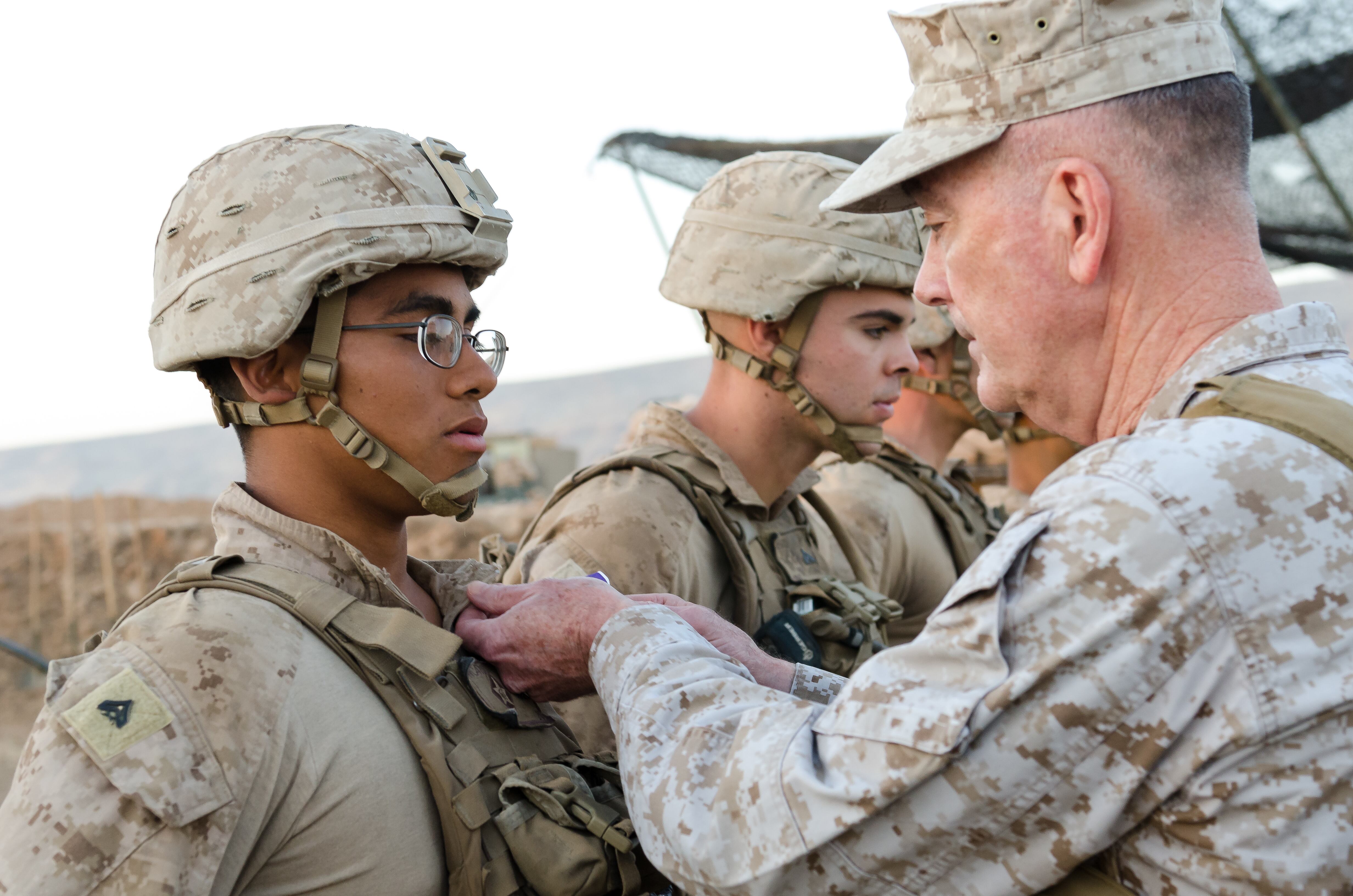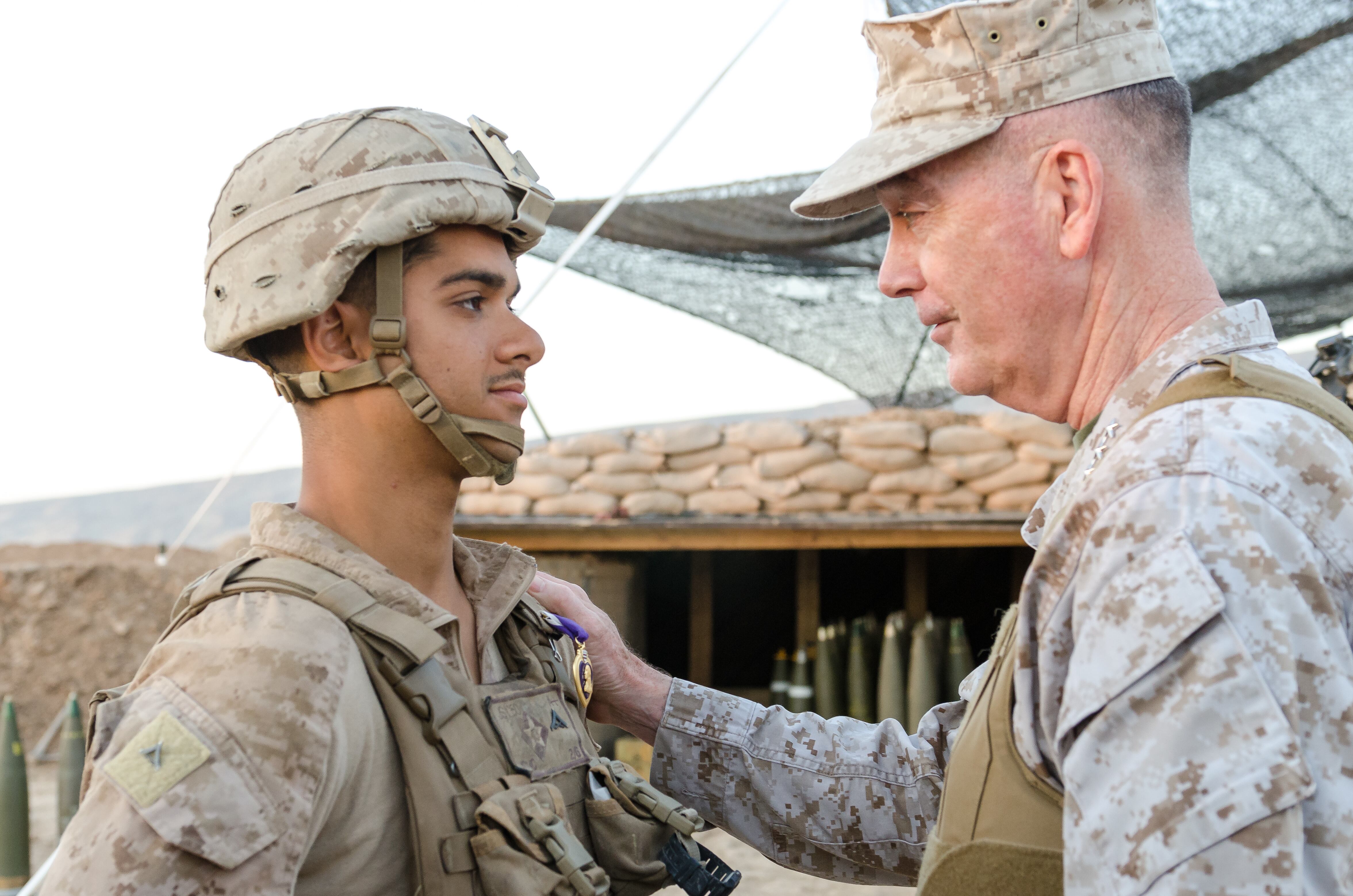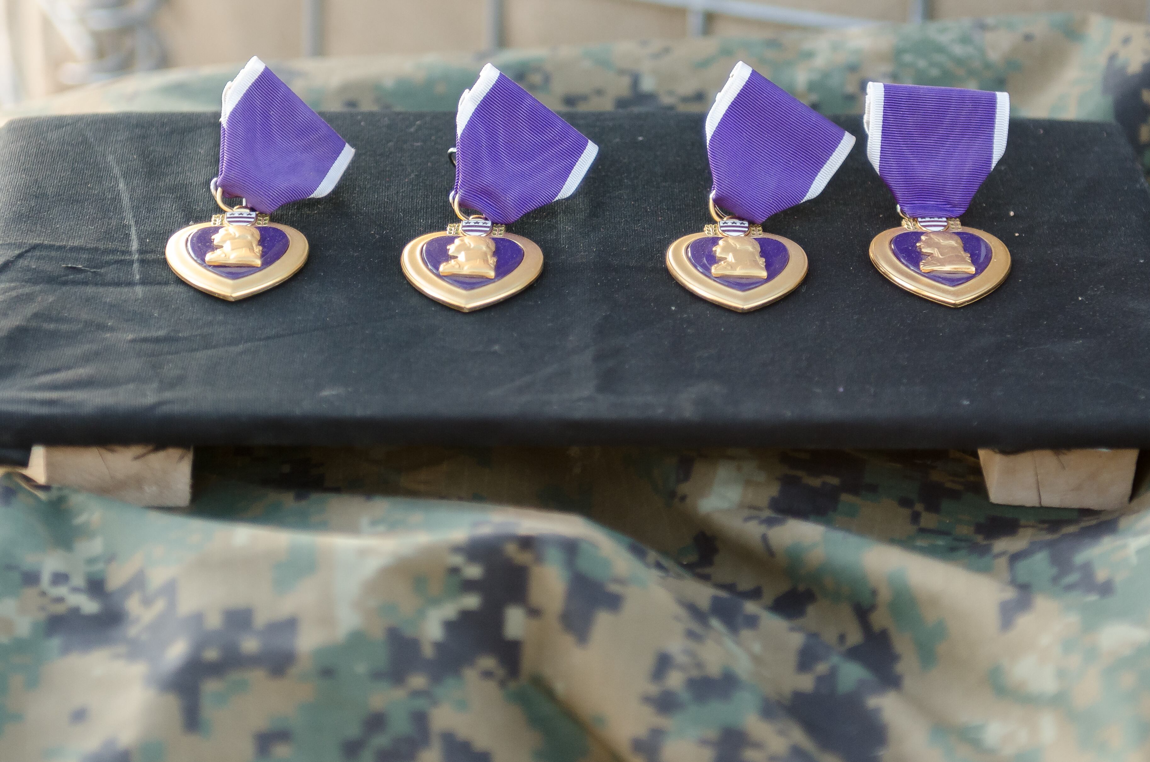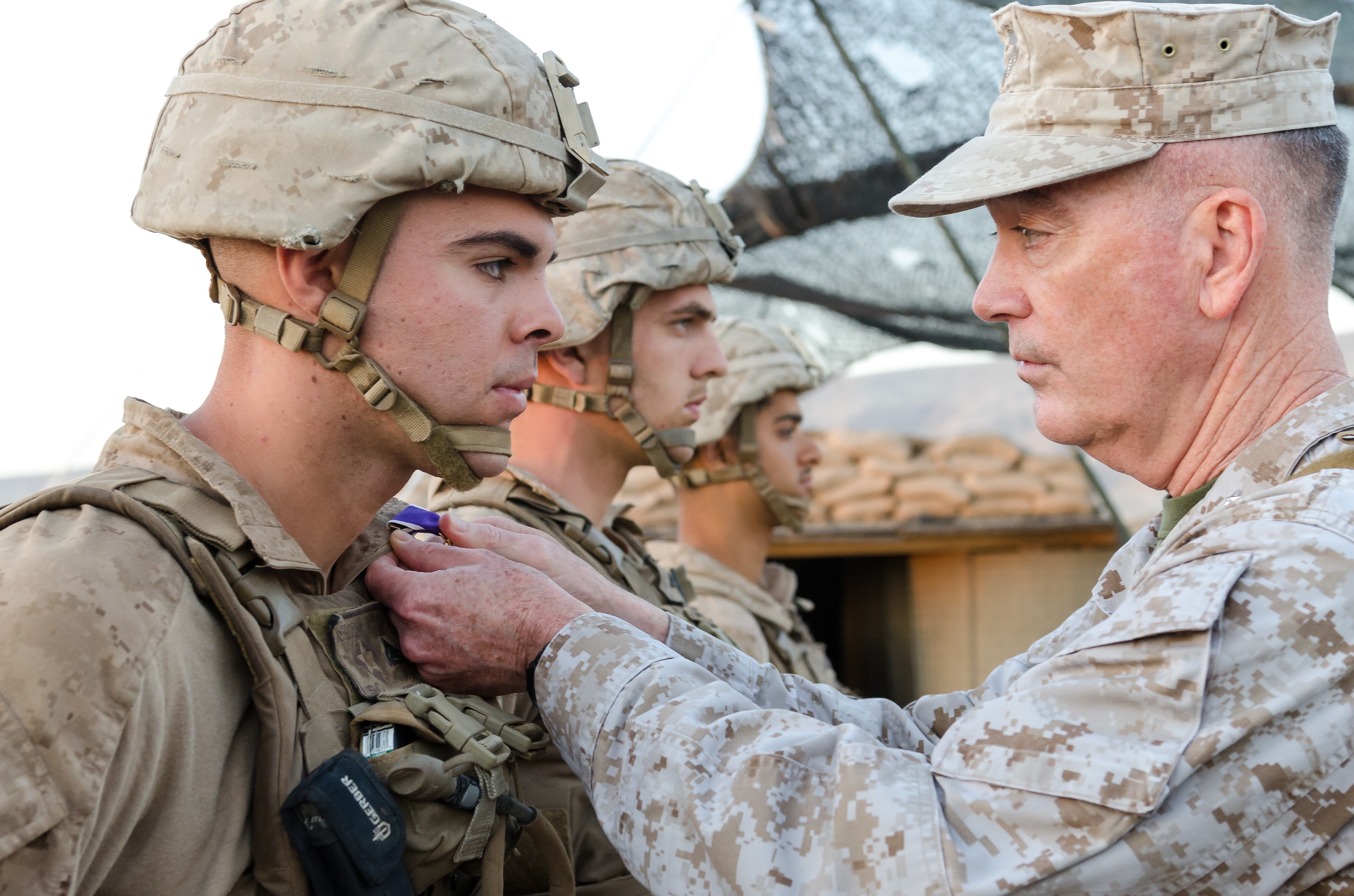 Chairman of the Joint Chiefs of Staff Gen. Joseph Dunford listens to award orders being read as he prepares to present Purple Hearts to U.S. Marines Cpl. Adam J. Seanor, a native of Montgomery, Pennsylvania, Cpl. William Crisostomosfelipe, a native of Orange, California, Lance Cpl. Eli Cisco, a native of Mingo, West Virginia and Lance Cpl. Javier A. Suarezmontalvo, a native of Orange, Florida, during a ceremony at Kara Soar Base, Makhmur, Iraq, April 22, 2016. The Marines, all field artillery cannon crewmen assigned to Battery E, 26th Marine Expeditionary Unit, were awarded Purple Hearts at the very site they were wounded. (U.S. Army Photo by Staff Sgt. Peter J. Berardi)The Purple Heart was established by Gen. George Washington at Newburgh, New York, Aug. 7, 1782, during the Revolutionary War. It was reestablished by the President Herbert Hoover in 1932 and is now awarded in the name of the president to U.S. service members who are wounded or killed in combat. These four medals were presented to U.S. Marines Cpl. Adam J. Seanor, a native of Montgomery, Pennsylvania, Cpl. William Crisostomosfelipe, a native of Orange, California, Lance Cpl. Eli Cisco, a native of Mingo, West Virginia and Lance Cpl. Javier A. Suarezmontalvo, a native of Orange, Florida, during a ceremony at Kara Soar Base, Makhmur, Iraq, April 22, 2016. The Marines, all field artillery cannon crewmen assigned to Battery E, 26th Marine Expeditionary Unit, were awarded their Purple Hearts at the very site they were wounded. (U.S. Army Photo by Staff Sgt. Peter J. Berardi)Chairman of the Joint Chiefs of Staff Gen. Joseph Dunford presents U.S. Marine Cpl. William Crisostomosfelipe, a native of Orange, California, with the Purple Heart during a ceremony at Kara Soar Base, Makhmur, Iraq, April 22, 2016. Crisostomosfelipe, a field artillery cannon crewman assigned to Battery E, 26th Marine Expeditionary Unit, was awarded his Purple Hearts at the very site he was wounded March 19. (U.S. Army Photo by Staff Sgt. Peter J. Berardi)Chairman of the Joint Chiefs of Staff Gen. Joseph Dunford presents U.S. Marine Cpl. Adam J. Seanor, a native of Montgomery, Pennsylvania, with the Purple Heart during a ceremony at Kara Soar Base, Makhmur, Iraq, April 22, 2016. Seanor, a field artillery cannon crewman assigned to Battery E, 26th Marine Expeditionary Unit, was awarded his Purple Heart at the very site he was wounded March 19. (U.S. Army Photo by Staff Sgt. Peter J. Berardi)Chairman of the Joint Chiefs of Staff Gen. Joseph Dunford presents U.S. Marine Lance Cpl. Eli Cisco, a native of Mingo, West Virginia, with the Purple Heart during a ceremony at Kara Soar Base, Makhmur, Iraq, April 22, 2016. Cisco, a field artillery cannon crewman assigned to Battery E, 26th Marine Expeditionary Unit, was awarded his Purple Heart at the very site he was wounded March 19. “I don't know anybody else that's actually received a Purple Heart at the point of injury,” said Dunford. (U.S. Army Photo by Staff Sgt. Peter J. Berardi)Chairman of the Joint Chiefs of Staff Gen. Joseph Dunford presents U.S. Marine Lance Cpl. Javier A. Suarezmontalvo, a native of Orange, Florida, during a ceremony at Kara Soar Base, Makhmur, Iraq, April 22, 2016. Suarezmontalvo, a field artillery cannon crewman assigned to Battery E, 26th Marine Expeditionary Unit, was awarded his Purple Heart at the very site he was wounded March 19. (U.S. Army Photo by Staff Sgt. Peter J. Berardi)Chairman of the Joint Chiefs of Staff Gen. Joseph Dunford visits with U.S. Marines of the 26th Marine Expeditionary Unit at Kara Soar Base, Makhmur, Iraq, April 22, 2016, after presenting four Marines with the Purple Heart. (U.S. Army Photo by Staff Sgt. Peter J. Berardi)U.S. Marine Cpl. William Crisostomosfelipe, 22, a field artillery cannon crewman with Battery E, 26th Marine Expeditionary Unit, and a native of Orange, California, receives the Purple Heart during a ceremony at Kara Soar Base, Makhmur, Iraq, April 22, 2016. Crisostomosfelipe, along with three other Marines, was awarded his Purple Heart by Chairman of the Joint Chiefs of Staff Gen. Joseph Dunford at the very site he was wounded. “I don’t know anybody else that’s actually received a Purple Heart at the point of injury,” said Dunford. “When you go back home it’ll be hard to explain, hard to tell people exactly the impact you are having, but I hope you recognize that’s the absolute truth, and you are making a difference out here and, we recognize and appreciate what you’re doing.” (U.S. Army Photo by Staff Sgt. Peter J. Berardi)