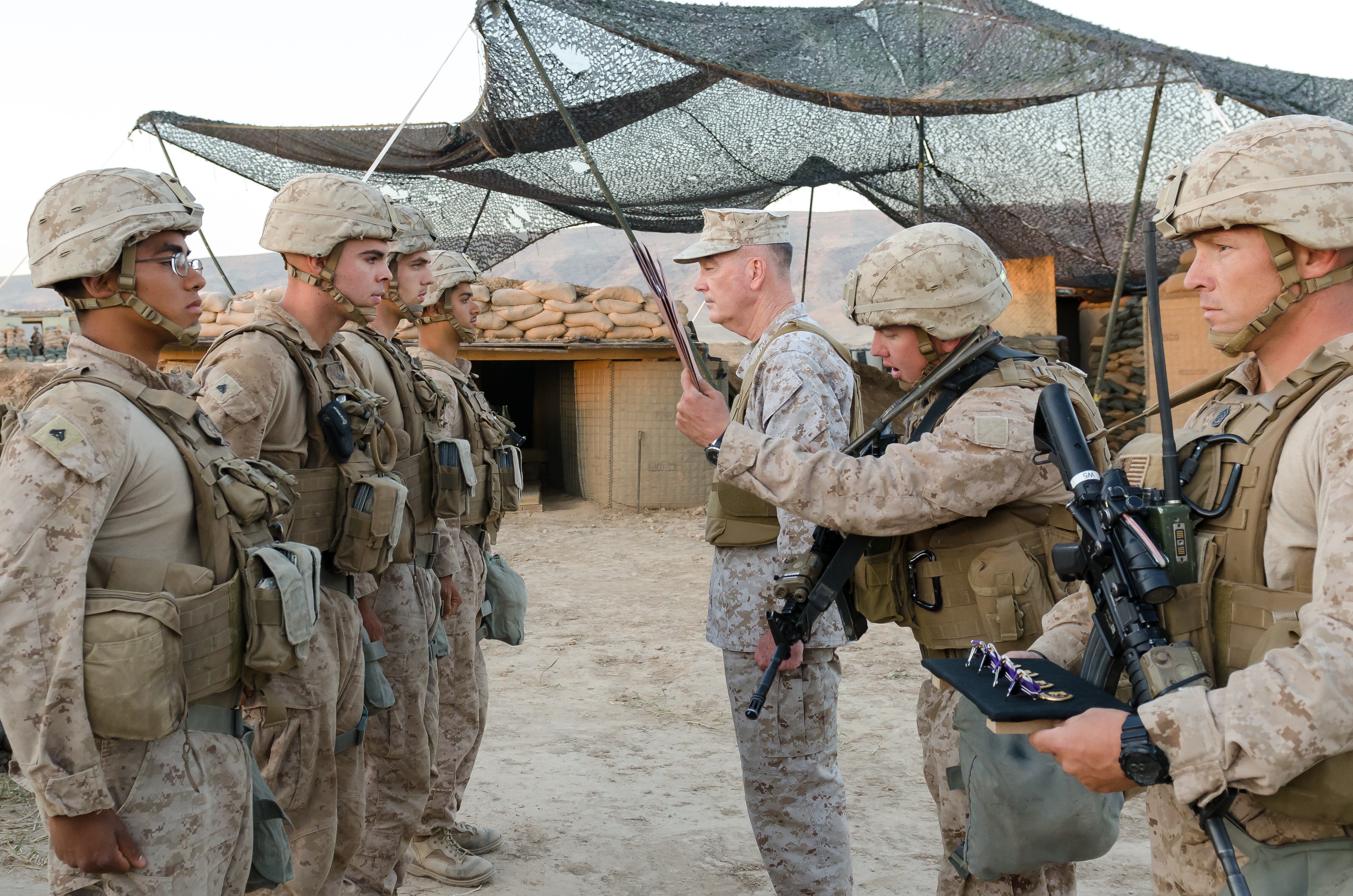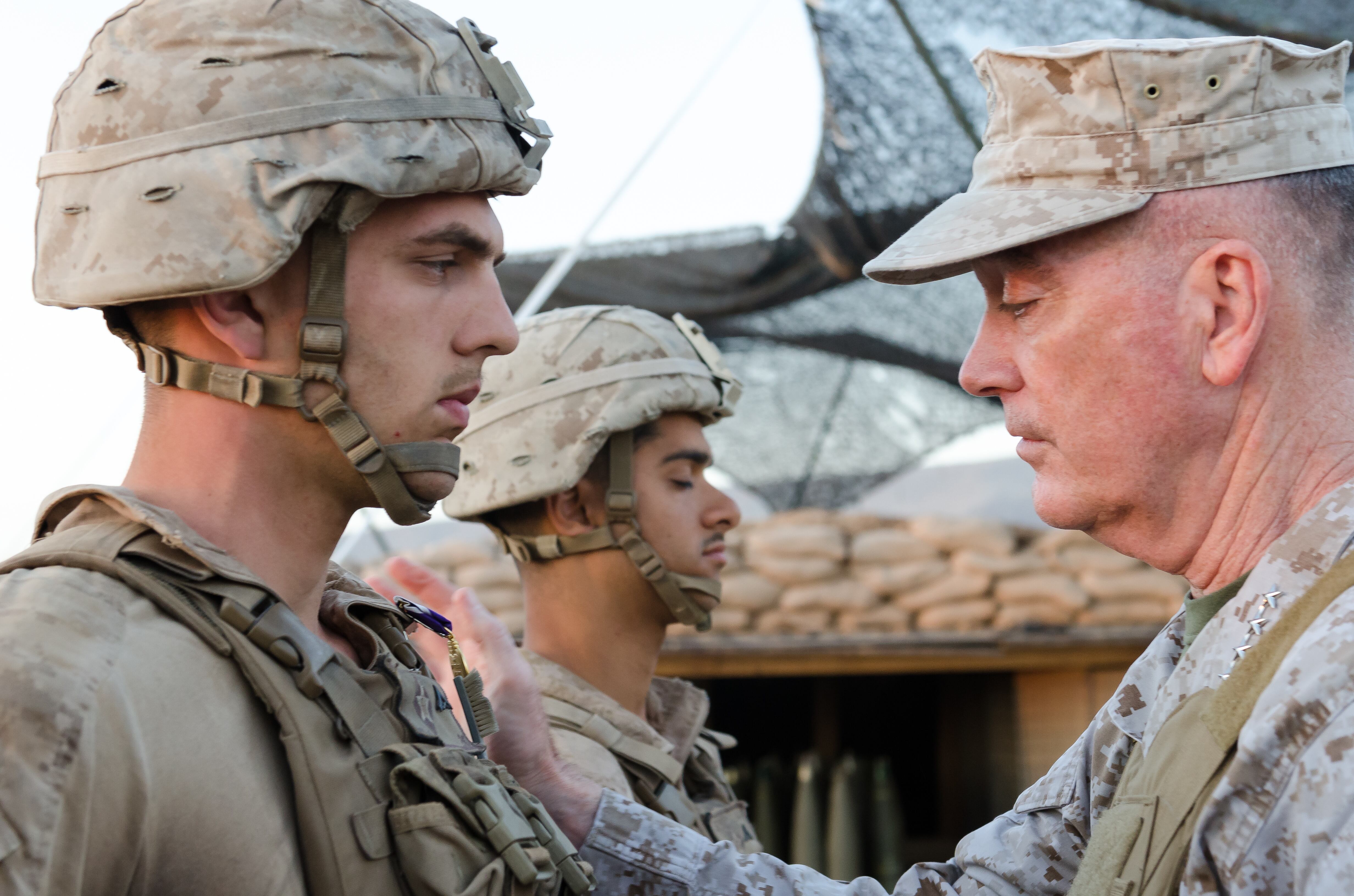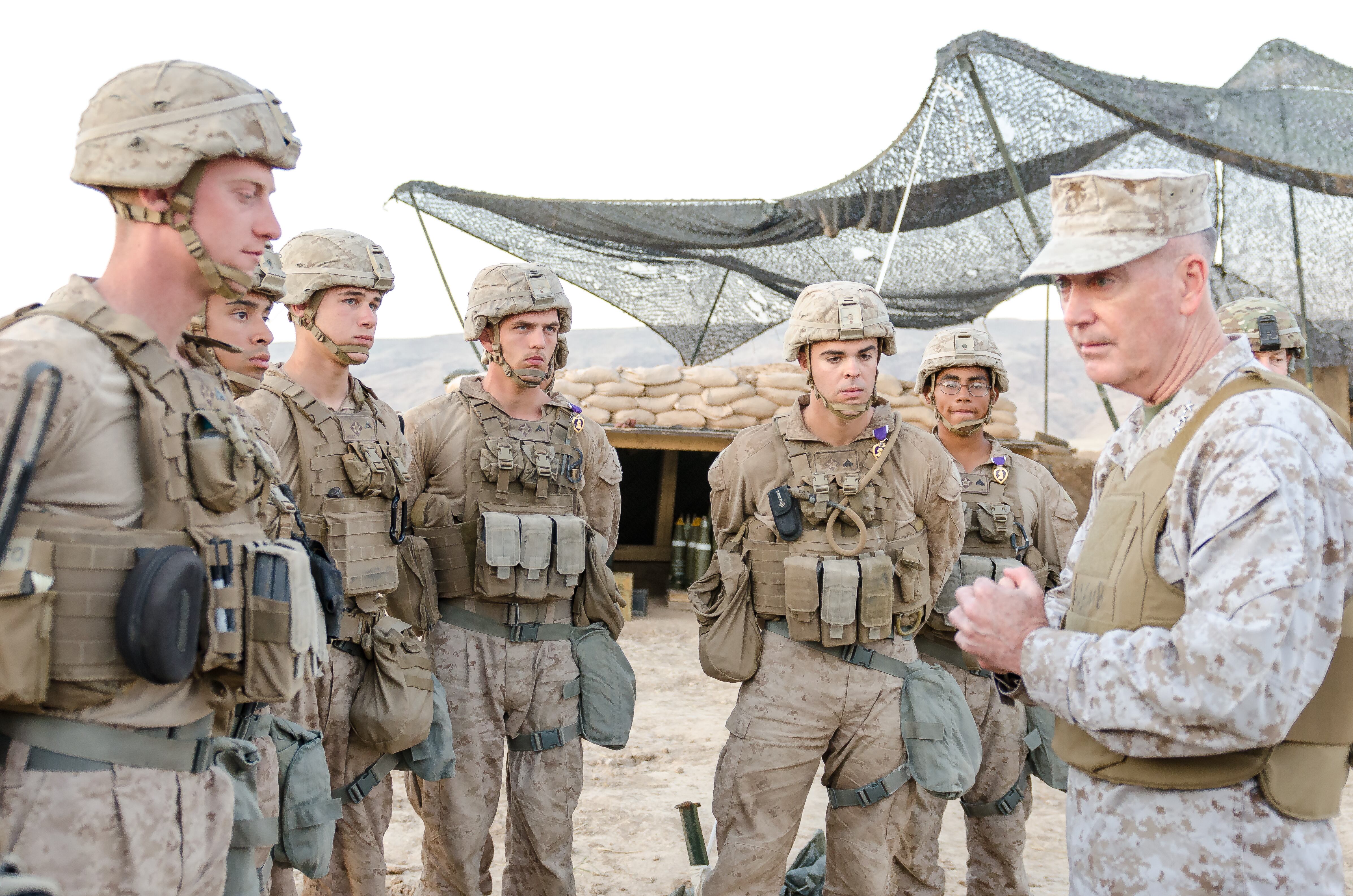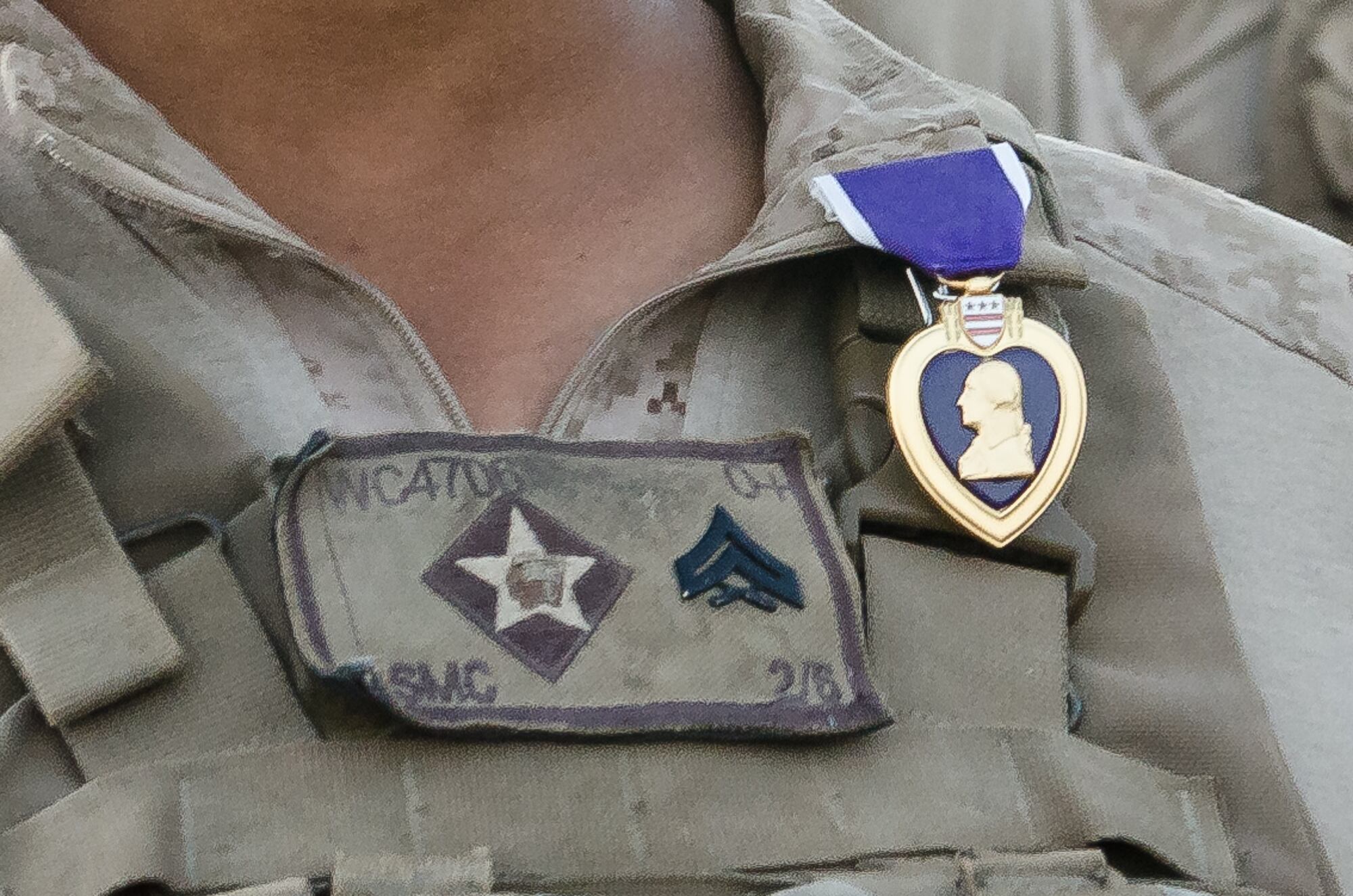 Chairman of the Joint Chiefs of Staff Gen. Joseph Dunford listens to award orders being read as he prepares to present Purple Hearts to U.S. Marines Cpl. Adam J. Seanor, a native of Montgomery, Pennsylvania, Cpl. William Crisostomosfelipe, a native of Orange, California, Lance Cpl. Eli Cisco, a native of Mingo, West Virginia and Lance Cpl. Javier A. Suarezmontalvo, a native of Orange, Florida, during a ceremony at Kara Soar Base, Makhmur, Iraq, April 22, 2016. The Marines, all field artillery cannon crewmen assigned to Battery E, 26th Marine Expeditionary Unit, were awarded Purple Hearts at the very site they were wounded. (U.S. Army Photo by Staff Sgt. Peter J. Berardi)The Purple Heart was established by Gen. George Washington at Newburgh, New York, Aug. 7, 1782, during the Revolutionary War. It was reestablished by the President Herbert Hoover in 1932 and is now awarded in the name of the president to U.S. service members who are wounded or killed in combat. These four medals were presented to U.S. Marines Cpl. Adam J. Seanor, a native of Montgomery, Pennsylvania, Cpl. William Crisostomosfelipe, a native of Orange, California, Lance Cpl. Eli Cisco, a native of Mingo, West Virginia and Lance Cpl. Javier A. Suarezmontalvo, a native of Orange, Florida, during a ceremony at Kara Soar Base, Makhmur, Iraq, April 22, 2016. The Marines, all field artillery cannon crewmen assigned to Battery E, 26th Marine Expeditionary Unit, were awarded their Purple Hearts at the very site they were wounded. (U.S. Army Photo by Staff Sgt. Peter J. Berardi)Chairman of the Joint Chiefs of Staff Gen. Joseph Dunford presents U.S. Marine Cpl. William Crisostomosfelipe, a native of Orange, California, with the Purple Heart during a ceremony at Kara Soar Base, Makhmur, Iraq, April 22, 2016. Crisostomosfelipe, a field artillery cannon crewman assigned to Battery E, 26th Marine Expeditionary Unit, was awarded his Purple Hearts at the very site he was wounded March 19. (U.S. Army Photo by Staff Sgt. Peter J. Berardi)Chairman of the Joint Chiefs of Staff Gen. Joseph Dunford presents U.S. Marine Cpl. Adam J. Seanor, a native of Montgomery, Pennsylvania, with the Purple Heart during a ceremony at Kara Soar Base, Makhmur, Iraq, April 22, 2016. Seanor, a field artillery cannon crewman assigned to Battery E, 26th Marine Expeditionary Unit, was awarded his Purple Heart at the very site he was wounded March 19. (U.S. Army Photo by Staff Sgt. Peter J. Berardi)Chairman of the Joint Chiefs of Staff Gen. Joseph Dunford presents U.S. Marine Lance Cpl. Eli Cisco, a native of Mingo, West Virginia, with the Purple Heart during a ceremony at Kara Soar Base, Makhmur, Iraq, April 22, 2016. Cisco, a field artillery cannon crewman assigned to Battery E, 26th Marine Expeditionary Unit, was awarded his Purple Heart at the very site he was wounded March 19. “I don't know anybody else that's actually received a Purple Heart at the point of injury,” said Dunford. (U.S. Army Photo by Staff Sgt. Peter J. Berardi)Chairman of the Joint Chiefs of Staff Gen. Joseph Dunford presents U.S. Marine Lance Cpl. Javier A. Suarezmontalvo, a native of Orange, Florida, during a ceremony at Kara Soar Base, Makhmur, Iraq, April 22, 2016. Suarezmontalvo, a field artillery cannon crewman assigned to Battery E, 26th Marine Expeditionary Unit, was awarded his Purple Heart at the very site he was wounded March 19. (U.S. Army Photo by Staff Sgt. Peter J. Berardi)Chairman of the Joint Chiefs of Staff Gen. Joseph Dunford visits with U.S. Marines of the 26th Marine Expeditionary Unit at Kara Soar Base, Makhmur, Iraq, April 22, 2016, after presenting four Marines with the Purple Heart. (U.S. Army Photo by Staff Sgt. Peter J. Berardi)U.S. Marine Cpl. William Crisostomosfelipe, 22, a field artillery cannon crewman with Battery E, 26th Marine Expeditionary Unit, and a native of Orange, California, receives the Purple Heart during a ceremony at Kara Soar Base, Makhmur, Iraq, April 22, 2016. Crisostomosfelipe, along with three other Marines, was awarded his Purple Heart by Chairman of the Joint Chiefs of Staff Gen. Joseph Dunford at the very site he was wounded. “I don’t know anybody else that’s actually received a Purple Heart at the point of injury,” said Dunford. “When you go back home it’ll be hard to explain, hard to tell people exactly the impact you are having, but I hope you recognize that’s the absolute truth, and you are making a difference out here and, we recognize and appreciate what you’re doing.” (U.S. Army Photo by Staff Sgt. Peter J. Berardi)