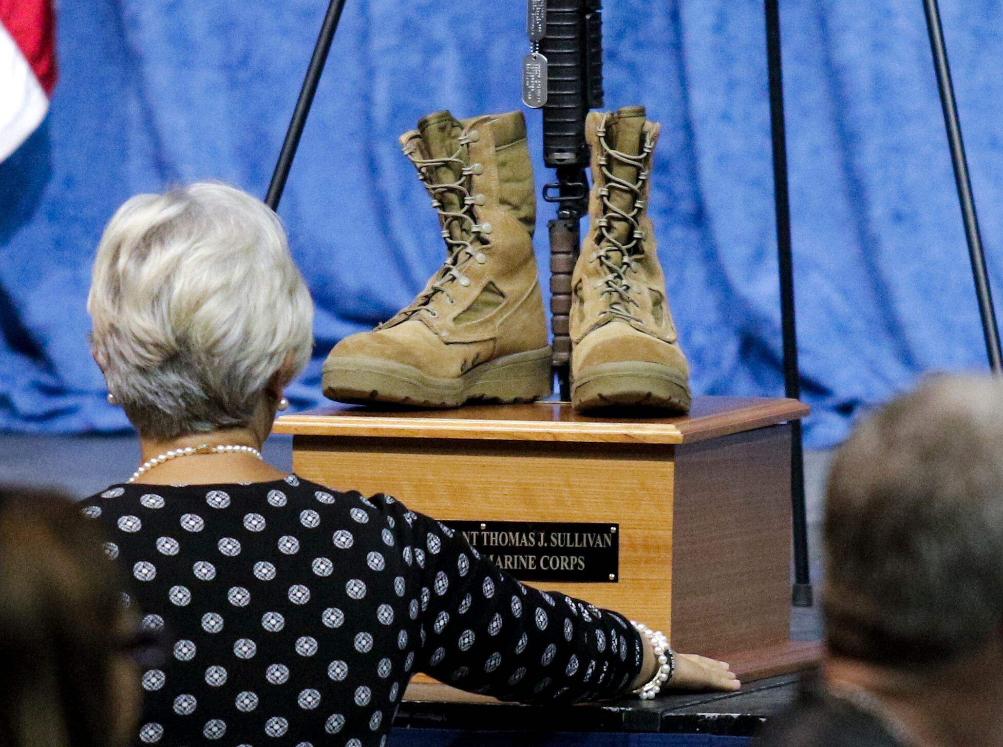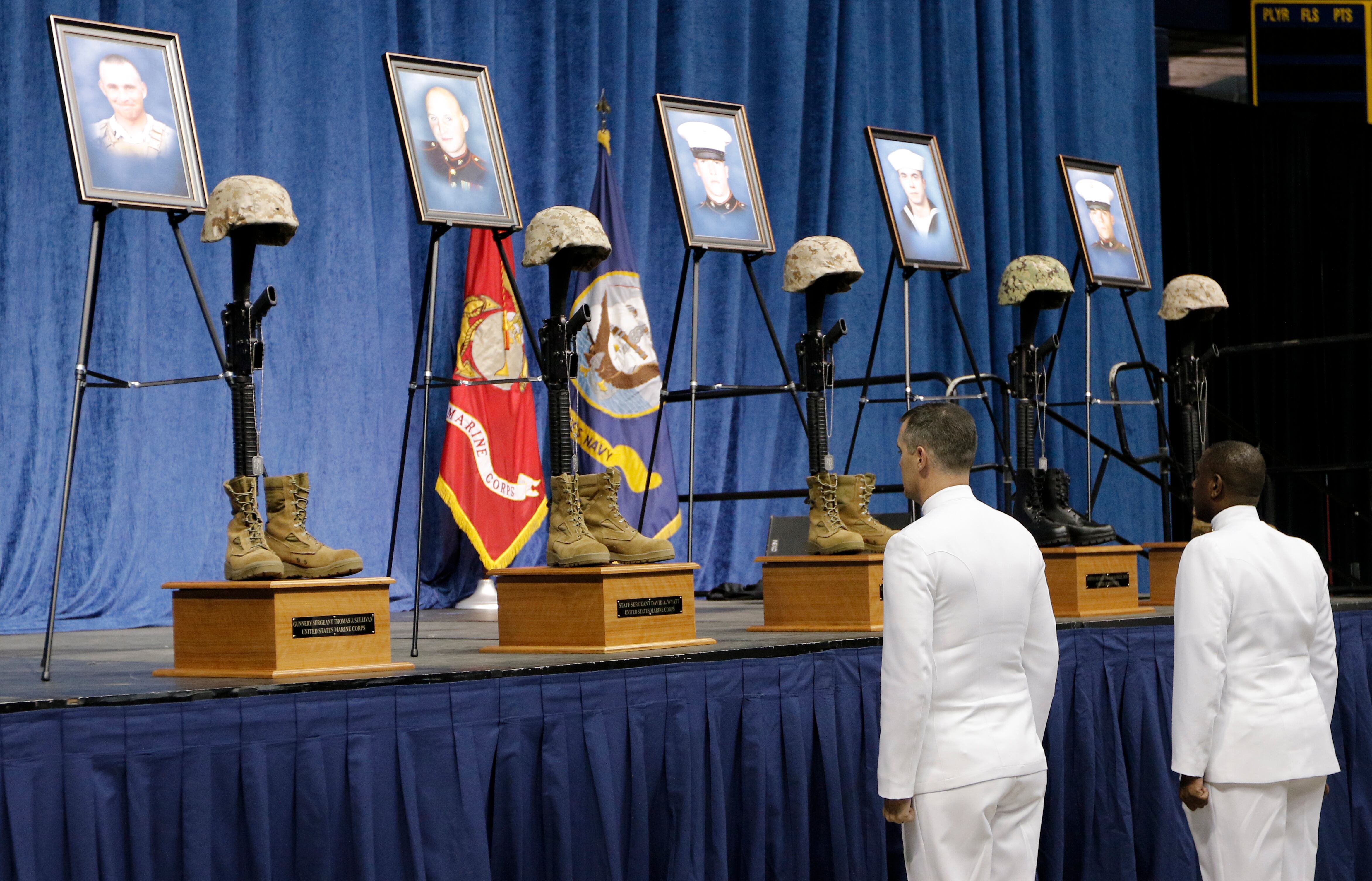 CHATTANOOGA, TN - AUGUST 15: U.S. Vice President Joe Biden pauses as he speaks at a memorial service to honor those killed In Chattanooga shooting at University of Tennessee at Chattanooga's McKenzie Arena on August 15, 2015 in Chattanooga, Tennessee. The military is putting on the ceremony to honor the sailor and four Marines killed and to say thank you to the men and women who helped responded when Mohammad Abdulazeez shot up a military recruitment center and a Navy operations support center before being killed by law enforcement, (Photo by Jason Davis/Getty Images)A woman touches the boots on the battlefield cross for Gunnery Sgt. Thomas Sullivan at a memorial for the five military servicemen killed in the July, 16, attacks on two military facilities held Saturday, Aug. 15, 2015, at McKenzie Arena in Chattanooga, Tenn. Vice President Joseph Biden and Secretary of Defense Ash Carter spoke along with representatives from the U.S. Navy and Marine Corps. (Doug Strickland/Chattanooga Times Free Press via AP) U.S. Marines stand during taps at a memorial for the five military servicemen killed in the July, 16, attacks on two military facilities held Saturday, Aug. 15, 2015, at McKenzie Arena in Chattanooga, Tenn. Vice President Joseph Biden and Secretary of Defense Ash Carter spoke along with representatives from the U.S. Navy and Marine Corps. (Doug Strickland/Chattanooga Times Free Press via AP) U.S. Navy officers pay their respects at the battlefield crosses for the fallen servicemen at a memorial for the five military servicemen killed in the July, 16, attacks on two military facilities held Saturday, Aug. 15, 2015, at McKenzie Arena in Chattanooga, Tenn. Vice President Joseph Biden and Secretary of Defense Ash Carter spoke along with representatives from the U.S. Navy and Marine Corps. (Doug Strickland/Chattanooga Times Free Press via AP) Marines, family and friends listen to the Benediction at a memorial service Saturday, Aug. 15, 2015, in Chattanooga, Tenn. The service is for four Marines and a sailor killed as a result of attacks on a military recruiting station and a Naval operations center July 16 in Chattanooga. (AP Photo/Mark Gilliland)Navy Sailors appauld as Vice President Joe Biden finishes his speech at a memorial service Saturday, Aug. 15, 2015, in Chattanooga, Tenn. The service is for four Marines and a sailor killed as a result of attacks on a military recruiting station and a Naval operations center July 16 in Chattanooga. (AP Photo/Mark Gilliland)CHATTANOOGA, TN - AUGUST 15: U.S. Secretary of Defense Ash Carter speaks at a memorial service to honor those killed In Chattanooga shooting at University of Tennessee at Chattanooga's McKenzie Arena on August 15, 2015 in Chattanooga, Tennessee. The military is putting on the ceremony to honor the sailor and four Marines killed and to say thank you to the men and women who helped responded when Mohammad Abdulazeez shot up a military recruitment center and a Navy operations support center before being killed by law enforcement, (Photo by Jason Davis/Getty Images)Sailors and their families at a memorial service Saturday, Aug. 15, 2015, in Chattanooga, Tenn. The service is for four Marines and a sailor killed as a result of attacks on a military recruiting station and a Naval operations center July 16 in Chattanooga. (AP Photo/Mark Gilliland)Chattanooga Mayor Andy Berke speaks to the crowd at a memorial service Saturday, Aug. 15, 2015, in Chattanooga, Tenn. The service is for four Marines and a sailor killed as a result of attacks on a military recruiting station and a Naval operations center July 16 in Chattanooga. (AP Photo/Mark Gilliland)Sailors bow their head during the benediction at a memorial service Saturday, Aug. 15, 2015, in Chattanooga, Tenn. The service is for four Marines and a sailor killed as a result of attacks on a military recruiting station and a Naval operations center July 16 in Chattanooga. (AP Photo/Mark Gilliland)CHATTANOOGA, TN - AUGUST 15: Secretary of the Navy - Ray Mabus speaks at a memorial service to honor those killed In Chattanooga shooting at University of Tennessee at Chattanooga's McKenzie Arena on August 15, 2015 in Chattanooga, Tennessee. The military is putting on the ceremony to honor the sailor and four Marines killed and to say thank you to the men and women who helped responded when Mohammad Abdulazeez shot up a military recruitment center and a Navy operations support center before being killed by law enforcement, (Photo by Jason Davis/Getty Images)CHATTANOOGA, TN - AUGUST 15: Officer of Navy Operational Support Center Chattanooga - Lieutenant Commander Timothy White speaks at a memorial service to honor those killed In Chattanooga shooting at University of Tennessee at Chattanooga's McKenzie Arena on August 15, 2015 in Chattanooga, Tennessee. The military is putting on the ceremony to honor the sailor and four Marines killed and to say thank you to the men and women who helped responded when Mohammad Abdulazeez shot up a military recruitment center and a Navy operations support center before being killed by law enforcement, (Photo by Jason Davis/Getty Images)CHATTANOOGA, TN - AUGUST 15: (L-R) A memorial for Gunner Sergeant Thomas J. Sullivan, Staff Sergeant David A. Wyatt, Sergeant Carson A. Holmquist - United States Marine Corp, Logistics Specialist 2nd Class Randall S. Smith - United States Navy and Lance Corporal Squire K. Wells - United States Marine Corps is displayed on stage at a memorial service to honor those killed In Chattanooga shooting at University of Tennessee at Chattanooga's McKenzie Arena on August 15, 2015 in Chattanooga, Tennessee. The military is putting on the ceremony to honor the sailor and four Marines killed and to say thank you to the men and women who helped responded when Mohammad Abdulazeez shot up a military recruitment center and a Navy operations support center before being killed by law enforcement, (Photo by Jason Davis/Getty Images)