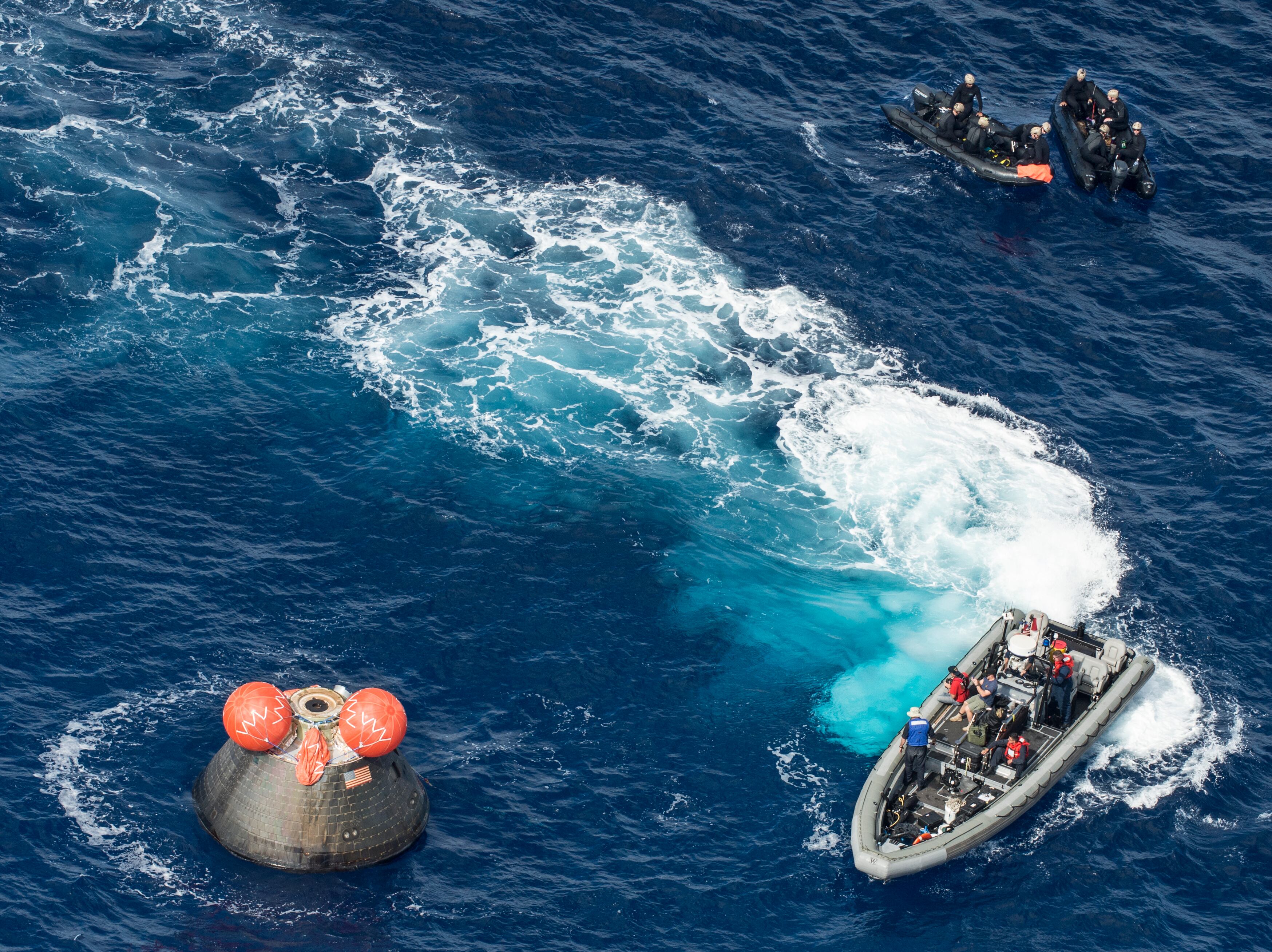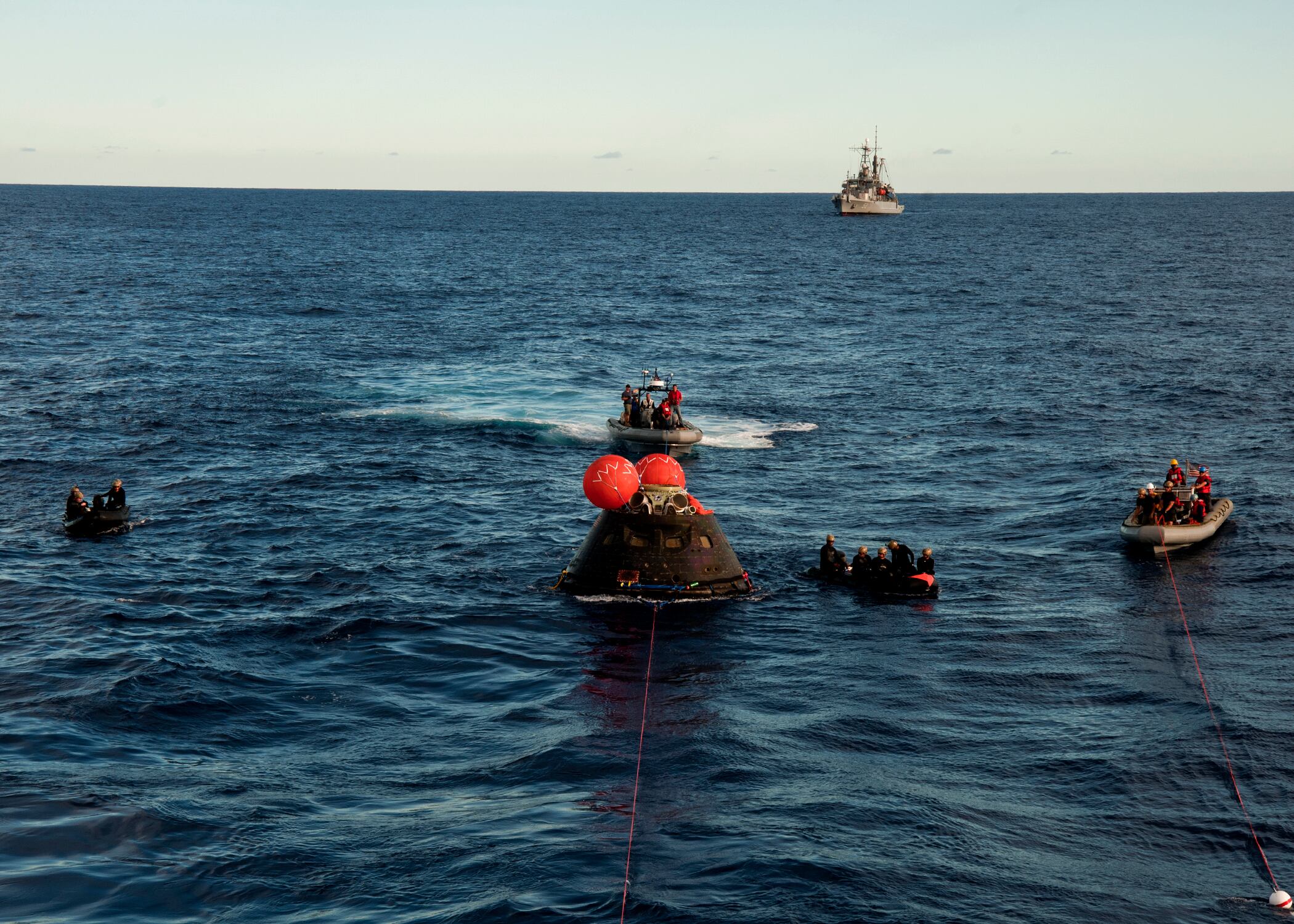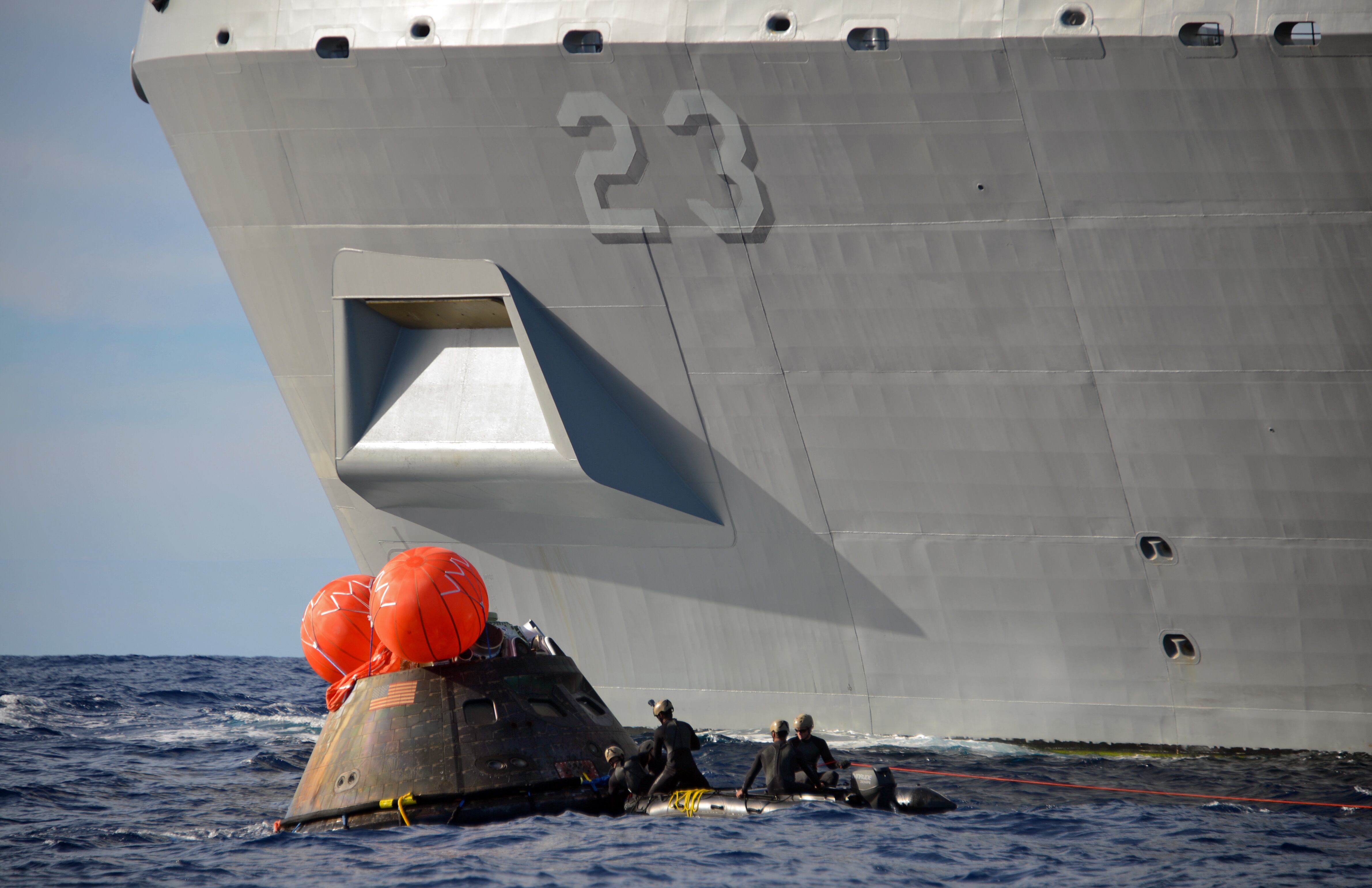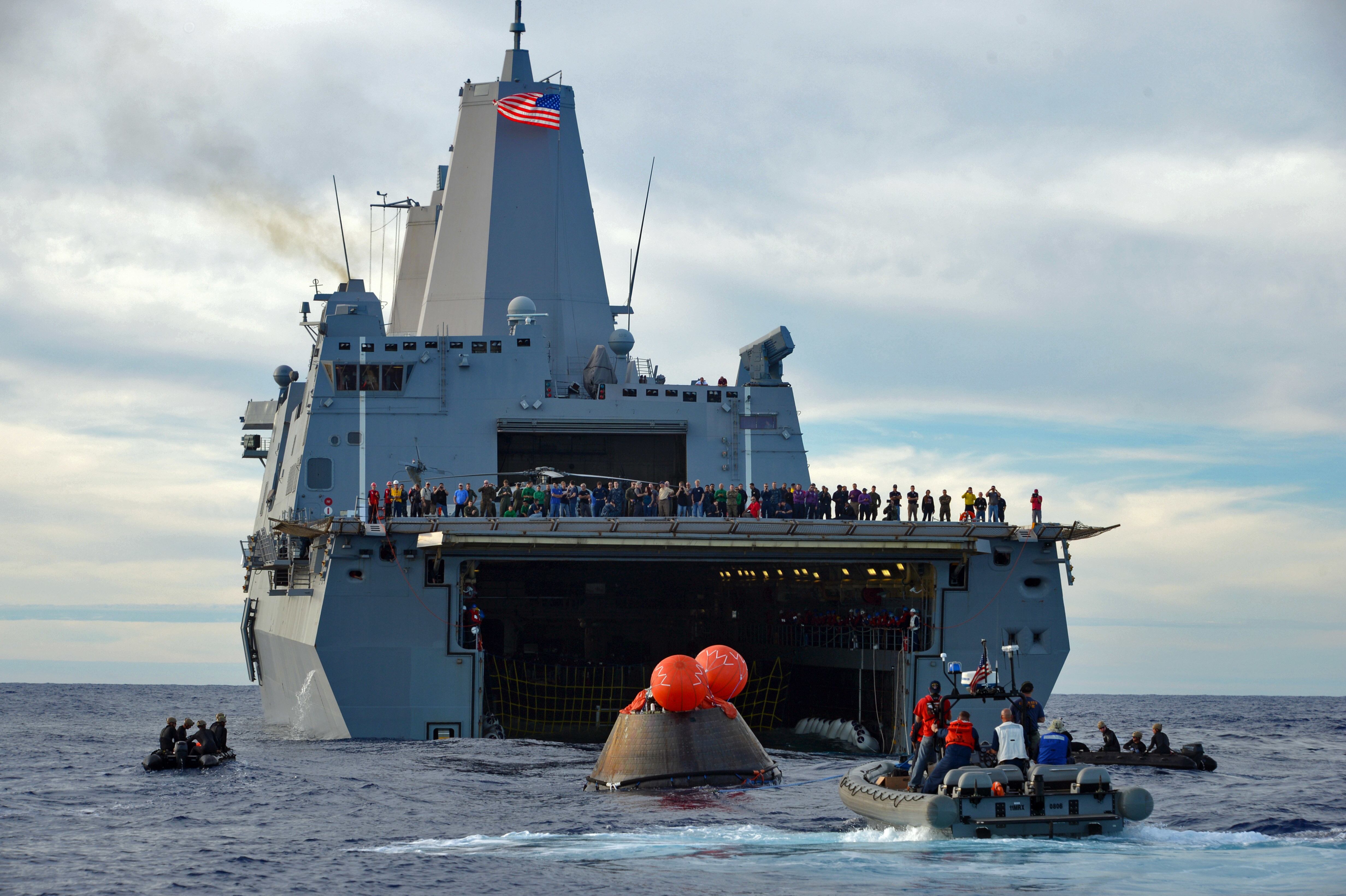 PACIFIC OCEAN (Dec. 5, 2014) NASA’s Orion Crew Module descends to the Pacific Ocean under its three main parachutes as part of the Orion Program’s first exploration flight test. USS Anchorage (LPD 23) is supporting the first exploration test flight for the NASA Orion Program. EFT-1 is the fifth at sea testing of the Orion Crew Module using a Navy well deck recovery method. (U.S. Navy Photo by Mass Communication Specialist 1st Class Charles White/Released)Navy Divers, assigned to Explosive Ordnance Disposal Mobile Unit 11 (EODMU11) and Mobile Dive and Salvage Company 11‐7, attach a towing bridle to NASA’s Orion Crew Module. The amphibious transport dock USS Anchorage (LPD 23) is currently conducting the first exploration flight test (EFT) for the NASA Orion Program. EFT-1 is the first at-sea testing of the Orion Crew Module using a Navy well deck recovery method. (U.S. Navy Photo by Mass Communication Specialist 1st Class Gary Keen/Released)Navy Divers, assigned to Explosive Ordnance Disposal Mobile Unit 11 (EODMU11), Mobile Dive and Salvage Company 11-7, approach the Orion Crew Module during the first Exploration Flight Test (EFT-1) NASA Orion Program. USS Anchorage (LPD 23) is currently conducting the first exploration test flight for the NASA Orion program. EFT-1 is the fifth at sea testing of the Orion Crew Module using a Navy well deck recovery method. (U.S. Navy Photo by Mass Communication Specialist 1st Class Corey Green/Released)Navy Divers assigned to Explosive Ordnance Disposal Mobile Unit 11 and Fleet Combat Camera Pacific and crewmembers from amphibious transport dock USS Anchorage (LPD 23) approach the NASA Orion Crew Module after splash down in the Pacific Ocean. Anchorage is currently conducting the first exploration test flight for the NASA Orion program. EFT-1 is the fifth at sea testing of the Orion Crew Module using a Navy well deck recovery method. (U.S. Navy Photo by Mass Communication Specialist 1st Class Charles White/Released)Mass Communication Specialist 1st Class Gary Keen, assigned to Fleet Combat Camera Pacific, and Navy Divers, assigned to Explosive Ordnance Disposal Mobile Unit 11 (EODMU11) and Mobile Dive and Salvage Company 11-7, capture imagery of the Orion Crew Module during the first Exploration Flight Test (EFT-1) of the NASA Orion Program. USS Anchorage (LPD 23) is currently conducting the first exploration test flight for the NASA Orion Program. EFT-1 is the fifth at sea testing of the Orion Crew Module using a Navy well deck recovery method. (U.S. Navy Photo by Mass Communication Specialist 1st Class Corey Green/Released)Timothy Goddard, Neutral Buoyancy Laboratory Dive Operations Manager Oceaneering Space Systems and Navy Divers, assigned to Explosive Ordnance Disposal Mobile Unit 11 (EODMU11) and Mobile Dive and Salvage Company 11‐7, attach a towing bridle to NASA’s Orion Crew Module. USS Anchorage (LPD 23) is currently conducting the first exploration test flight (EFT) for the NASA Orion Program. EFT-1 is the first at-sea testing of the Orion Crew Module using a Navy well deck recovery method. (U.S. Navy Photo by Mass Communication Specialist 1st Class Gary Keen/Released)Rigid hull inflatable boats (RHIB) and combat rubber raiding crafts (CRRC) guide NASA’s Orion crew module towards the welldeck of the San Antonio class amphibious transport dock USS Anchorage (LPD 23). Anchorage is currently conducting the first Exploration Flight Test (EFT-1) for the NASA Orion program. EFT-1 is the fifth at-sea testing for the Orion crew module using a Navy welldeck recovery method. (U.S. Navy photo by Chief Mass Communication Specialist Elena Pence/Released)Navy Divers, assigned to Explosive Ordnance Disposal Mobile Unit 11 (EODMU11), Mobile Dive and Salvage Company 11-7, guide the Orion Crew Module alongside the amphibious transport dock USS Anchorage (LPD 23) during the first Exploration Flight Test (EFT-1) NASA Orion Program. Anchorage is currently conducting the first exploration test flight for the NASA Orion Program. EFT-1 is the fifth at sea testing of the Orion Crew Module using a Navy well deck recovery method. (U.S. Navy Photo by Mass Communication Specialist 1st Class Corey Green/Released)U.S. Navy Sailors from Expeditionary Strike Group Three, USS Anchorage (LPD 23), USNS Salvor (T-ARS 52), Helicopter Sea Combat Squadron Eight, Explosive Ordnance Disposal Group One, Fleet Combat Camera Pacific, and Fleet Weather Center San Diego are in the Pacific Ocean supporting the Orion Crew Module recovery operations. Anchorage is currently conducting the first exploration test flight for the NASA Orion program. EFT-1 is the fifth at sea testing of the Orion Crew Module using a Navy well deck recovery method. (U.S. Navy Photo by Mass Communication Specialist 1st Class Corey Green/Released)Navy Divers board small boats from the welldeck of the San Antonio class amphibious transport dock USS Anchorage (LPD 23) to recover NASA’s Orion space capsule. Anchorage is currently conducting the first Exploration Flight Test (EFT-1) for the NASA Orion program. EFT-1 is the fifth at-sea testing for the Orion crew module using a Navy welldeck recovery method. (U.S. Navy photo by Mass Communication Specialist Seaman Christopher A. Veloicaza/Released)Navy Divers, assigned to Explosive Ordnance Disposal Mobile Unit 11 (EODMU11) and Mobile Dive and Salvage Company 11‐7, recover NASA’s Orion Crew Module as part of the Orion Program’s first exploration flight test (EFT). USS Anchorage (LPD 23) is currently conducting the first exploration test flight for the NASA Orion Program. EFT-1 is the first at-sea testing of the Orion Crew Module using a Navy well deck recovery method. (U.S. Navy Photo by Mass Communication Specialist 1st Class Gary Keen/Released)