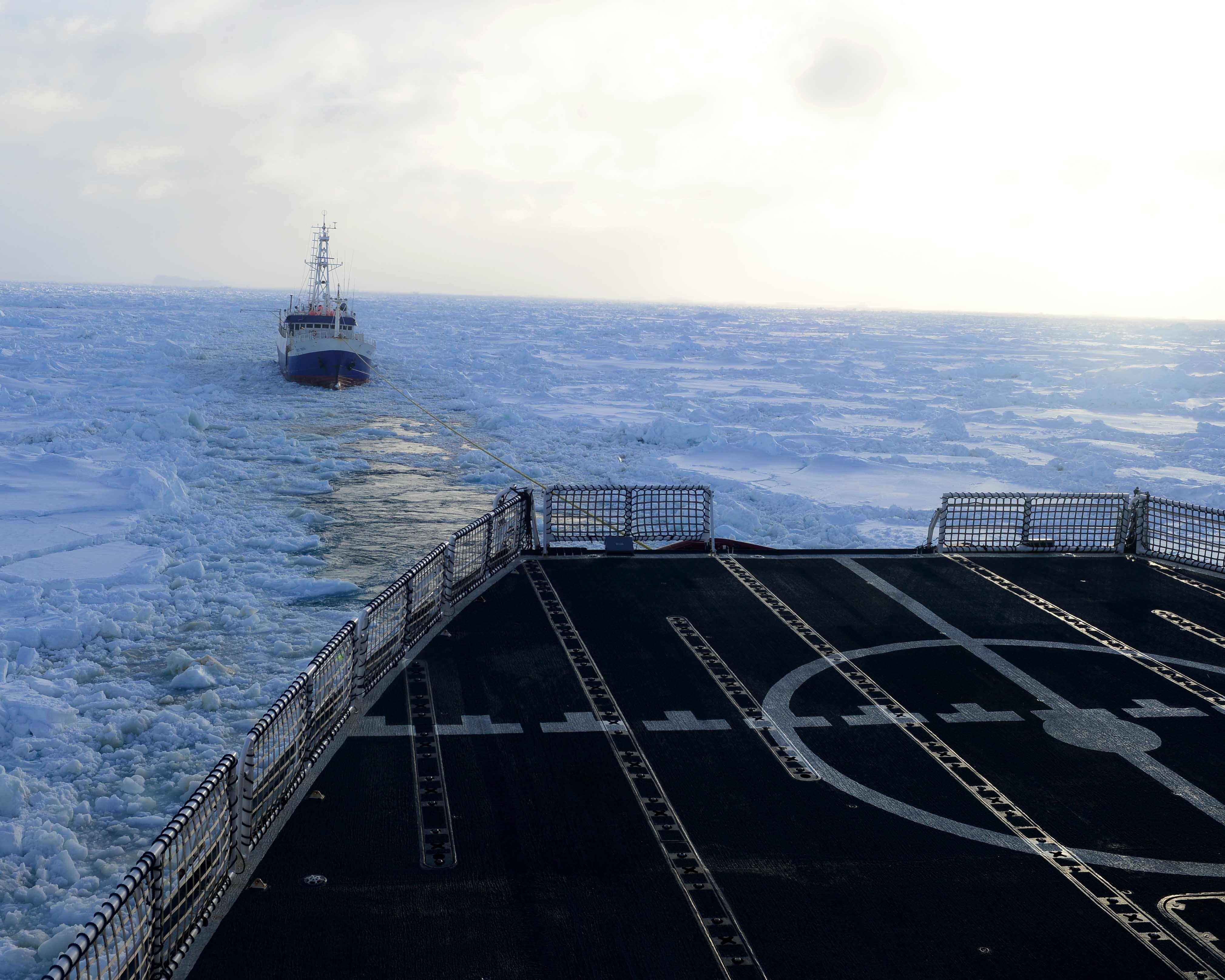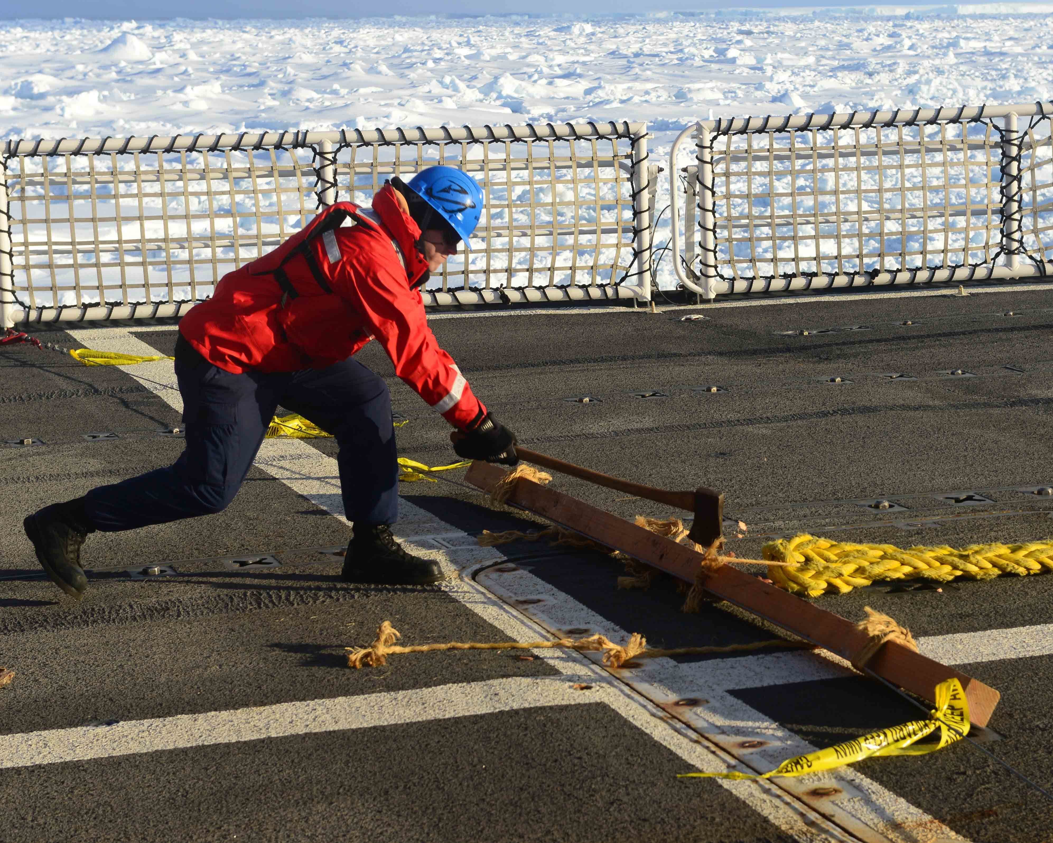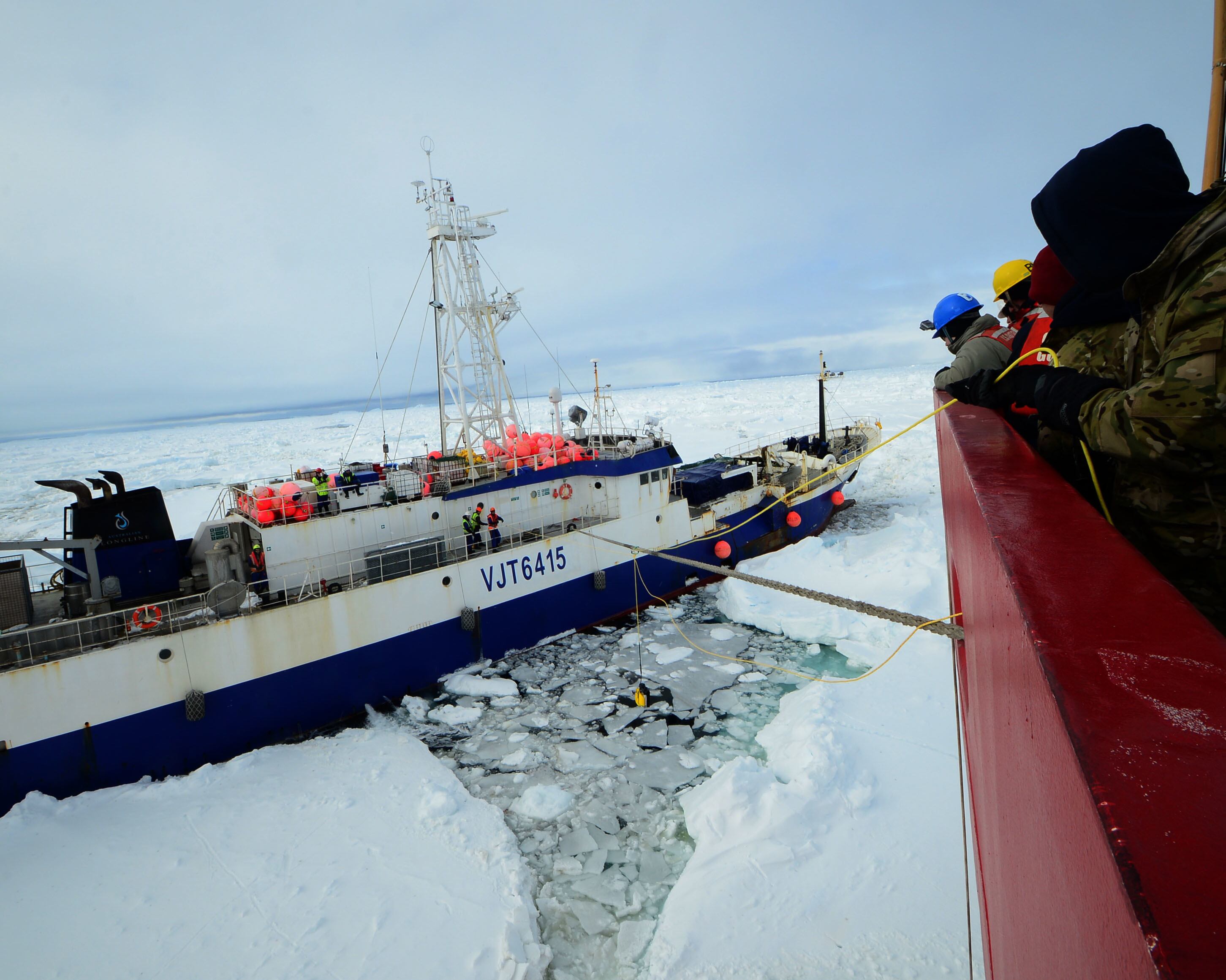 Seaman Nicholas Libbing, a member of deck force aboard Coast Guard Cutter Polar Star, uses a bolo to send a messenger line to the crew of the disabled fishing vessel Antarctic Chieftain, Feb. 14, 2015. Antarctic Chieftain became disabled and beset by ice near Cape Burks, Antarctica. Polar Star's crew has been underway in Antarctica in support of Operation Deep Freeze 2015, part of the U.S. Antarctic Program, managed by the National Science Foundation. (U.S. Coast Guard photo by Petty Officer 1st Class George Degener)Members of the military dive team aboard Coast Guard Cutter Polar Star launch a remote operated vehicle into the water to inspect the disabled fishing vessel Antarctic Chieftain, beset by ice near Cape Burks, Antarctica, Feb. 14, 2015. Dive team members used the ROV to inspect Antarctic Chieftain's damaged propellers. Polar Star's crew has been underway in Antarctica in support of Operation Deep Freeze 2015, part of the U.S. Antarctic Program, managed by the National Science Foundation. (U.S. Coast Guard photo by Petty Officer 1st Class George Degener)Petty Officer 2nd Class Bill Glenn, an electronics technician and member of the military dive team aboard Coast Guard Cutter Polar Star, pilots a remote operated vehicle inspecting the propeller of the disabled fishing vessel Antarctic Chieftain near Antarctica, Feb. 14, 2015. Video from the ROV is used to evaluate damage sustained by Antarctic Chieftain. Polar Star's crew has been underway in Antarctica in support of Operation Deep Freeze 2015, part of the U.S. Antarctic Program, managed by the National Science Foundation. (U.S. Coast Guard photo by Petty Officer 1st Class George Degener)Members of Coast Guard Cutter Polar Star's deck force pay out messenger line to the crew of the disabled fishing vessel Antarctic Chieftain near Cape Burks, Antarctica, Feb. 14, 2015. Polar Star's crew uses messenger line to pass a tow hawser to the Antarctic Chieftain, which is beset by ice. Polar Star's crew has been underway in Antarctica in support of Operation Deep Freeze 2015, part of the U.S. Antarctic Program, managed by the National Science Foundation. (U.S. Coast Guard photo by Petty Officer 1st Class George Degener)Seaman Patrick O'Grady uses an axe to release towing line passed from the Coast Guard Cutter Polar Star to the fishing vessel Antarctic Chieftain near Antarctica, Feb. 14, 2015. Polar Star's crew will tow the disabled vessel to open water. Polar Star's crew has been underway in Antarctica in support of Operation Deep Freeze 2015, part of the U.S. Antarctic Program, managed by the National Science Foundation. (U.S. Coast Guard photo by Petty Officer 1st Class George Degener)The disabled fishing vessel Antarctic Chieftain is towed astern of the Coast Guard Cutter Polar Star through sea ice near Antarctica, Feb. 14, 2015. Polar Star's crew will tow Antarctic Chieftain to the safety of open water. Polar Star's crew has been underway in Antarctica in support of Operation Deep Freeze 2015, part of the U.S. Antarctic Program, managed by the National Science Foundation. (U.S. Coast Guard photo by Petty Officer 1st Class George Degener)The disabled fishing vessel Antarctic Chieftain is towed astern of the Coast Guard Cutter Polar Star through sea ice near Antarctica, Feb. 14, 2015. Polar Star's crew will tow Antarctic Chieftain to the safety of open water. Polar Star's crew has been underway in Antarctica in support of Operation Deep Freeze 2015, part of the U.S. Antarctic Program, managed by the National Science Foundation. (U.S. Coast Guard photo by Petty Officer 1st Class George Degener)