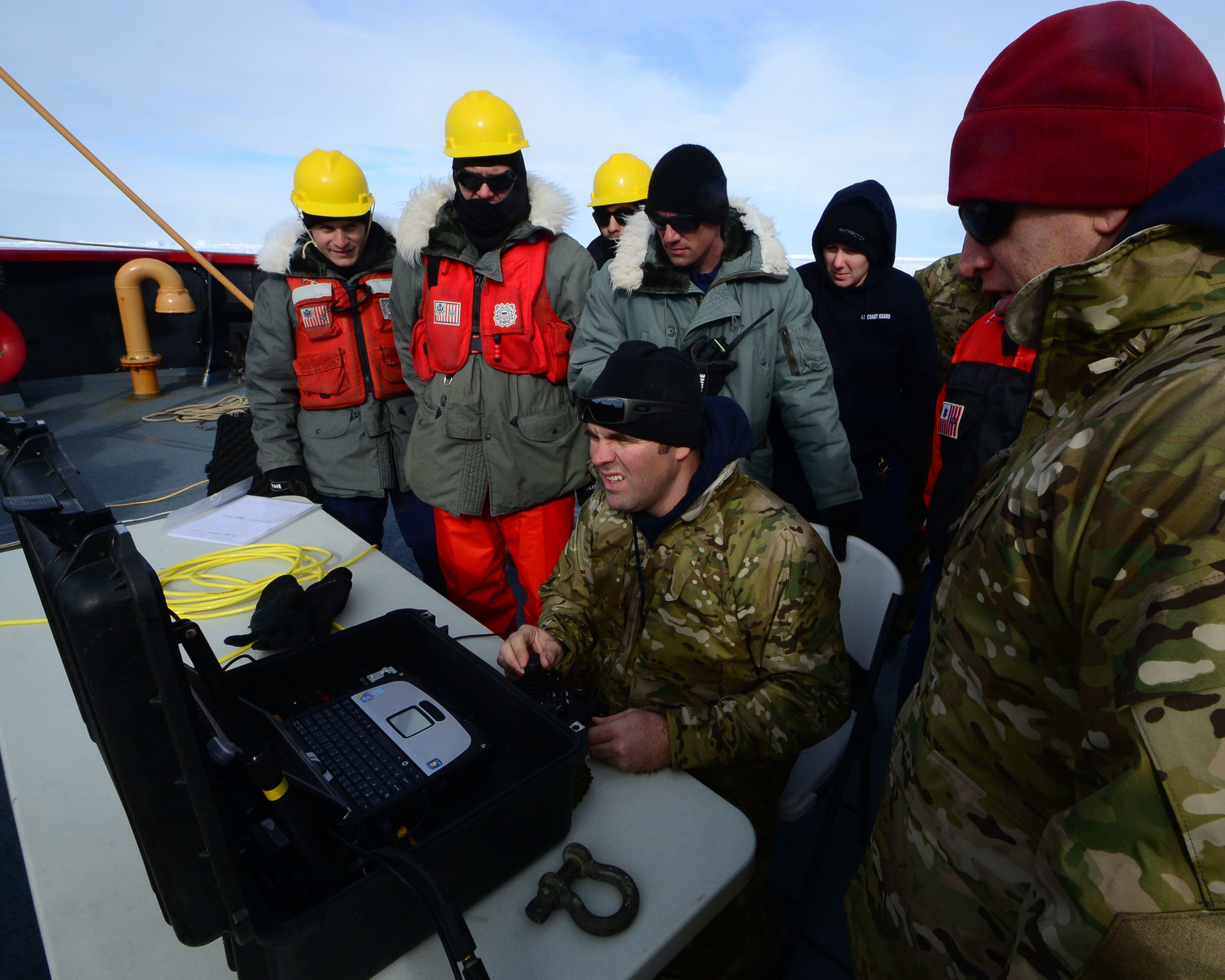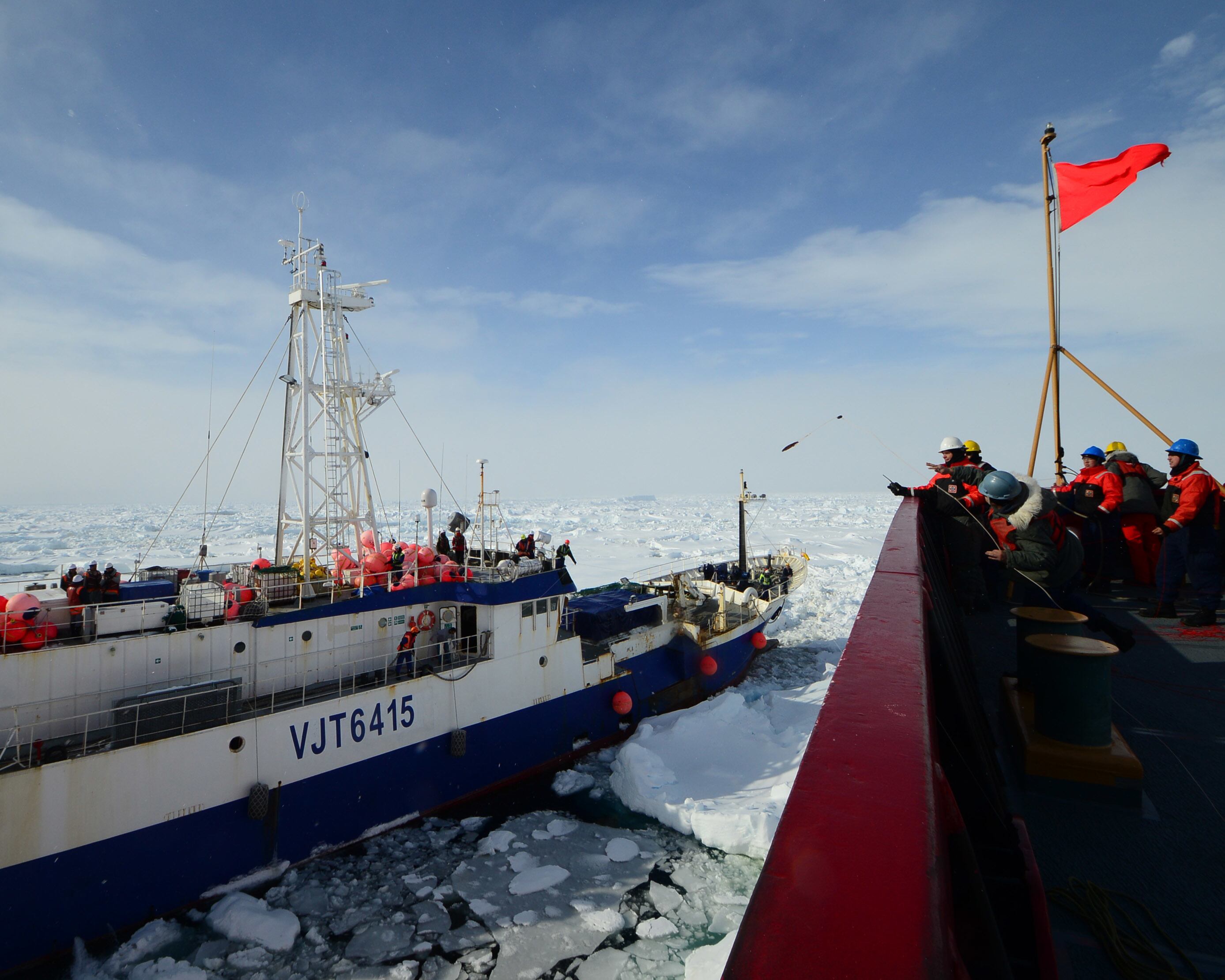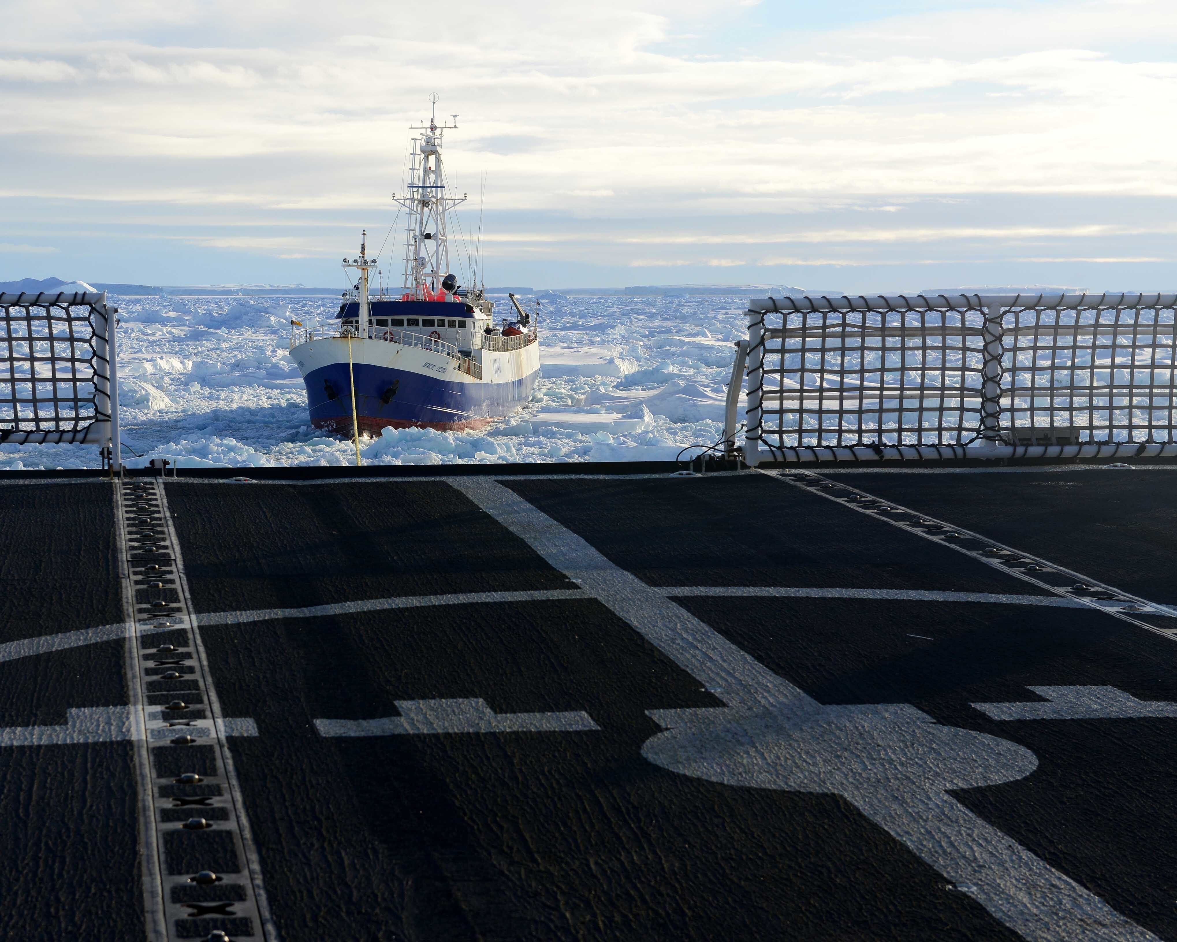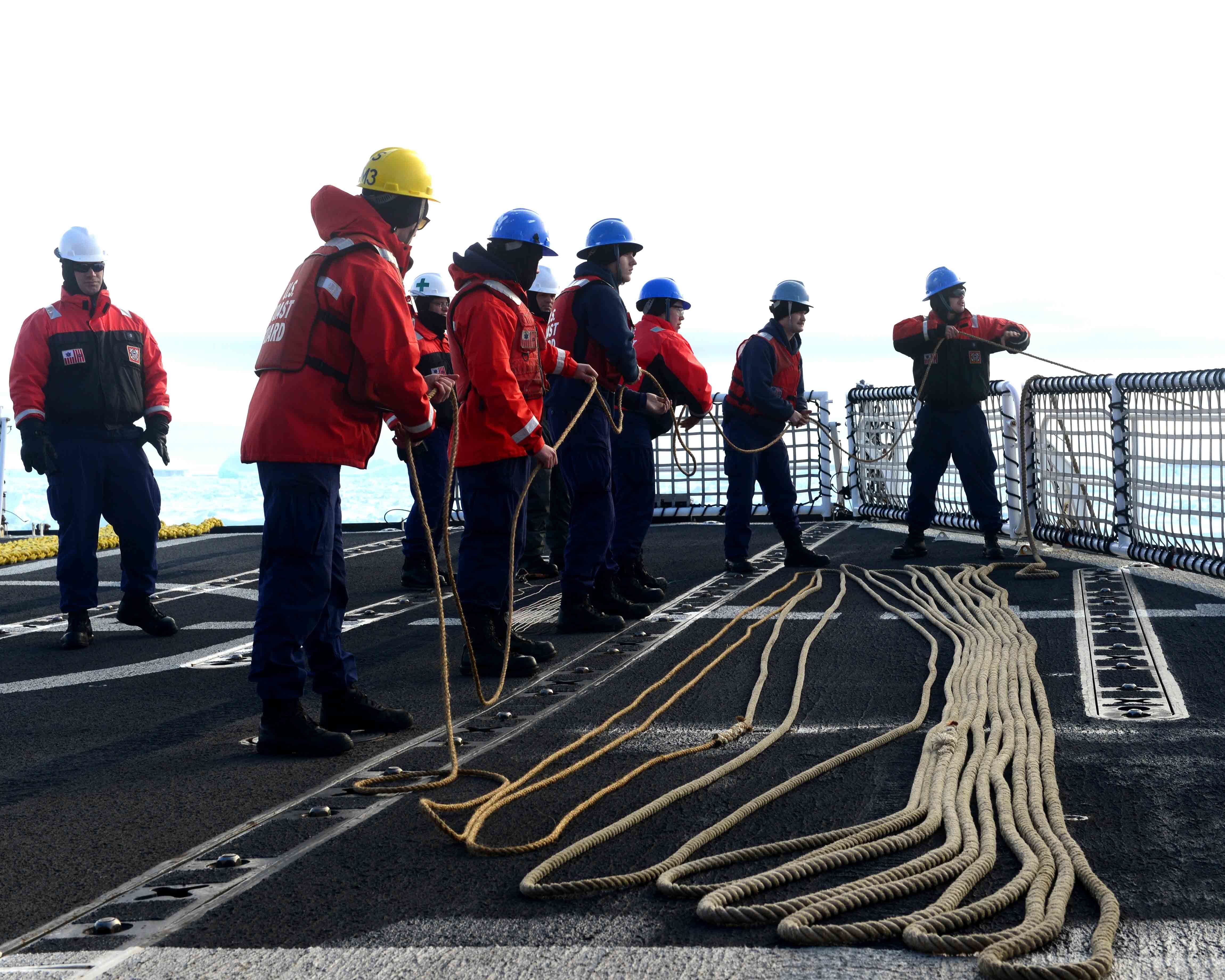 Seaman Nicholas Libbing, a member of deck force aboard Coast Guard Cutter Polar Star, uses a bolo to send a messenger line to the crew of the disabled fishing vessel Antarctic Chieftain, Feb. 14, 2015. Antarctic Chieftain became disabled and beset by ice near Cape Burks, Antarctica. Polar Star's crew has been underway in Antarctica in support of Operation Deep Freeze 2015, part of the U.S. Antarctic Program, managed by the National Science Foundation. (U.S. Coast Guard photo by Petty Officer 1st Class George Degener)Members of the military dive team aboard Coast Guard Cutter Polar Star launch a remote operated vehicle into the water to inspect the disabled fishing vessel Antarctic Chieftain, beset by ice near Cape Burks, Antarctica, Feb. 14, 2015. Dive team members used the ROV to inspect Antarctic Chieftain's damaged propellers. Polar Star's crew has been underway in Antarctica in support of Operation Deep Freeze 2015, part of the U.S. Antarctic Program, managed by the National Science Foundation. (U.S. Coast Guard photo by Petty Officer 1st Class George Degener)Petty Officer 2nd Class Bill Glenn, an electronics technician and member of the military dive team aboard Coast Guard Cutter Polar Star, pilots a remote operated vehicle inspecting the propeller of the disabled fishing vessel Antarctic Chieftain near Antarctica, Feb. 14, 2015. Video from the ROV is used to evaluate damage sustained by Antarctic Chieftain. Polar Star's crew has been underway in Antarctica in support of Operation Deep Freeze 2015, part of the U.S. Antarctic Program, managed by the National Science Foundation. (U.S. Coast Guard photo by Petty Officer 1st Class George Degener)Members of Coast Guard Cutter Polar Star's deck force pay out messenger line to the crew of the disabled fishing vessel Antarctic Chieftain near Cape Burks, Antarctica, Feb. 14, 2015. Polar Star's crew uses messenger line to pass a tow hawser to the Antarctic Chieftain, which is beset by ice. Polar Star's crew has been underway in Antarctica in support of Operation Deep Freeze 2015, part of the U.S. Antarctic Program, managed by the National Science Foundation. (U.S. Coast Guard photo by Petty Officer 1st Class George Degener)Seaman Patrick O'Grady uses an axe to release towing line passed from the Coast Guard Cutter Polar Star to the fishing vessel Antarctic Chieftain near Antarctica, Feb. 14, 2015. Polar Star's crew will tow the disabled vessel to open water. Polar Star's crew has been underway in Antarctica in support of Operation Deep Freeze 2015, part of the U.S. Antarctic Program, managed by the National Science Foundation. (U.S. Coast Guard photo by Petty Officer 1st Class George Degener)The disabled fishing vessel Antarctic Chieftain is towed astern of the Coast Guard Cutter Polar Star through sea ice near Antarctica, Feb. 14, 2015. Polar Star's crew will tow Antarctic Chieftain to the safety of open water. Polar Star's crew has been underway in Antarctica in support of Operation Deep Freeze 2015, part of the U.S. Antarctic Program, managed by the National Science Foundation. (U.S. Coast Guard photo by Petty Officer 1st Class George Degener)The disabled fishing vessel Antarctic Chieftain is towed astern of the Coast Guard Cutter Polar Star through sea ice near Antarctica, Feb. 14, 2015. Polar Star's crew will tow Antarctic Chieftain to the safety of open water. Polar Star's crew has been underway in Antarctica in support of Operation Deep Freeze 2015, part of the U.S. Antarctic Program, managed by the National Science Foundation. (U.S. Coast Guard photo by Petty Officer 1st Class George Degener)