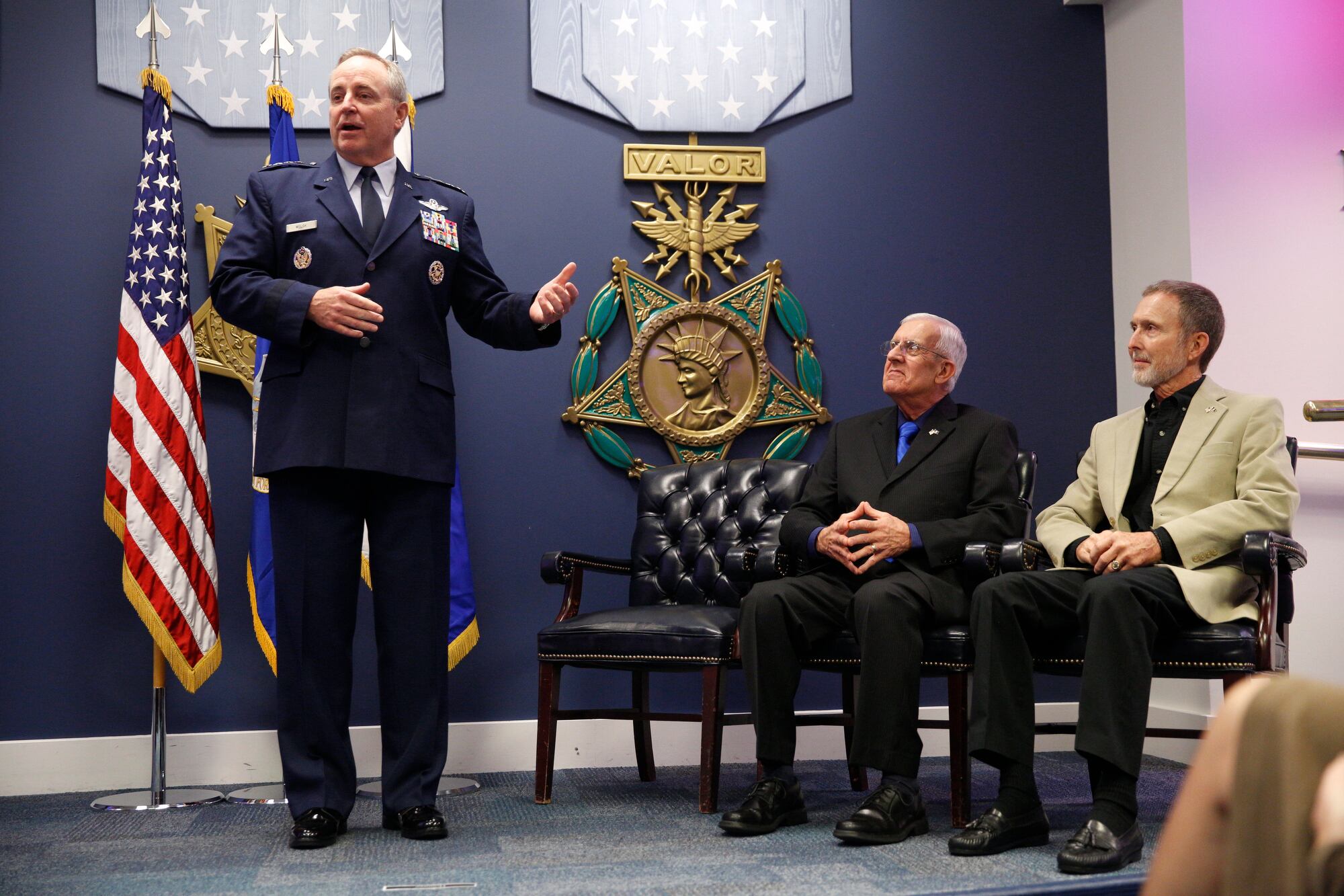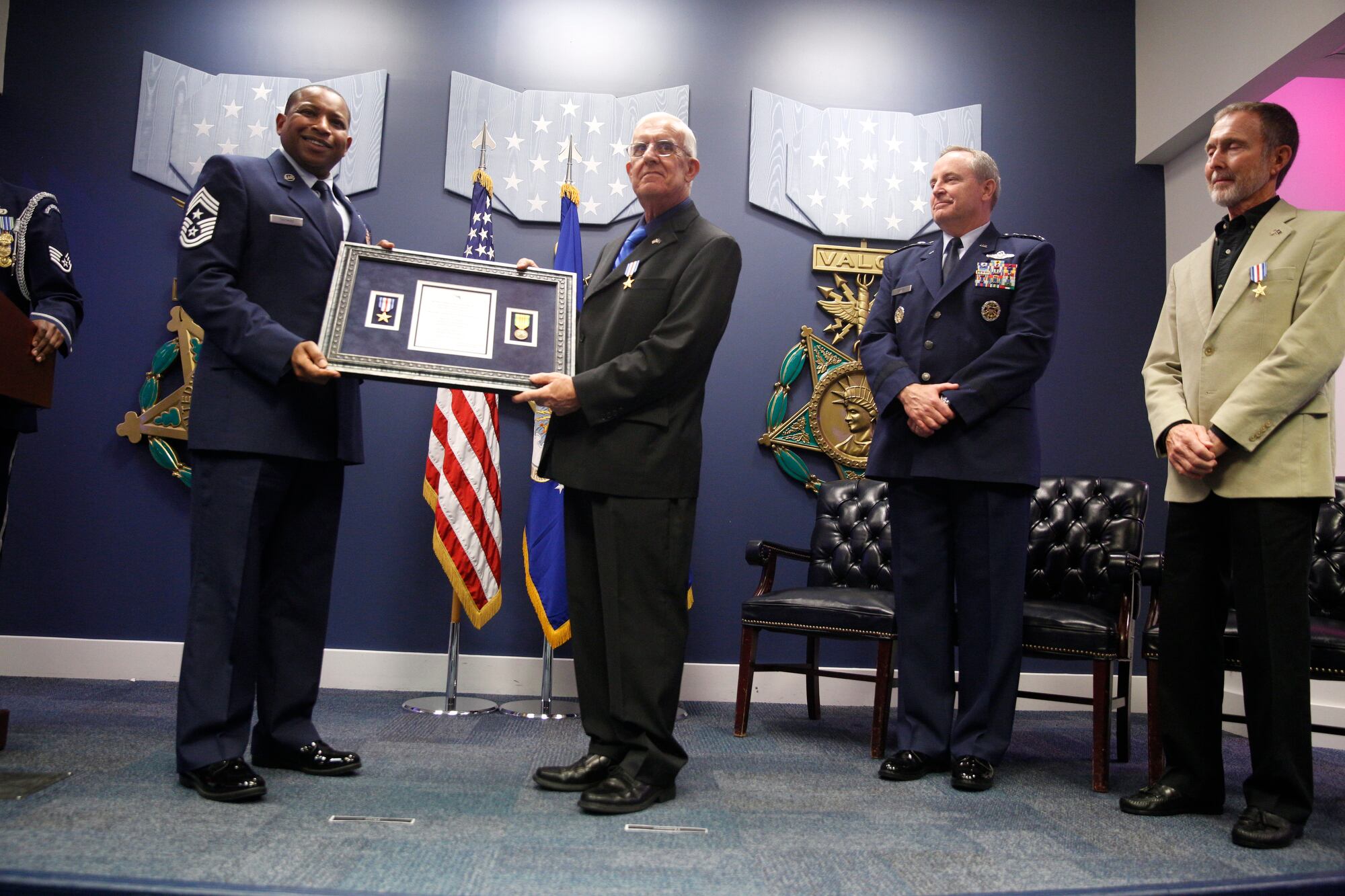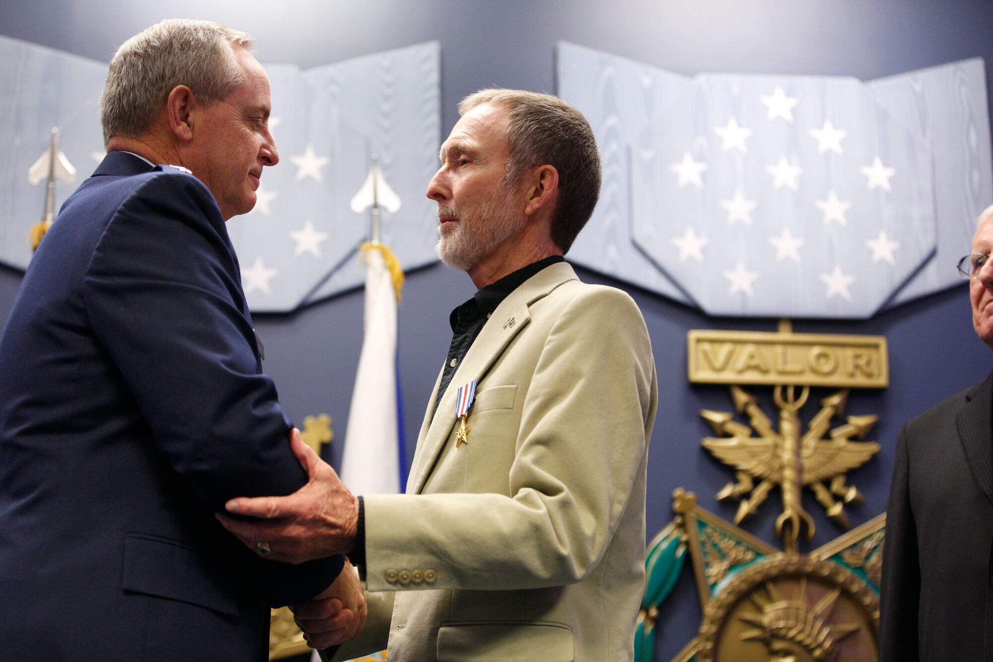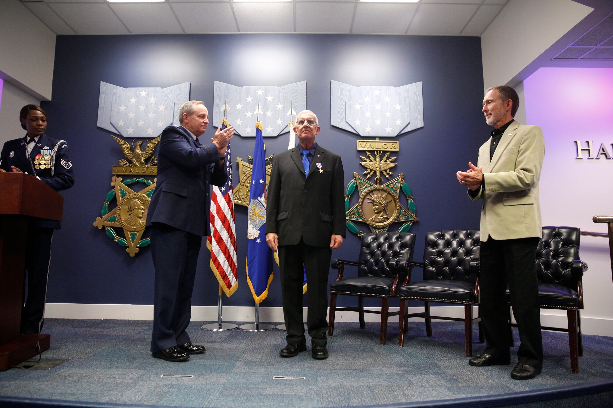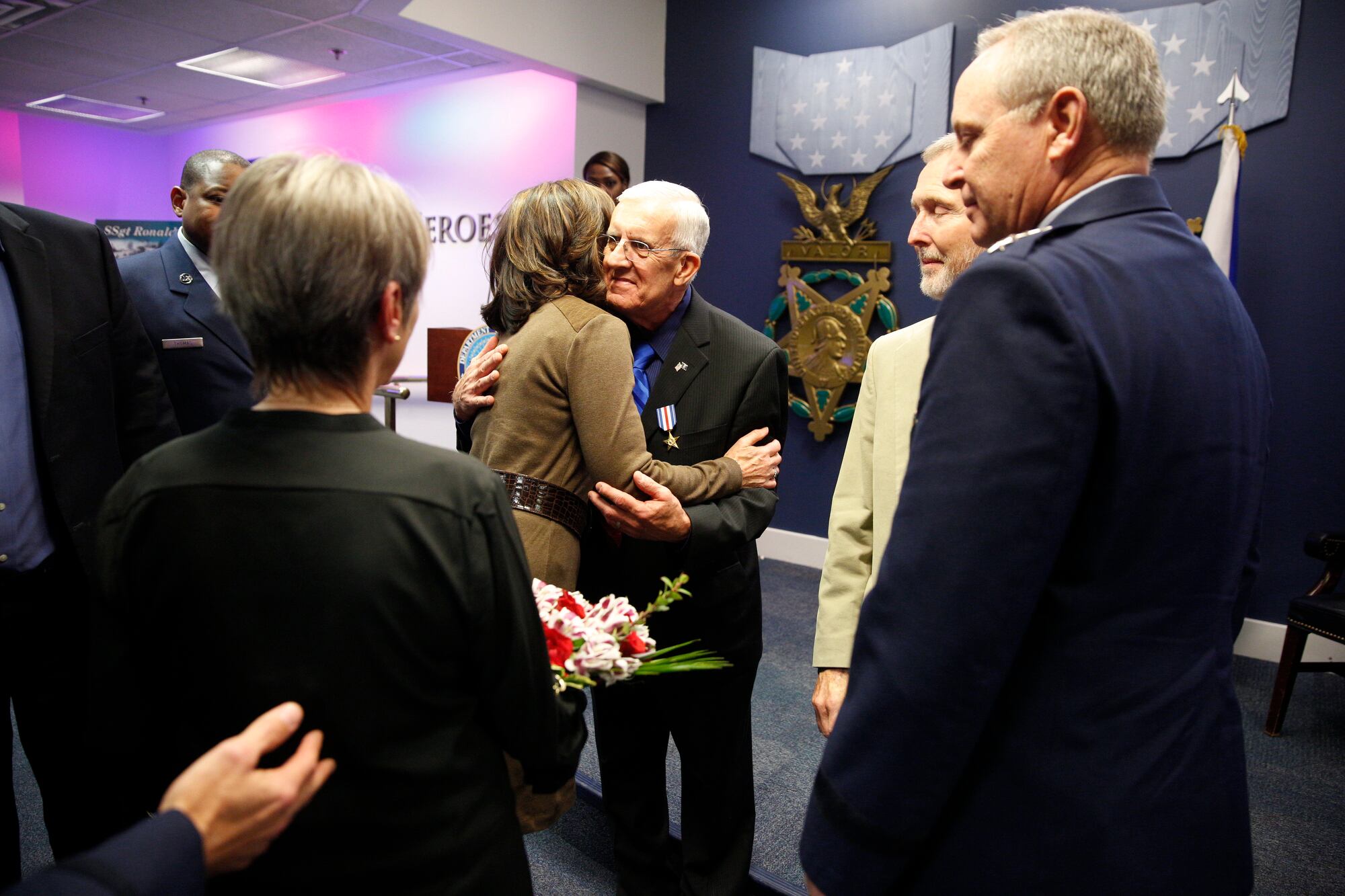 Air Force Chief of Staff Gen. Mark Welsh III presents the Silver Star to Vietnam veterans retired Chief Master Sgt. Ronald Brodeur and former Sgt. Eric Roberts II at the Pentagon in Arlington, Va., on Thursday, December 17, 2015. Brodeur and Roberts were aboard a helicopter that was shot down over Duc Lap, Republic of Vietnam, on February 20, 1969 while trying to rescue a long range reconnaissance patrol.Air Force Chief of Staff Gen. Mark Welsh III presents the Silver Star to Vietnam veterans retired Chief Master Sgt. Ronald Brodeur and former Sgt. Eric Roberts II at the Pentagon in Arlington, Va., on Thursday, December 17, 2015. Brodeur and Roberts were aboard a helicopter that was shot down over Duc Lap, Republic of Vietnam, on February 20, 1969 while trying to rescue a long range reconnaissance patrol.Air Force Chief of Staff Gen. Mark Welsh III presents the Silver Star to Vietnam veterans retired Chief Master Sgt. Ronald Brodeur, pictured, and former Sgt. Eric Roberts II at the Pentagon in Arlington, Va., on Thursday, December 17, 2015. Brodeur and Roberts were aboard a helicopter that was shot down over Duc Lap, Republic of Vietnam, on February 20, 1969 while trying to rescue a long range reconnaissance patrol.Air Force Chief of Staff Gen. Mark Welsh III presents the Silver Star to Vietnam veterans retired Chief Master Sgt. Ronald Brodeur, center, and former Sgt. Eric Roberts II at the Pentagon in Arlington, Va., on Thursday, December 17, 2015. Brodeur and Roberts were aboard a helicopter that was shot down over Duc Lap, Republic of Vietnam, on February 20, 1969 while trying to rescue a long range reconnaissance patrol.Air Force Chief of Staff Gen. Mark Welsh III presents the Silver Star to Vietnam veterans retired Chief Master Sgt. Ronald Brodeur and former Sgt. Eric Roberts II, pictured, at the Pentagon in Arlington, Va., on Thursday, December 17, 2015. Brodeur and Roberts were aboard a helicopter that was shot down over Duc Lap, Republic of Vietnam, on February 20, 1969 while trying to rescue a long range reconnaissance patrol.Air Force Chief of Staff Gen. Mark Welsh III presents the Silver Star to Vietnam veterans retired Chief Master Sgt. Ronald Brodeur and former Sgt. Eric Roberts II at the Pentagon in Arlington, Va., on Thursday, December 17, 2015. Brodeur and Roberts were aboard a helicopter that was shot down over Duc Lap, Republic of Vietnam, on February 20, 1969 while trying to rescue a long range reconnaissance patrol.RetiredAir Force Chief Master Sgt. Ronald Brodeur, pictured, speaks after he and former Sgt. Eric Roberts II were presented with the Silver Star at the Pentagon in Arlington, Va., on Thursday, December 17, 2015. Brodeur and Roberts were aboard a helicopter that was shot down over Duc Lap, Republic of Vietnam, on February 20, 1969 while trying to rescue a long range reconnaissance patrol.Air Force Chief of Staff Gen. Mark Welsh III presents the Silver Star to Vietnam veteran and former Air Force Sgt. Eric Roberts II speaks after he and retired Chief Master Sgt. Ronald Brodeur received the Silver Star at the Pentagon in Arlington, Va., on Thursday, December 17, 2015. Brodeur and Roberts were aboard a helicopter that was shot down over Duc Lap, Republic of Vietnam, on February 20, 1969 while trying to rescue a long range reconnaissance patrol.Former Air Force Sgt. Eric Roberts II presents flowers to his wife Susan during the Silver Star ceremony for he and retired Chief Master Sgt. Ronald Brodeur at the Pentagon in Arlington, Va., on Thursday, December 17, 2015. Susan Roberts advocated for the appropriate recognition for her husband and his fellow airman over many years. Air Force Chief of Staff Gen. Mark Welsh III and Vietnam veterans retired Chief Master Sgt. Ronald Brodeur and former Sgt. Eric Roberts II sing the Air Force song at the Pentagon in Arlington, Va., on Thursday, December 17, 2015. Brodeur and Roberts were awarded the Silver Star, recognizing their heroic actions after their helicopter was shot down over Duc Lap, Republic of Vietnam, on February 20, 1969 while trying to rescue a long range reconnaissance patrol.Vietnam veterans retired Chief Master Sgt. Ronald Brodeur and former Sgt. Eric Roberts II greet well-wishers following their Silver Star ceremony at the Pentagon in Arlington, Va., on Thursday, December 17, 2015. Brodeur and Roberts were recognized for their heroic actions after their helicopter was shot down over Duc Lap, Republic of Vietnam, on February 20, 1969 while trying to rescue a long range reconnaissance patrol.