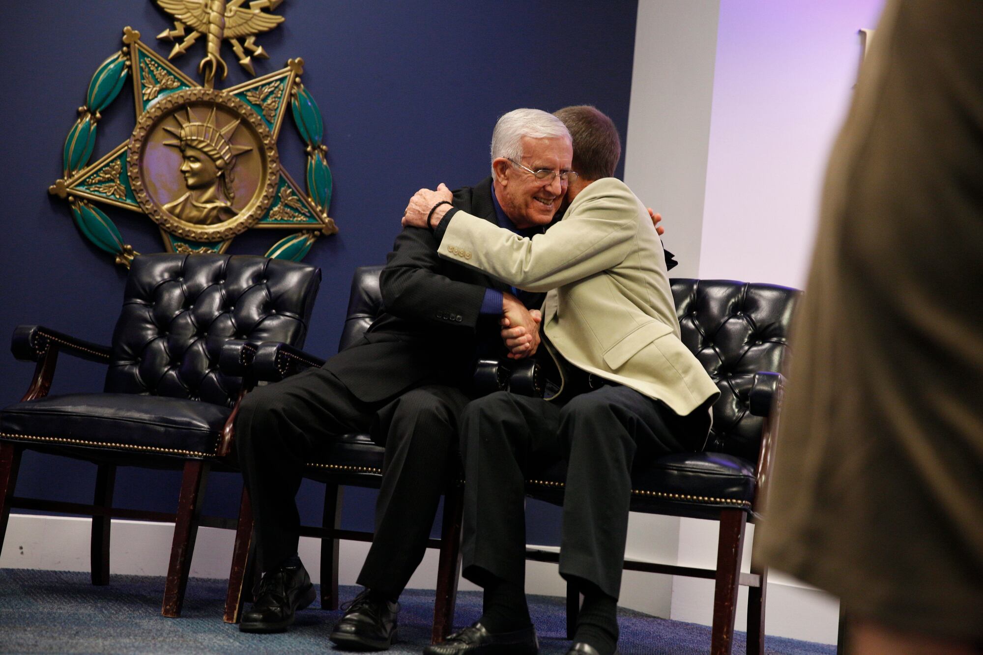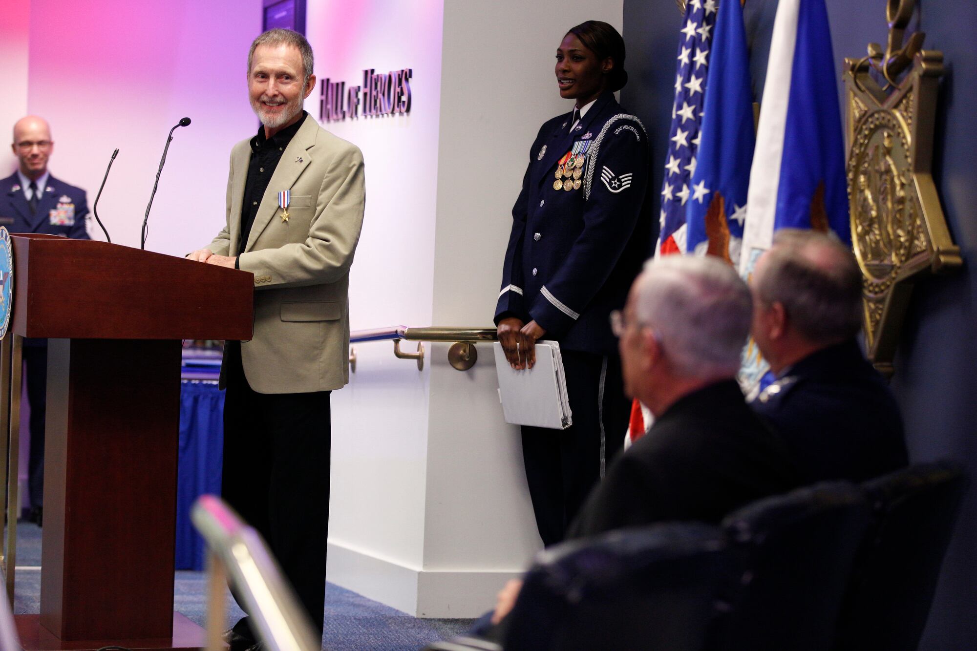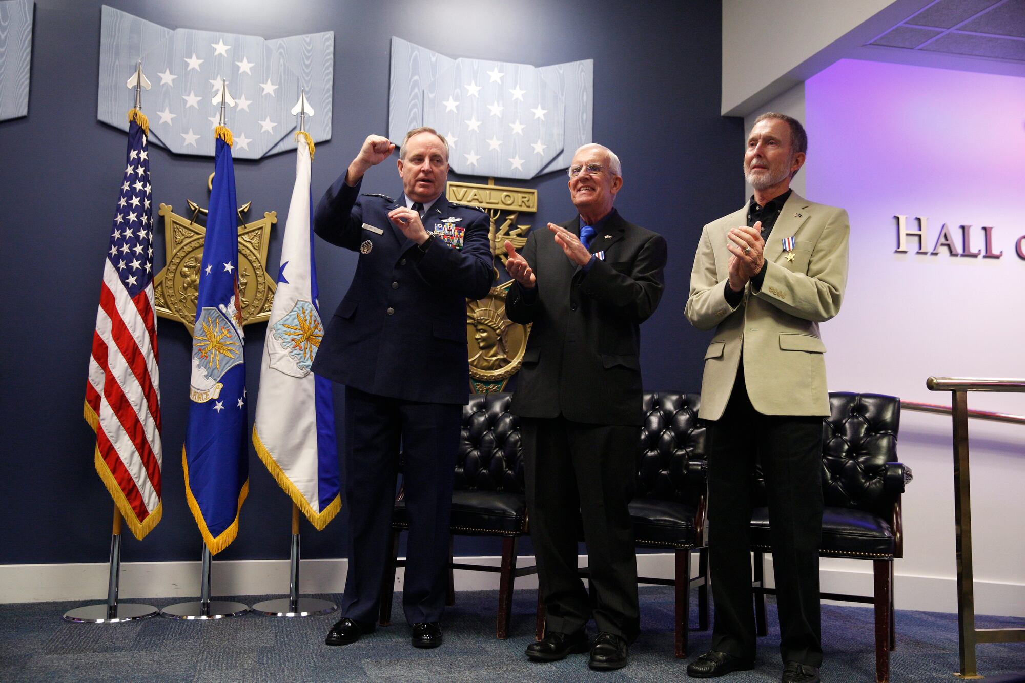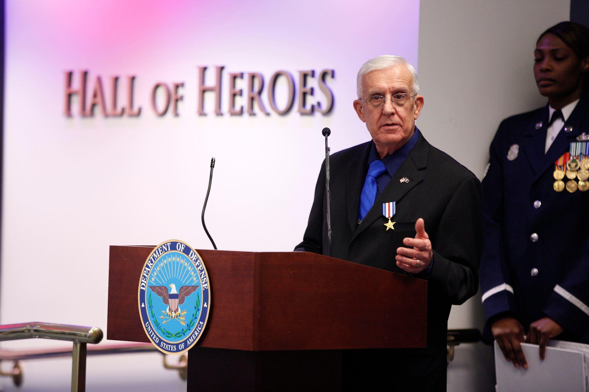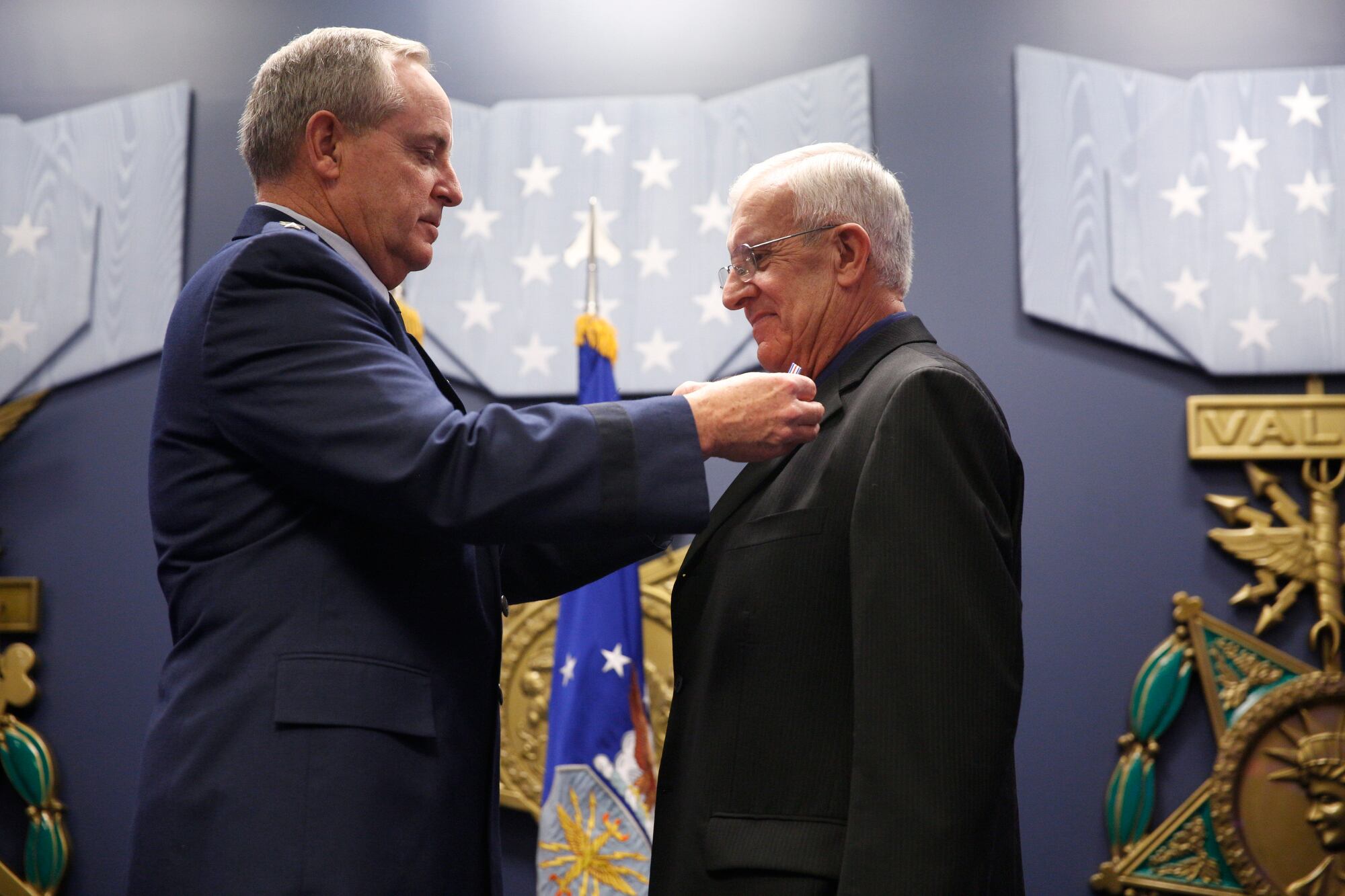Air Force Chief of Staff Gen. Mark Welsh III presents the Silver Star to Vietnam veterans retired Chief Master Sgt. Ronald Brodeur and former Sgt. Eric Roberts II at the Pentagon in Arlington, Va., on Thursday, December 17, 2015. Brodeur and Roberts were aboard a helicopter that was shot down over Duc Lap, Republic of Vietnam, on February 20, 1969 while trying to rescue a long range reconnaissance patrol.Air Force Chief of Staff Gen. Mark Welsh III presents the Silver Star to Vietnam veterans retired Chief Master Sgt. Ronald Brodeur and former Sgt. Eric Roberts II at the Pentagon in Arlington, Va., on Thursday, December 17, 2015. Brodeur and Roberts were aboard a helicopter that was shot down over Duc Lap, Republic of Vietnam, on February 20, 1969 while trying to rescue a long range reconnaissance patrol.Air Force Chief of Staff Gen. Mark Welsh III presents the Silver Star to Vietnam veterans retired Chief Master Sgt. Ronald Brodeur, pictured, and former Sgt. Eric Roberts II at the Pentagon in Arlington, Va., on Thursday, December 17, 2015. Brodeur and Roberts were aboard a helicopter that was shot down over Duc Lap, Republic of Vietnam, on February 20, 1969 while trying to rescue a long range reconnaissance patrol.Air Force Chief of Staff Gen. Mark Welsh III presents the Silver Star to Vietnam veterans retired Chief Master Sgt. Ronald Brodeur, center, and former Sgt. Eric Roberts II at the Pentagon in Arlington, Va., on Thursday, December 17, 2015. Brodeur and Roberts were aboard a helicopter that was shot down over Duc Lap, Republic of Vietnam, on February 20, 1969 while trying to rescue a long range reconnaissance patrol.Air Force Chief of Staff Gen. Mark Welsh III presents the Silver Star to Vietnam veterans retired Chief Master Sgt. Ronald Brodeur and former Sgt. Eric Roberts II, pictured, at the Pentagon in Arlington, Va., on Thursday, December 17, 2015. Brodeur and Roberts were aboard a helicopter that was shot down over Duc Lap, Republic of Vietnam, on February 20, 1969 while trying to rescue a long range reconnaissance patrol.Air Force Chief of Staff Gen. Mark Welsh III presents the Silver Star to Vietnam veterans retired Chief Master Sgt. Ronald Brodeur and former Sgt. Eric Roberts II at the Pentagon in Arlington, Va., on Thursday, December 17, 2015. Brodeur and Roberts were aboard a helicopter that was shot down over Duc Lap, Republic of Vietnam, on February 20, 1969 while trying to rescue a long range reconnaissance patrol.RetiredAir Force Chief Master Sgt. Ronald Brodeur, pictured, speaks after he and former Sgt. Eric Roberts II were presented with the Silver Star at the Pentagon in Arlington, Va., on Thursday, December 17, 2015. Brodeur and Roberts were aboard a helicopter that was shot down over Duc Lap, Republic of Vietnam, on February 20, 1969 while trying to rescue a long range reconnaissance patrol.Air Force Chief of Staff Gen. Mark Welsh III presents the Silver Star to Vietnam veteran and former Air Force Sgt. Eric Roberts II speaks after he and retired Chief Master Sgt. Ronald Brodeur received the Silver Star at the Pentagon in Arlington, Va., on Thursday, December 17, 2015. Brodeur and Roberts were aboard a helicopter that was shot down over Duc Lap, Republic of Vietnam, on February 20, 1969 while trying to rescue a long range reconnaissance patrol.Former Air Force Sgt. Eric Roberts II presents flowers to his wife Susan during the Silver Star ceremony for he and retired Chief Master Sgt. Ronald Brodeur at the Pentagon in Arlington, Va., on Thursday, December 17, 2015. Susan Roberts advocated for the appropriate recognition for her husband and his fellow airman over many years. Air Force Chief of Staff Gen. Mark Welsh III and Vietnam veterans retired Chief Master Sgt. Ronald Brodeur and former Sgt. Eric Roberts II sing the Air Force song at the Pentagon in Arlington, Va., on Thursday, December 17, 2015. Brodeur and Roberts were awarded the Silver Star, recognizing their heroic actions after their helicopter was shot down over Duc Lap, Republic of Vietnam, on February 20, 1969 while trying to rescue a long range reconnaissance patrol.Vietnam veterans retired Chief Master Sgt. Ronald Brodeur and former Sgt. Eric Roberts II greet well-wishers following their Silver Star ceremony at the Pentagon in Arlington, Va., on Thursday, December 17, 2015. Brodeur and Roberts were recognized for their heroic actions after their helicopter was shot down over Duc Lap, Republic of Vietnam, on February 20, 1969 while trying to rescue a long range reconnaissance patrol.