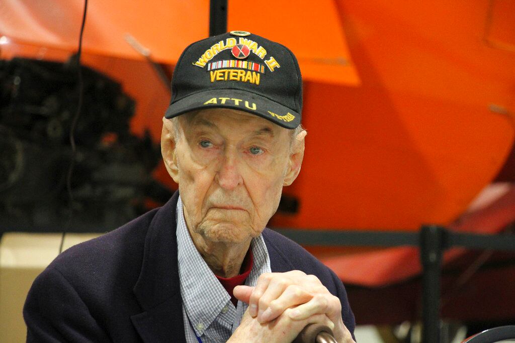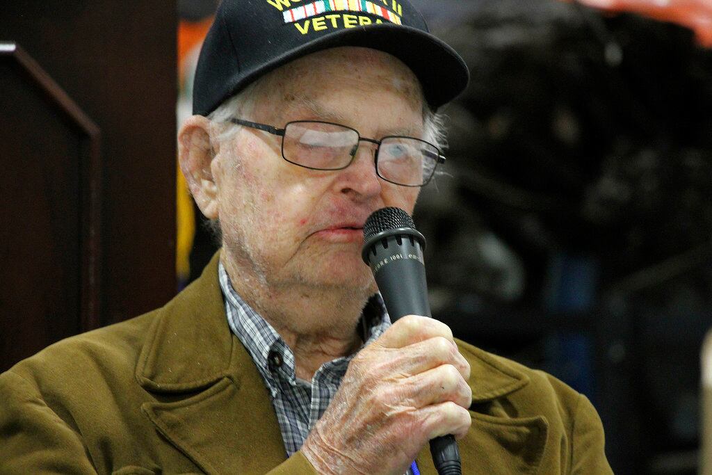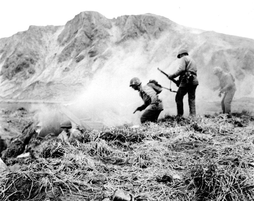 In this June 1943 file photo, a U.S. squad armed with guns and hand grenades close in on Japanese holdouts entrenched in dugouts during World War II on Attu Island, part of the Aleutian Islands of Alaska. May 30, 2018 will mark the 75th anniversary of American forces recapturing Attu Island in Alaska's Aleutian chain from Japanese forces. It was the only World War II battle fought on North American soil. (AP)In this June 23, 1943, file photo, U.S. Army reinforcements land on a beach during World War II on Attu Island, part of the Aleutian Islands of Alaska. May 30, 2018 will mark the 75th anniversary of American forces recapturing Attu Island in Alaska's Aleutian chain from Japanese forces. It was the only World War II battle fought on North American soil. (AP)In this May 26, 1943, file photo released by the U.S. Navy, American soldiers and equipment land on the black volcanic beach during World War II at Massacre Bay on Attu Island, part of the Aleutian Islands of Alaska. May 30, 2018 will mark the 75th anniversary of American forces recapturing Attu Island in Alaska's Aleutian chain from Japanese forces. It was the only World War II battle fought on North American soil. (U.S. Navy via AP)In this August 1943 file photo, a bugler sounds taps during a memorial service while a group of GIs visit the graves of comrades who fell in the reconquest of Attu Island, part of the Aleutian Islands of Alaska. May 30, 2018 will mark the 75th anniversary of American forces recapturing Attu Island in Alaska's Aleutian chain from Japanese forces. It was the only World War II battle fought on North American soil. (AP)In this May 28, 1943, file photo, soldiers who took part in the American landing on Japanese-occupied Attu in the Aleutians, from left, Pvt. John E. Terknett, of Eastland, Texas, whose wallet and notebook were ripped by a shell which wounded him across the chest, Pvt. Joseph E. Kenski, of Detroit, with a finger through a knitted cap he was wearing when he suffered a head wound, and Sgt. Forrest Wright Johnson, of Flat River, Mo., showing a bullet-creased boot, smile after arriving at a Pacific Northwest Army base hospital. The 75th anniversary of American forces recapturing Attu Island in Alaska's Aleutian chain from Japanese forces will be marked on May 30, 2018. It was the only World War II battle fought on North American soil. (AP)This Aug. 22, 2017, photo provided by the U.S. Fish and Wildlife Service, shows a titanium Peace Memorial at the crest of Engineer Hill on Attu Island, Alaska. One of the bloodiest World War II battles in the Pacific was waged 75 years ago this month on Attu Island in Alaska's Aleutian Islands. American forces reclaimed the island on Memorial Day 1943, 11 months after Japan seized it. (Lisa Hupp/U.S. Fish and Wildlife Service via AP)In this Aug. 22, 2017, photo provided by the U.S. Fish and Wildlife Service, an artillery monument sits above Massacre Bay on Attu Island, Alaska. One of the bloodiest World War II battles in the Pacific was waged 75 years ago this month on Attu Island in Alaska's Aleutian Islands. American forces reclaimed the island on Memorial Day 1943, 11 months after Japan seized it. (Lisa Hupp/U.S. Fish and Wildlife Service via AP)In this May 19, 2018, photo World War II veterans Allan Seroll, left, of Massachusetts, and William Roy Dover, right, of Alabama, right, attend a 75th anniversary celebration of the Battle of Attu in Anchorage, Alaska. Dover was an American soldier who took part in the May 1943 effort to reclaim Alaska's Attu Island from the Japanese. It was the only World War II battle fought on North American soil. (Mark Thiessen/AP)In this May 19, 2018, photo World War II veteran Joseph Sasser, of Carthage, Miss., attends a 75th anniversary celebration of the Battle of Attu in Anchorage, Alaska. Dover was an American soldier who took part in the May 1943 effort to reclaim Alaska's Attu Island from the Japanese. It was the only World War II battle fought on North American soil. (Mark Thiessen/AP)In this May 19, 2018, photo World War II veteran William Roy Dover, of Haleyville, Ala., speaks at a 75th anniversary celebration of the Battle of Attu in Anchorage, Alaska. Dover was an American soldier who took part in the May 1943 effort to reclaim Alaska's Attu Island from the Japanese. It was the only World War II battle fought on North American soil. (Mark Thiessen/AP)In this May 19, 2018, photo World War II veteran Joseph Sasser, of Carthage, Miss., attends a 75th anniversary celebration of the Battle of Attu in Anchorage, Alaska. Dover was an American soldier who took part in the May 1943 effort to reclaim Alaska's Attu Island from the Japanese. It was the only World War II battle fought on North American soil. (Mark Thiessen/AP)