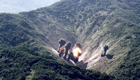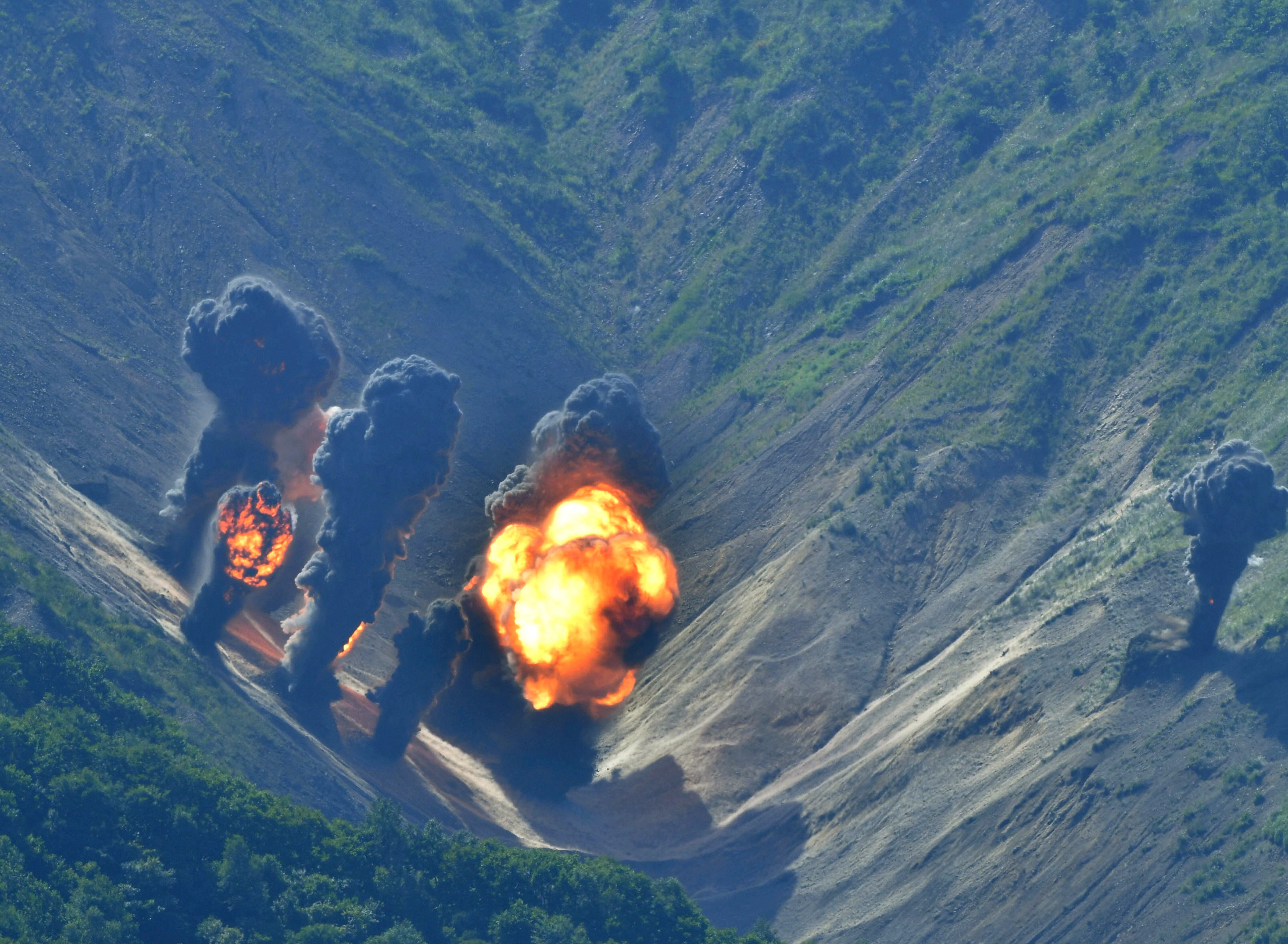 Munitions from a U.S. Air Force, U.S. Marine Corps and South Korean Air Force bilateral mission explode at the Pilsung Range, South Korea. The American and South Korean aircraft flew across the Korean Peninsula and practiced attack capabilities by releasing live weapons at the training area before returning to their respective home stations. (Staff Sgt. Alex Fox Echols III/U.S. Air Force)