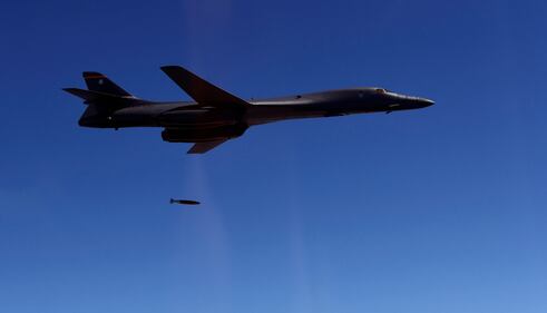 Weapons drop from a U.S. Air Force B-1B Lancer bomber as it practices attack capabilities on Aug. 30, 2017. (South Korea Defense Ministry via AP)