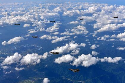 In a demonstration of U.S. commitment to its allies, U.S. Marine Corps F-35B Lightning II fighters assigned to Marine Corps Air Station Iwakuni, Japan, are joined by South Korean Air Force F-15K fighters during a 10-hour mission from Andersen Air Force Base, into Japanese airspace and over the Korean Peninsula on Aug. 30, 2017. (South Korea Defense Ministry via AP)
