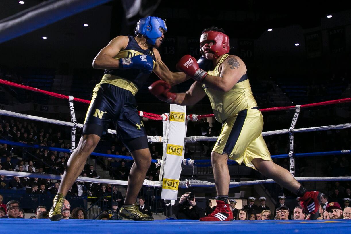 Charles Patterson, left, from Honolulu, HI fights Joey Resendez, right, from El Paso, TX, in the Heavyweight fight during the United States Naval Academy's 77th Brigade Boxing Championships held on Feb. 23, 2018. Patterson won the fight. (Alan Lessig/Staff)