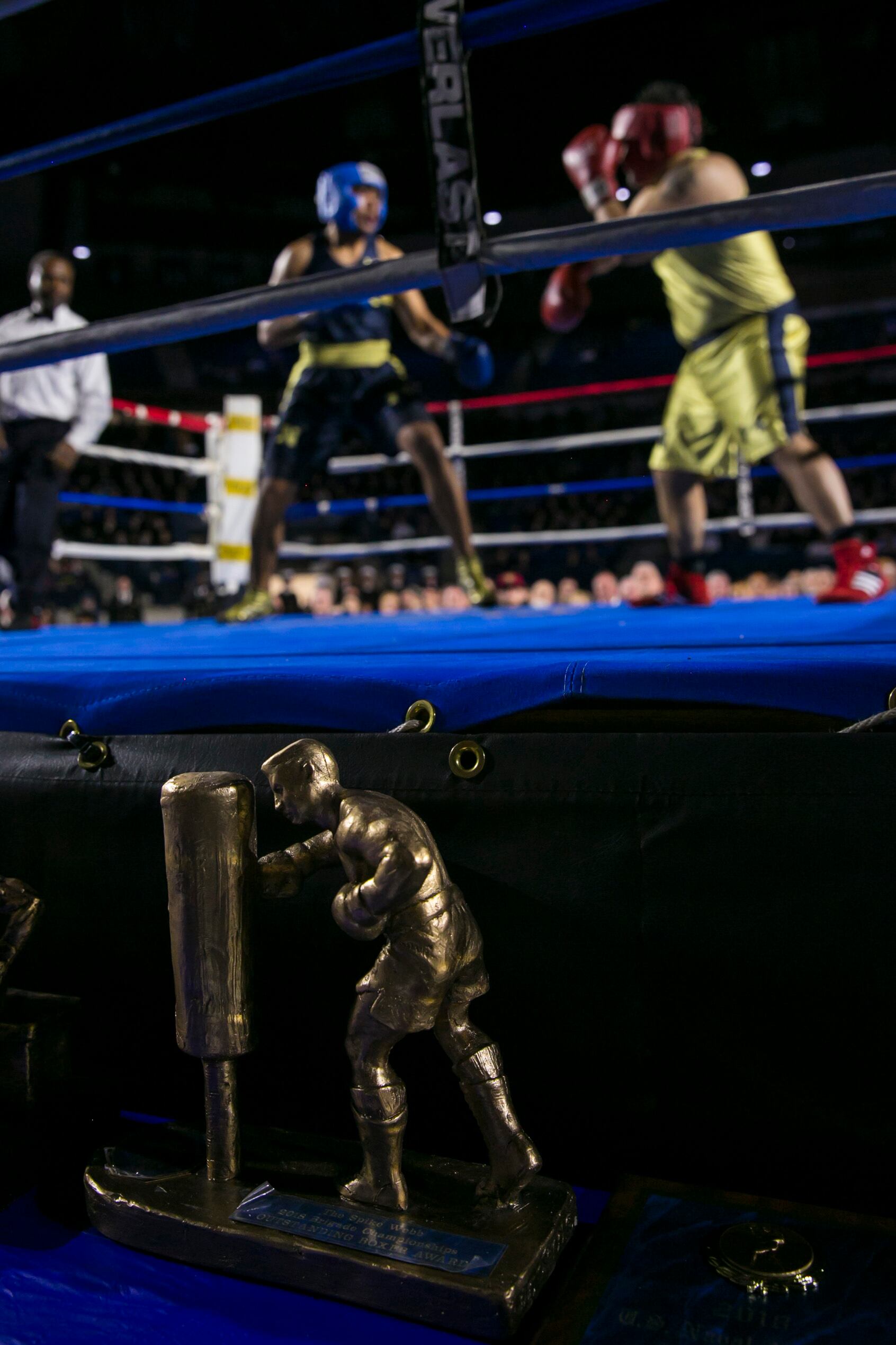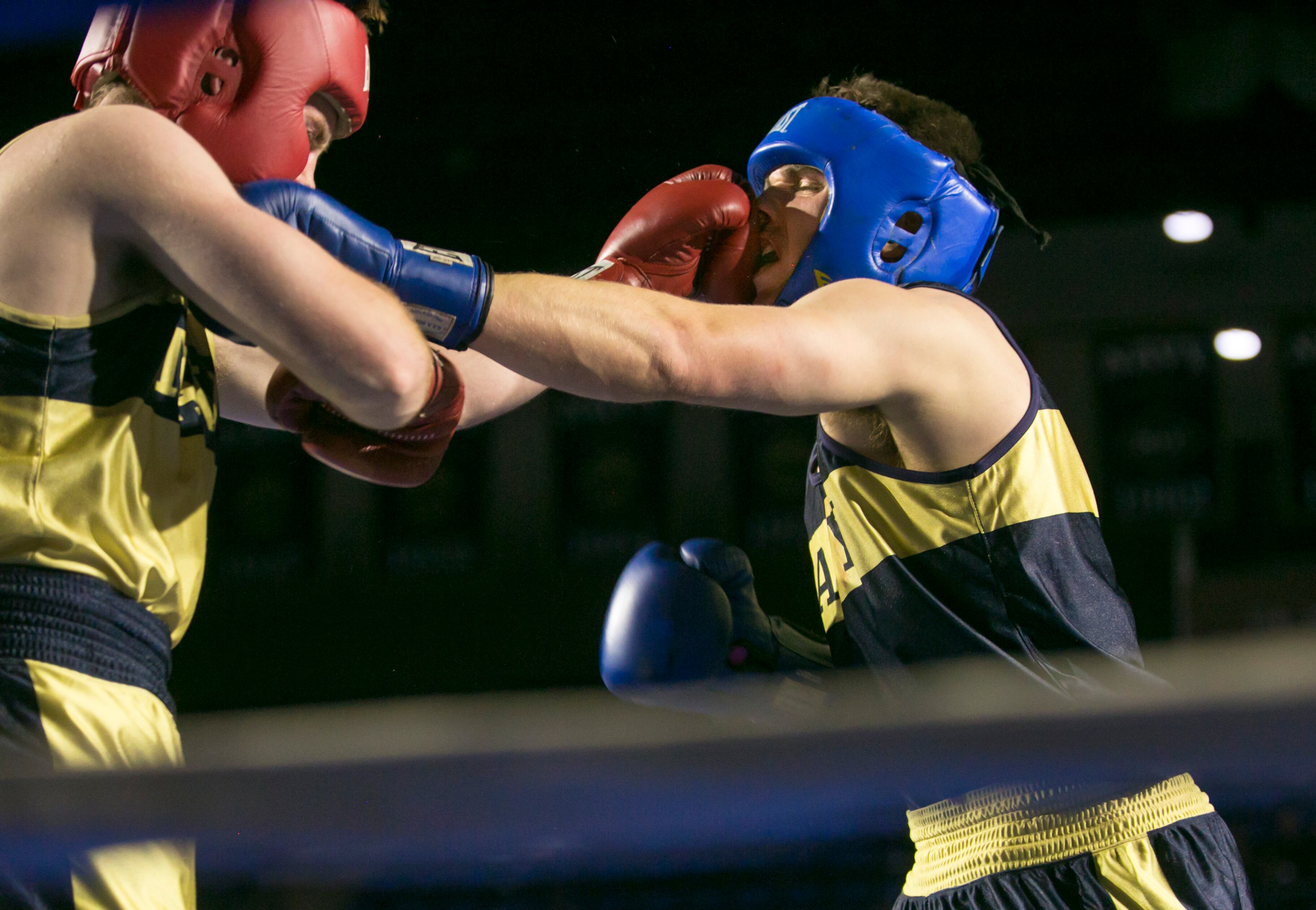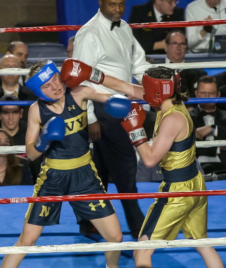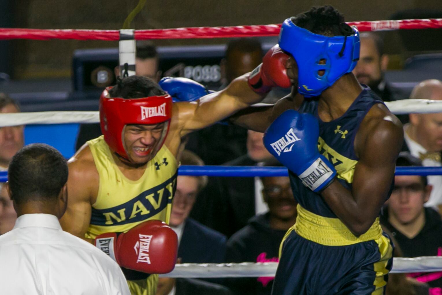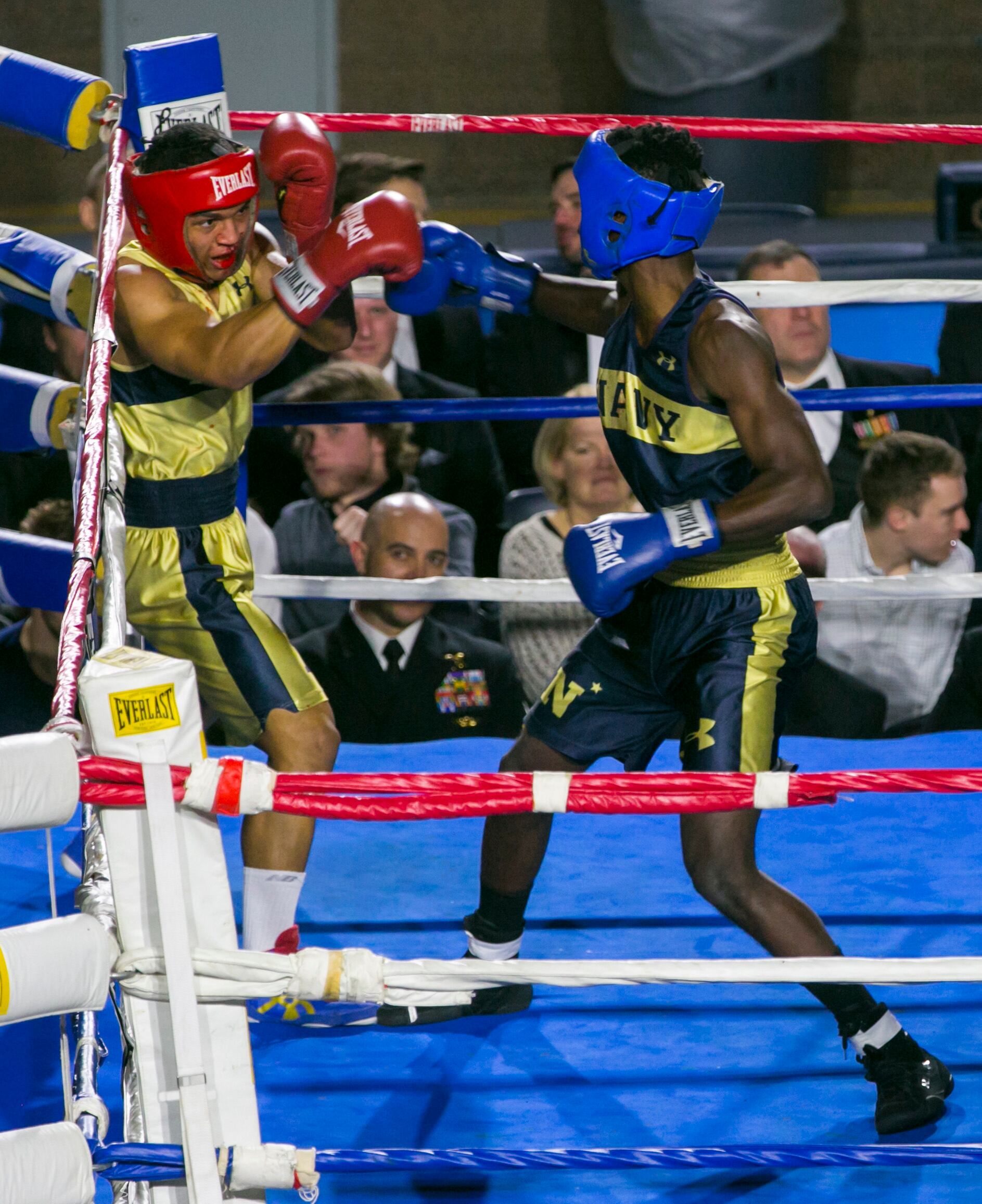 /Alex Olajide (in gold) from New York, fights Ryan Caldwell (in Blue) from Valley Forge, PA, in the 165 lb fight during the United States Naval Academy's 77th Brigade Boxing Championships held on Feb. 23, 2018. (Alan Lessig/Staff)
