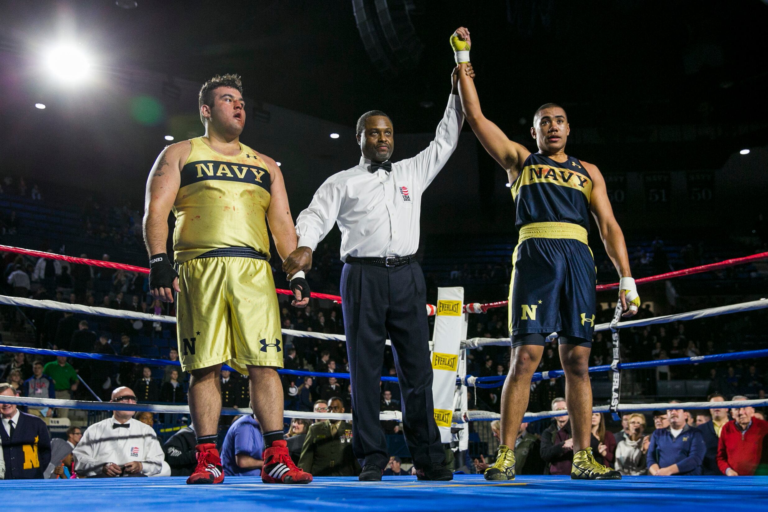 Charles Patterson, right, from Honolulu, HI defeats Joey Resendez, left, from El Paso, TX, in the Heavyweight fight during the United States Naval Academy's 77th Brigade Boxing Championships held on Feb. 23, 2018. (Alan Lessig/Staff)
