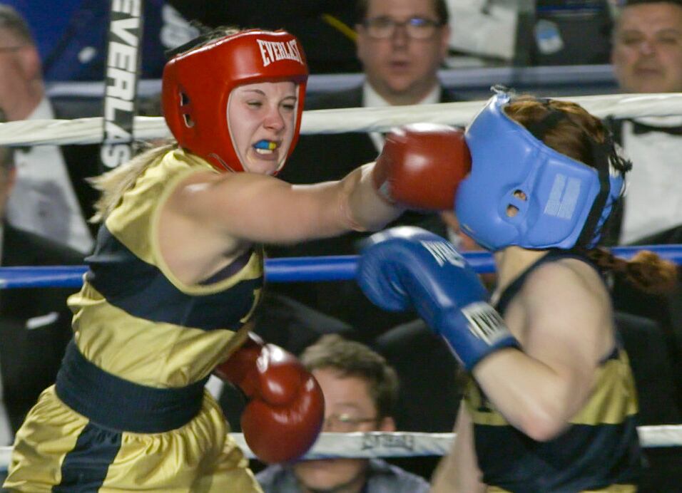Mikayla Lint (in gold) hits Darcy Stack, right, (in blue) during the 139 lb weight class bout at the United States Naval Academy's 77th Brigade Boxing Championships held on Feb. 23, 2018. (Alan Lessig/Staff)