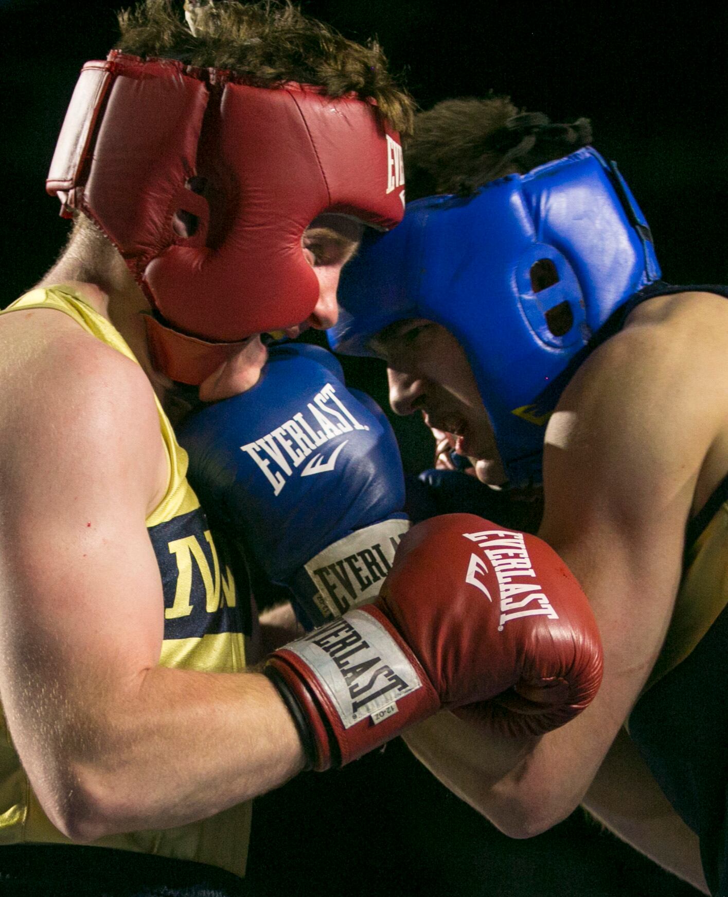 Jay Packer, (in gold) and Charlie Akerblom, (in blue), both from Philadelphia, PA, slug it out in the 185 lb weight class during the United States Naval Academy's 77th Brigade Boxing Championships held on Feb. 23, 2018. Akerblom won the fight. (Alan Lessig/Staff)