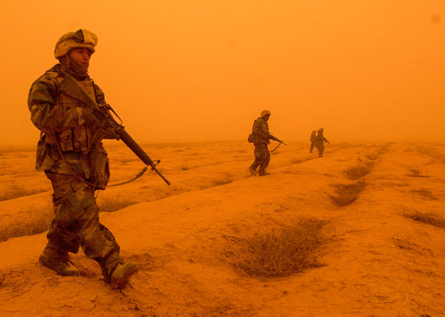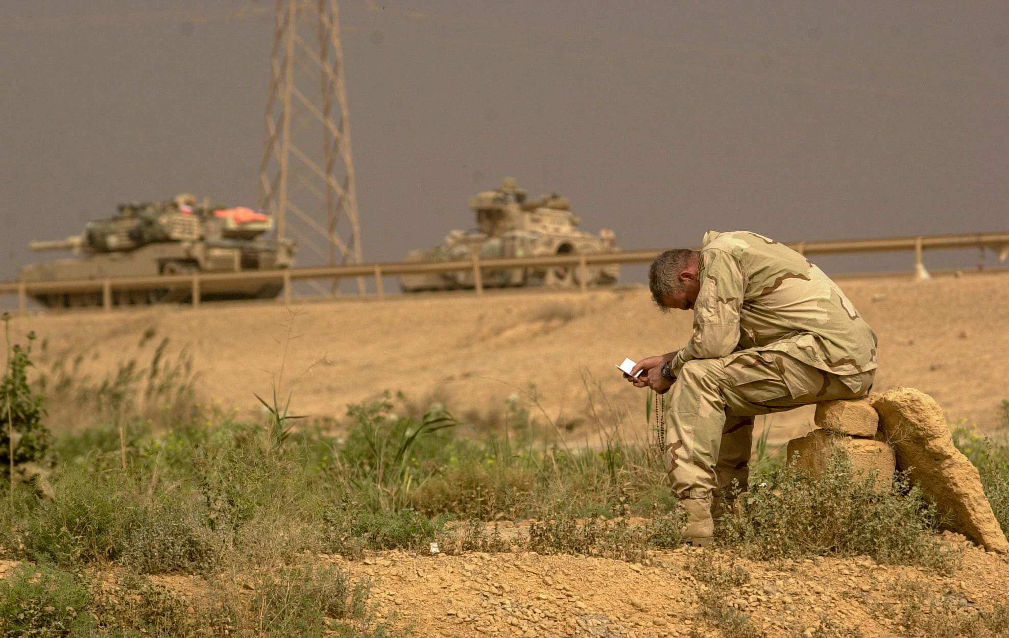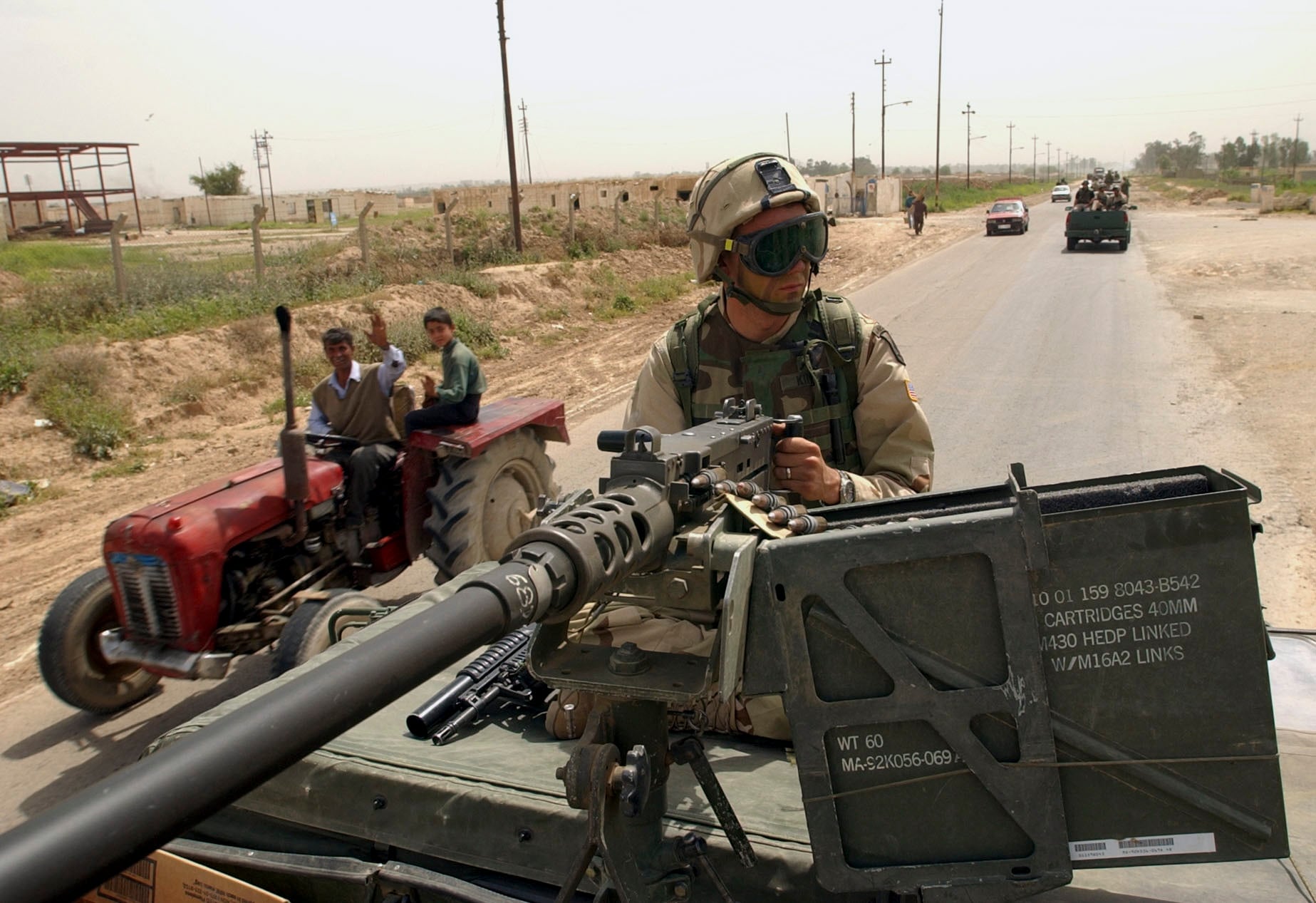 with fellow Marines patrol outside the artillery position in central Iraq to make sure it is safe for the artillery convey to head to another area on March 26, 2003. (Jud McCrehin/Marine Corps Times)Vehicles from the U.S. Army's 3rd Infantry Division, 3rd Brigade rumble along an access road to highway 10 enroute to the Northwestern side of the city, to complete the encirclement of Baghdad. The 3rd Squadron, 7th Cavalry Regiment has had some fierce fighting on highway 10 over the last two days, killing close to 1000 Iraqi soldiers in vehicles ranging from tanks to buses loaded with explosives. The Cavalry's job was to secure the highway and allow safe pasage of the rest of the 3rd Brigade. (Warren Zinn/Army Times)U.S. Army Pvt. Troy King, from Denver, Colorado, mans a .50 cal machine gun on his humve while escorting members of a U.S. Air Force Global Airfield Assesment Team (GAAT) from McGuire AFB in New Jersey. King is from the 173rd, 1st of the 508, who gave the GAAT added security as they convoyed from Karkuk Air Base to K-1, another Iraqi military airfield on the outskirts of Karkuk. Once there, the GAAT team measured and tested the quality of the runways and parking ramps to see if they could support the weight of heavy aircraft. (Alan Lessig/Air Force Times)Villagers from the village of As Samawah walk past U.S. Army 7th Cavalry positions outside the city, as smoke billows in the background from a weapons depot struck in the city. The Cavalry has been fighting in and around the town for more than 48 hours, facing at times strong resistence from the fighters inside. (Warren Zinn/Army Times)Cpt. Bill Brown, 34 of Savannah, Ga takes advantage of a pause in action to find a quiet place to pray. Brown is with the U.S. Army's 3rd Squadron, 7th Cavalry Regiment. The Cavalry is currently holding a blocking position in the south of Baghdad to control all traffic moving in and out of the city. (Warren Zinn/Army Times)Medical personel of the U.S. Army 86th Combat Support Hospital located at Tallil air base in Southern Iraq, change the dressings on a wounded Iraqi civilian. Spec. Brian Herndon,left, from Carlsbad, NM, 1st Lt. Dave Allen, middle right, from Columbus OH, and Spec. James Shead, right, from Austin Texas care for the wounded. (Alan Lessig/Army Times)Baghdad, Iraq 07/09/03