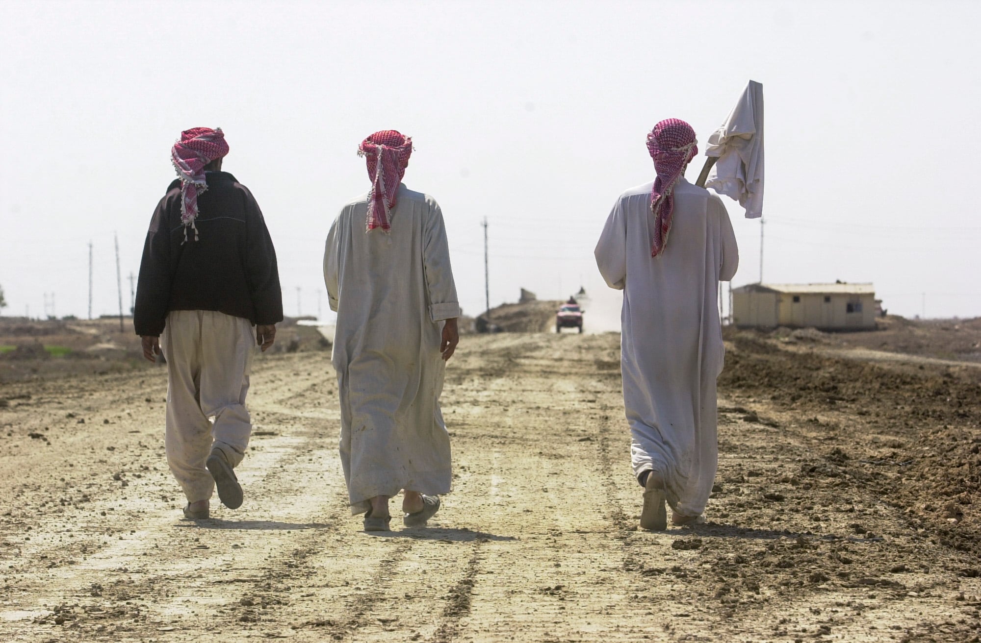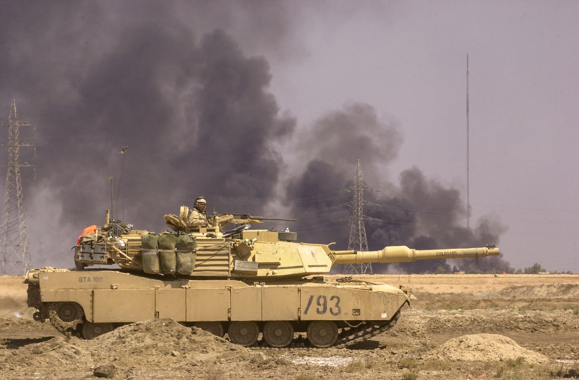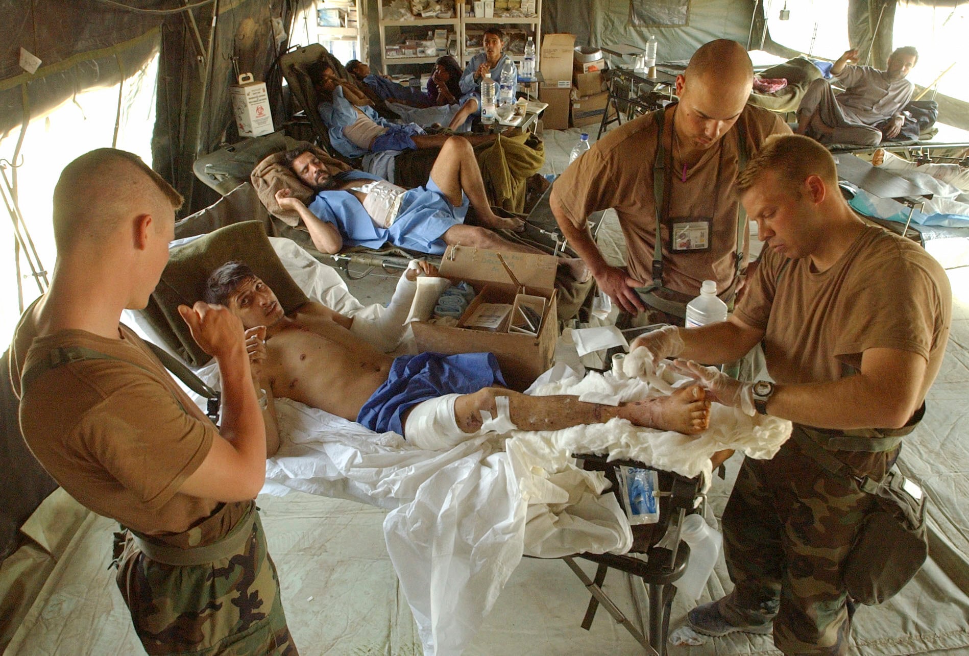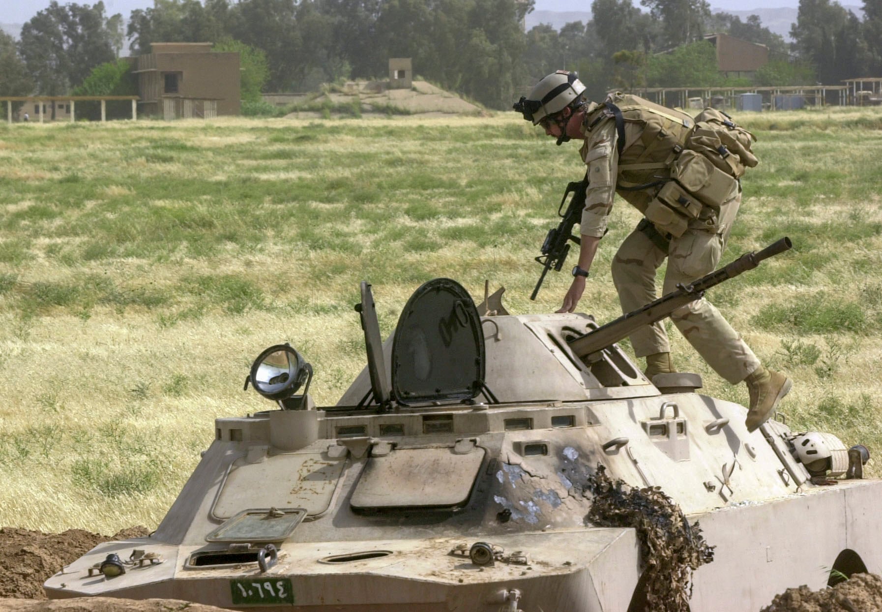 with fellow Marines patrol outside the artillery position in central Iraq to make sure it is safe for the artillery convey to head to another area on March 26, 2003. (Jud McCrehin/Marine Corps Times)Vehicles from the U.S. Army's 3rd Infantry Division, 3rd Brigade rumble along an access road to highway 10 enroute to the Northwestern side of the city, to complete the encirclement of Baghdad. The 3rd Squadron, 7th Cavalry Regiment has had some fierce fighting on highway 10 over the last two days, killing close to 1000 Iraqi soldiers in vehicles ranging from tanks to buses loaded with explosives. The Cavalry's job was to secure the highway and allow safe pasage of the rest of the 3rd Brigade. (Warren Zinn/Army Times)U.S. Army Pvt. Troy King, from Denver, Colorado, mans a .50 cal machine gun on his humve while escorting members of a U.S. Air Force Global Airfield Assesment Team (GAAT) from McGuire AFB in New Jersey. King is from the 173rd, 1st of the 508, who gave the GAAT added security as they convoyed from Karkuk Air Base to K-1, another Iraqi military airfield on the outskirts of Karkuk. Once there, the GAAT team measured and tested the quality of the runways and parking ramps to see if they could support the weight of heavy aircraft. (Alan Lessig/Air Force Times)Villagers from the village of As Samawah walk past U.S. Army 7th Cavalry positions outside the city, as smoke billows in the background from a weapons depot struck in the city. The Cavalry has been fighting in and around the town for more than 48 hours, facing at times strong resistence from the fighters inside. (Warren Zinn/Army Times)Cpt. Bill Brown, 34 of Savannah, Ga takes advantage of a pause in action to find a quiet place to pray. Brown is with the U.S. Army's 3rd Squadron, 7th Cavalry Regiment. The Cavalry is currently holding a blocking position in the south of Baghdad to control all traffic moving in and out of the city. (Warren Zinn/Army Times)Medical personel of the U.S. Army 86th Combat Support Hospital located at Tallil air base in Southern Iraq, change the dressings on a wounded Iraqi civilian. Spec. Brian Herndon,left, from Carlsbad, NM, 1st Lt. Dave Allen, middle right, from Columbus OH, and Spec. James Shead, right, from Austin Texas care for the wounded. (Alan Lessig/Army Times)Baghdad, Iraq 07/09/03