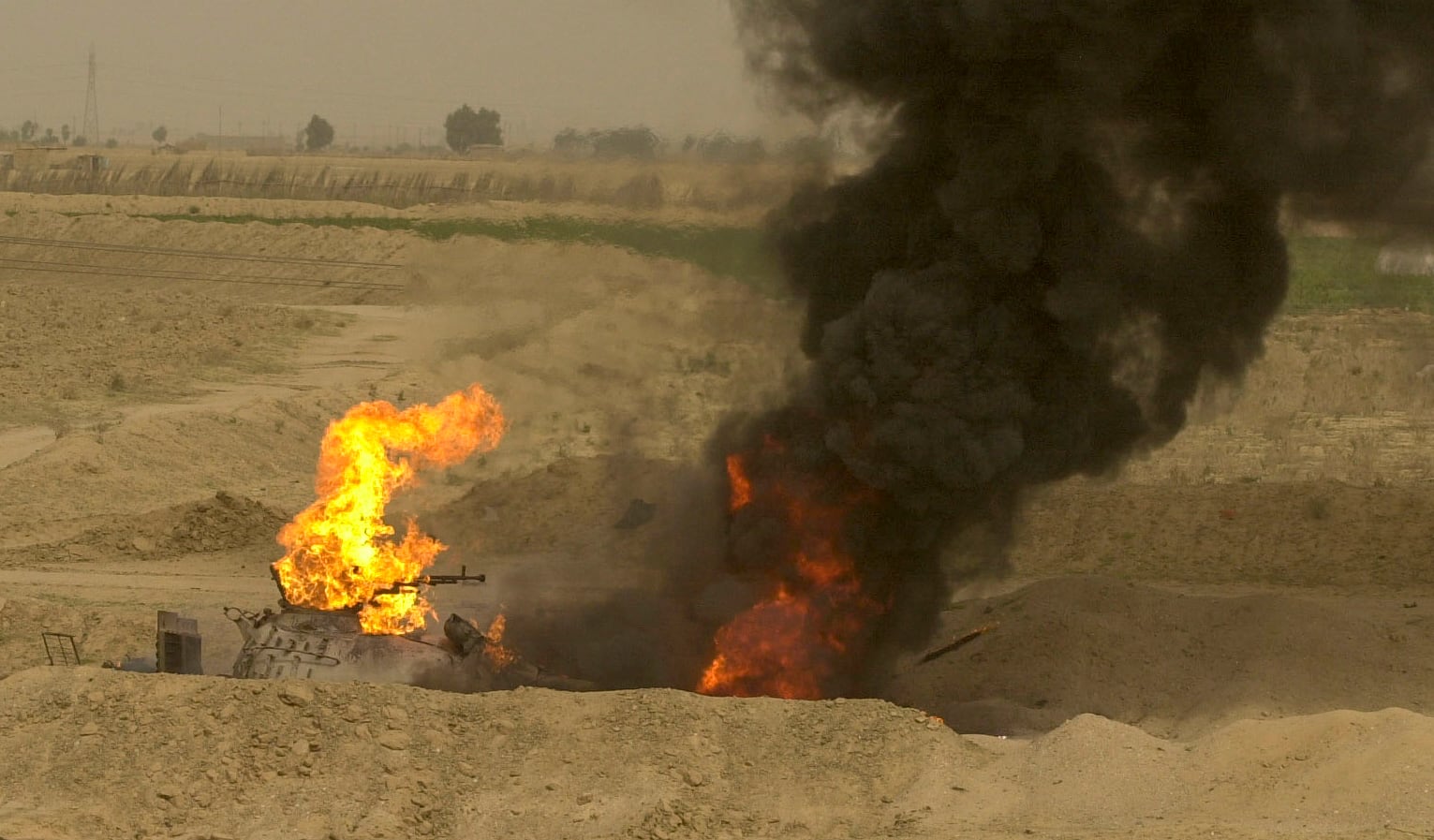 (Rob Curtis/Army Times)Soldiers from the U.S. Army's 7th Cavalry Regiment, watch on as a bomb from an F-16 blows up what was a headquarters for the Iraqi's that were fighting them. The troops have been operating around As Samawah for almost two days now and have been facing some strong resistance from the fighters inside. (Warren Zinn/Army Times)First Sgt. Kent Fuller from the 332nd Expeditionary Maintenance Squadron at an undisclosed air base in the middle east, waves his "retirement Flag" at departing aircraft headed for Iraq. He is from the 31st Fighter Squadron in Aviano, Italy. He got his deployment orders and his retirment orders on the same day so he got this flag to cheer on the pilots during his final deployment. (Alan Lessig/Air Force Times)The remains of an Iraqi tank burns in a ditch Friday afternoon in southern iraq on March 23, 2003 near a USMC artillery fighting position. (Jud Mccrehin/Marine Corps TimesStaff Sgt. Dan Hunter, from Georgia, a member of a U.S. Air Force Global Airfield Assesment Team (GAAT) from McGuire AFB in New Jersey, checks to make sure that an Iraqi armored vehical was clear while surveying a captured Iraqi Helicopter/Air Base on the outskirts of Kirkuk. The GAAT team measured and tested the quality of the runways and parking ramps to see if they could support the weight of heavy aircraft for use by the US military.
