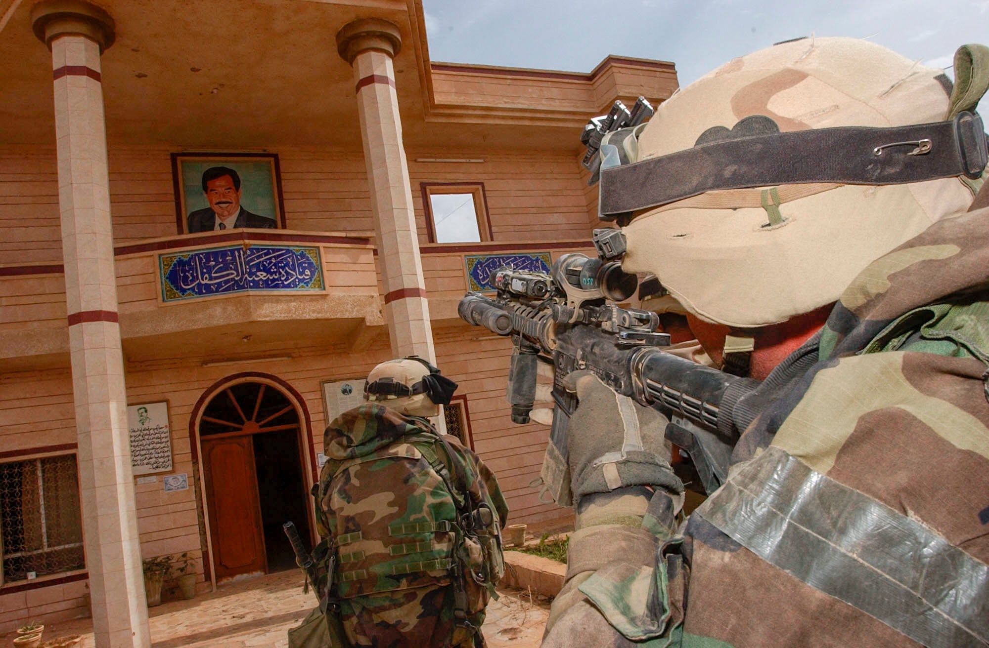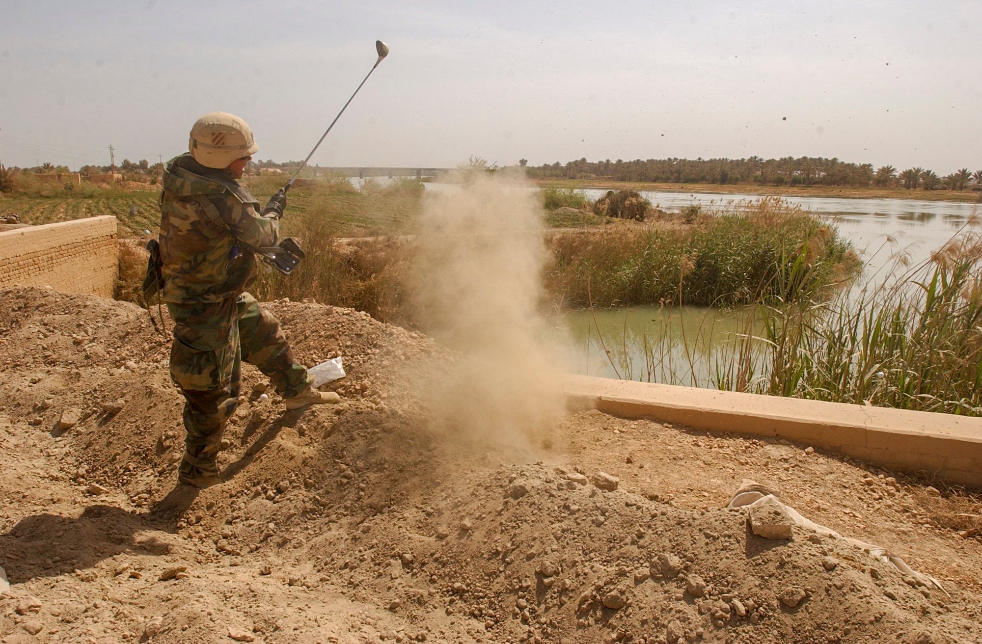 The soldiers found documents, weapons, and full grain bags hidden inside the walled compound. (Rob Curtis/Army Times)US. Army Soldiers from the 773 Transportation Company pulled their fuel tanker up to a large Saddam Icon so that they could write graffiti on the face. Several members of the company are New York Police and Firemen, and they had personal messages to write on the icon. This was located at Tallil air base in Southern Iraq. (Alan Lessig/Army Times)Staff Sgt.. Anthony Pieske, left, door gunner on HH-60 Pavehawk, mans gun next to pararescueman Master Sgt. David Armstrong, right, while flying a search and rescue flight over southern Iraq on Monday. (Alan Lessig/Air Force Times)PFC Joseph DeWitt, 26, from Suffock County, Ny, runs while carrying a young Iraqi boy who was injured during a heavy batle between the U.S. Army's 7th Cavalry Regiment and Iraqi forces near the village of Al Faysaliyah, Iraq. The Cavalry spent the entire night fighting through the areas and within the city of Al Faysaliyah. The U.S. took no casualties while the Iraqis took estimated 150 casualties inflicted by the Cavalry on March 25, 2003. (Warren Zinn/Army Times)Major Brad Gavle, 39 from Decorah, Iowa of the 3rd Squadron, 7th Cavalry Regiment takes a moment during a pause in combat to hit a golf ball into the Euphrates River on April 3, 2003, 20km south of Baghdad, Iraq. A major assault was launched last night by the 3rd Infantry Division as the division makes it way towards Baghdad. (Warren Zinn/Army Times)Capt. James McGahey, 29, from Brighton, MI, commander of the "Bulldogs", Bravo Company, 3rd Battalion, 2nd Brigade, 101st Airborne Division (Air Assault) covers an intersection as A1C Larry Hickey, 28, Waynesville, MO, Enlisted Terminal Attack Controller (ETAC) (foward air strike controllers) with the 19th Air Support Operations Squadron, passes behind as US servicemen continue to clear the city of militia and weapons Sunday, 4/6/03. (11:00) The US forces in Karbala have found numerous, large weapons chaches in schools and municipal buildings.