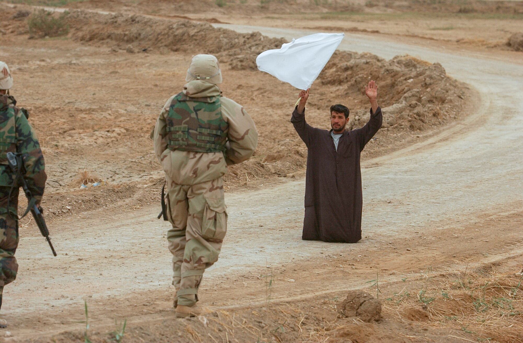 A tank from the U.S. Army's 7th Cavalry Regiment, stands guard to the entrance of the town of As Samawah, as smoke billows in the background from a weapons depot struck in the city. The Cavalry has been fighting in and around the town for more than 48 hours, facing at times strong resistence from the fighters inside. (Warren Zinn/Army Times)An Iraqi surrenders to Soldiers from 3rd ID. (Warren Zinn/Army Times)03/24/03 As Samawah, Iraq