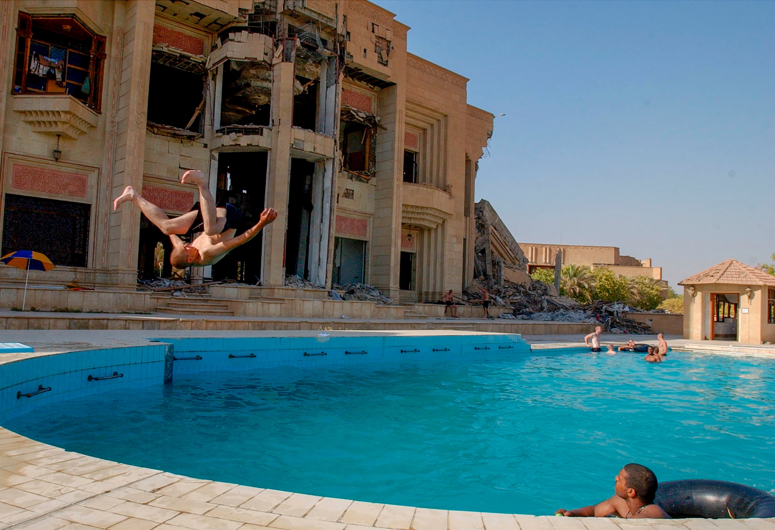 Soldiers with 2nd Bat., 3rd Field Art. Regiment, 1st A.D. take some down time to go swimming in the pool at their resdience, Uday Hussein's old palace. While some of the buildings are destroyed the rest are occupied by soldiers, with soldiers living in every available space in the compund. (Warren Zinn/Army Times)