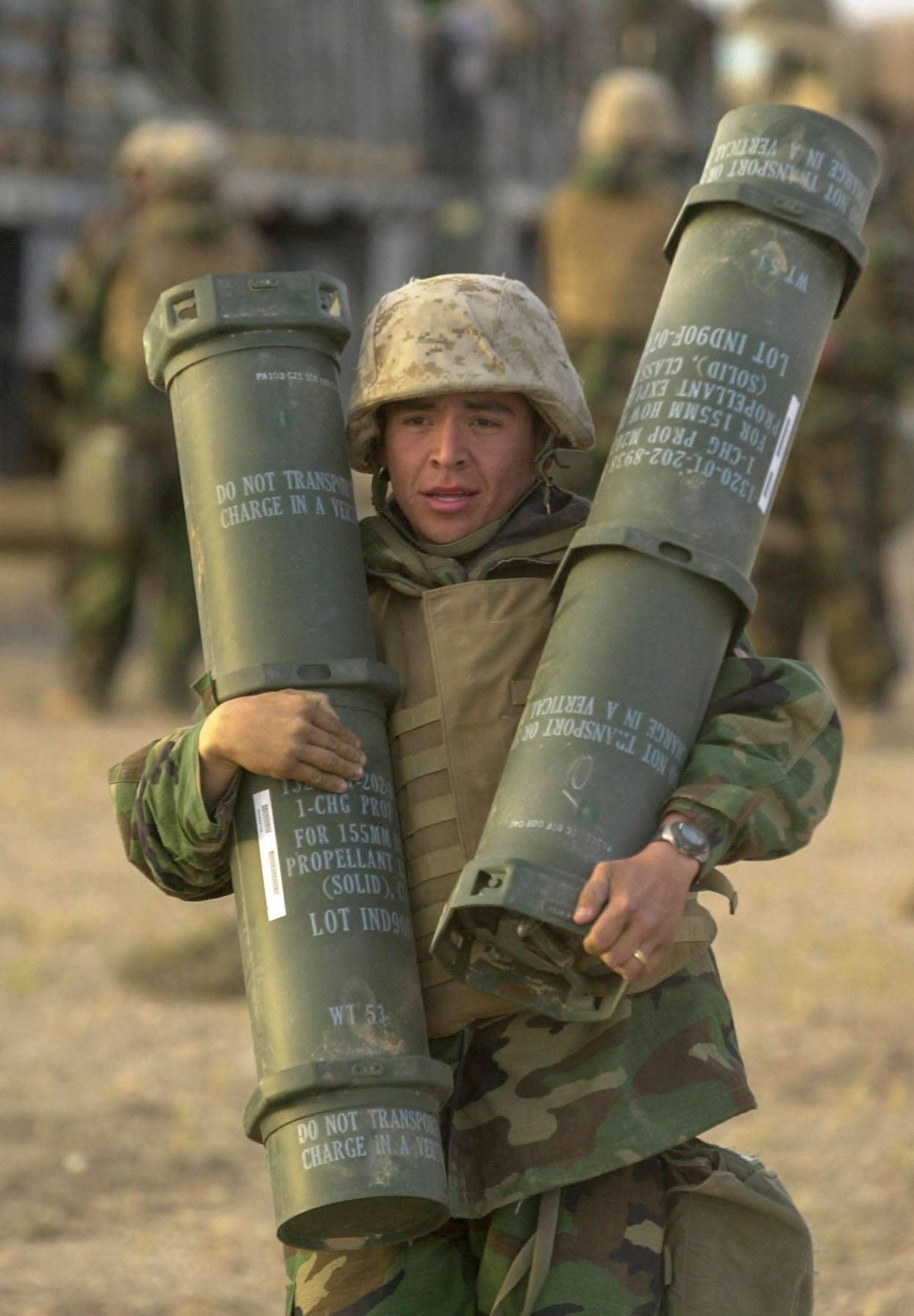 Vehicles from the U.S. Army's 3rd Infantry Division rumble down a road north into Iraq. The Convoy has been moving for two days now on their drive north to take down the Iraqi regime. Up until this point the convoy has received little enemy contact. (Warren Zinn/Army Times)Lance Cpl. Steven Lopez, 19, with Battery M, 3rd Battalion, 11th Marine Regiment from Los Angeles, CA carries two charges for a 155mm howitzer during a ammunition resupply at an artillery position in southern Iraq on March 22, 2003. 03/22/2003