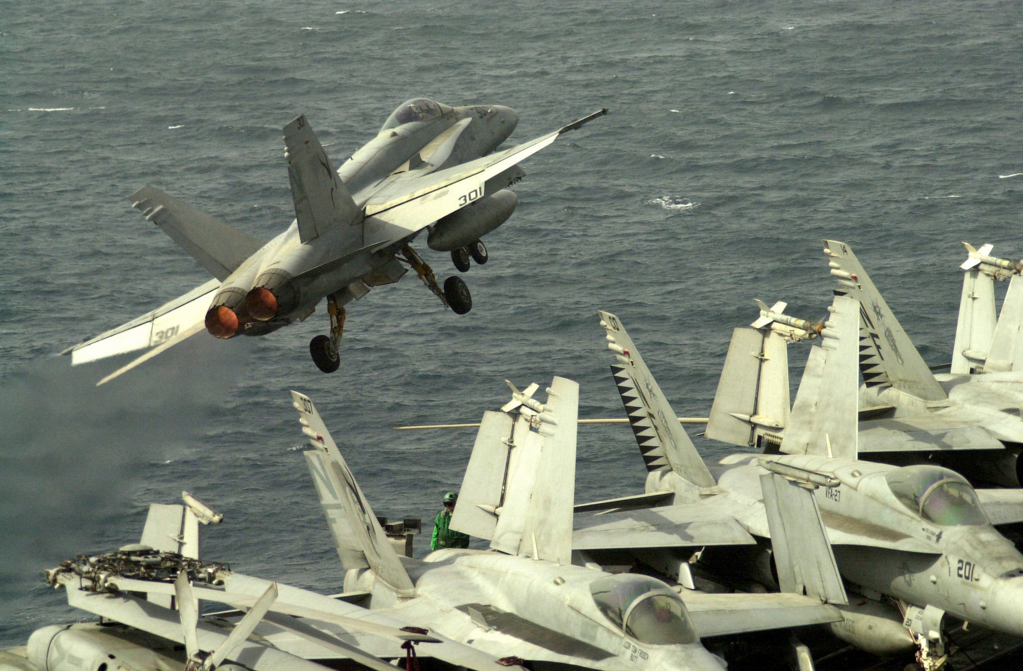 Lance Cpl. Guilbert Alce, 23, with battery M, 3rd Battalion, 11th Marine Regiment takes a nap in his sleeping hole near the 155mm Howitzer he works as a powder man on in an artillery position in southern Iraq.ABOARD THE USS KITTY HAWK - MARCH 20, 2003 - Loaded with missiles and bombs, an F/A-18 Hornet from Strike Fighter Squadron 192 catapults off the aircraft carrier Kitty Hawk during an early afternoon launch. Eight Hornets, including some from VFA-192 and two F-14 Tomcats from Fighter Squadron 154, flying off the Kitty Hawk hit targets in southeastern Iraq March 19 in response to Iraqi provocation. Still flying under "Operation Southern Watch, allied aircraft spent Thursday softening targets during the transition to "Operation Iraqi Freedom."