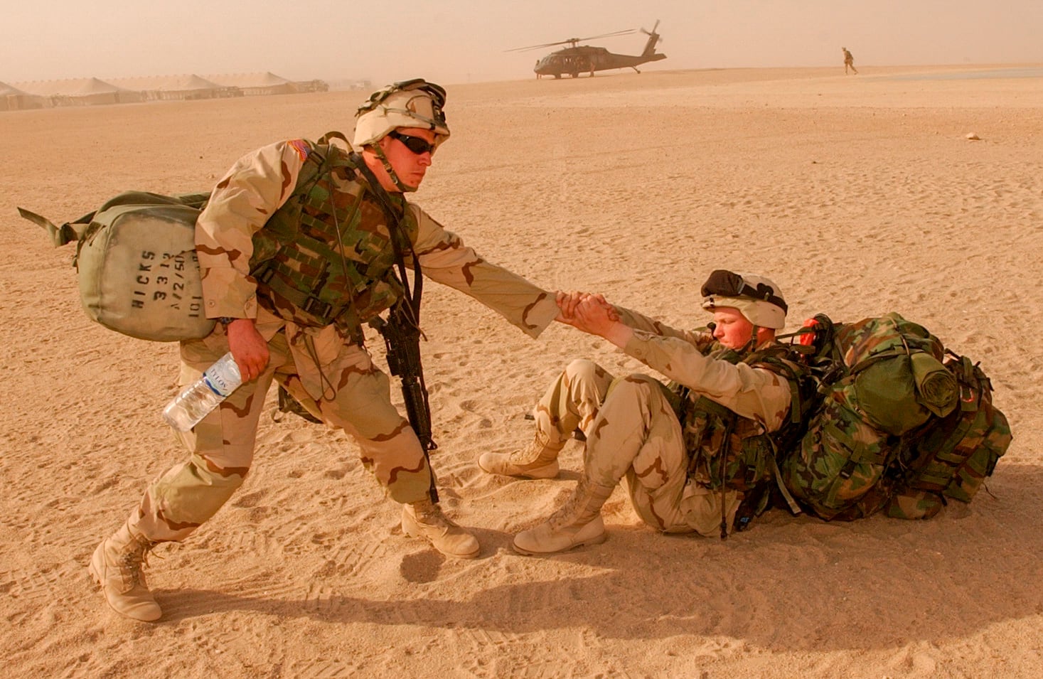 ( Jud McCrehin/Marine Corps Times)Marines from Battery M, 3rd Battalion, 11th Marine Regiment fire a 155mm Howitzer towards Iraqi military positions in Al Kut, Iraq . ( Jud McCrehin/Marine Corps Times)Capt. "KC" from the 332nd Expeditionary Fighter Squadron, was able to fly her battle damaged A-10 Warthog safely back from a close air support mission over Baghdad with serious damage caused by anti- aircraft fire that hit the tail section, cutting her hydraulic controls. She landed at a forward air base in a country near Iraq. She is from the 23rd Fighter Group from Pope Air Force Base, North Carolina.(Alan Lessig/Air Force Times)Members of the 101st Airborne (Air Assault)'s 2/502, PFC Jake Hvarde, 20, from Amboy, IL, helps PFC Dayne Eitel, 19, from Chico CA, as they wait for their flight at Camp New York, Kuwait, on Tuesday (3/18/03) at 1530. (Rob Curtis/Army Times)Soldiers from the 3rd Battalion, 2nd Brigade, 101st Airborne Division (Air Assault) engage in block-to-block urban combat in the streets of Karbala, Saturday, April 5. (Rob Curtis/Army Times)Sgt. Daniel Wiser, 25, of Waukesha, WI,yells to his section to haul ass back to the landing zone as he talks to the Blackhawk pilots before reboarding the plane as soldiers inspect vehicles in Mosul Wednesday, 4/30/03.