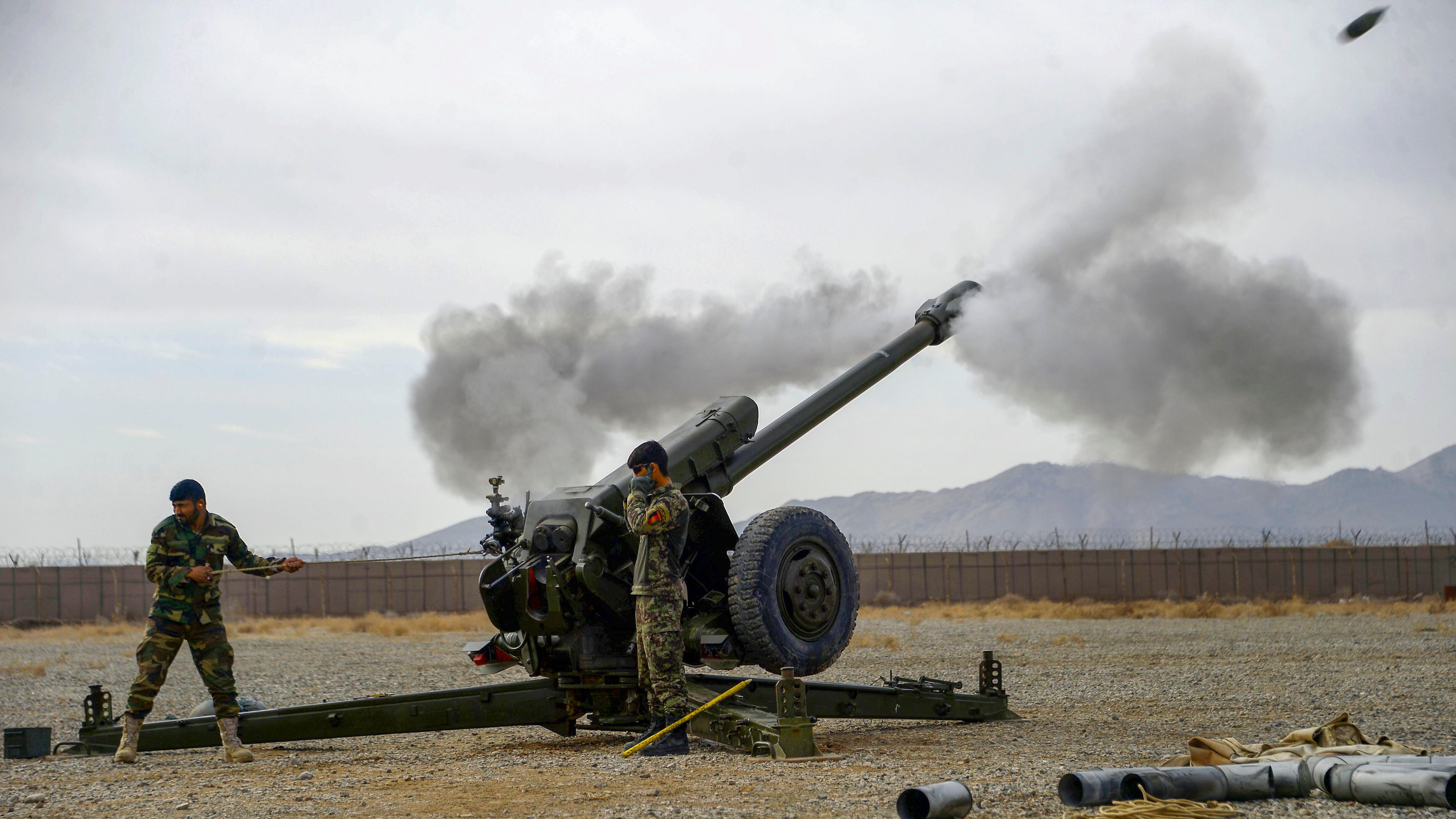 Afghan National Army (ANA) soldiers fire a D30 122mm Howitzer gun during a training session on Feb. 2, 2019, for ANA soldiers at Arena base in the Guzara district of Herat province. (HOSHANG HASHIMI/AFP/Getty Images)