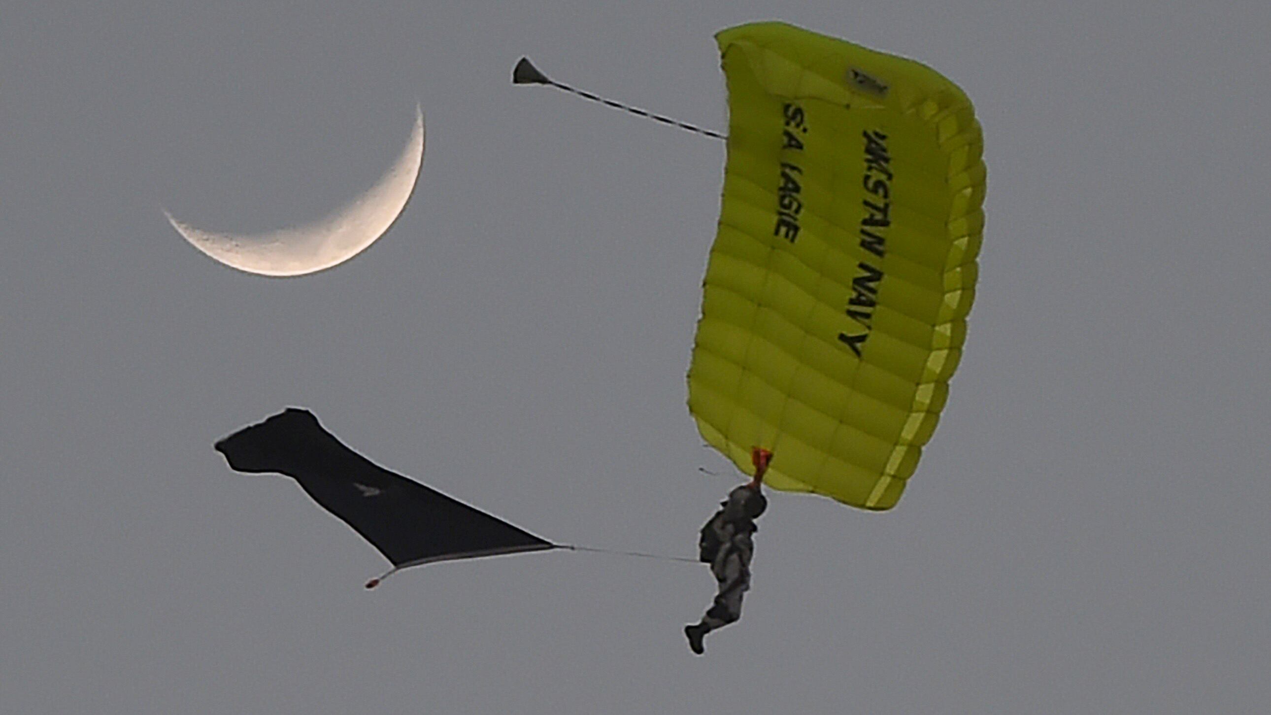 Pakistan Navy Special paratroopers forces take part in the Navy's Multinational Exercise 'AMAN-19' in Karachi on February 9, 2019. - Exercise Aman is scheduled from February 8 to 12, 2019, in which over 45 countries are participating with ships and observers. (RIZWAN TABASSUM/AFP/Getty Images)