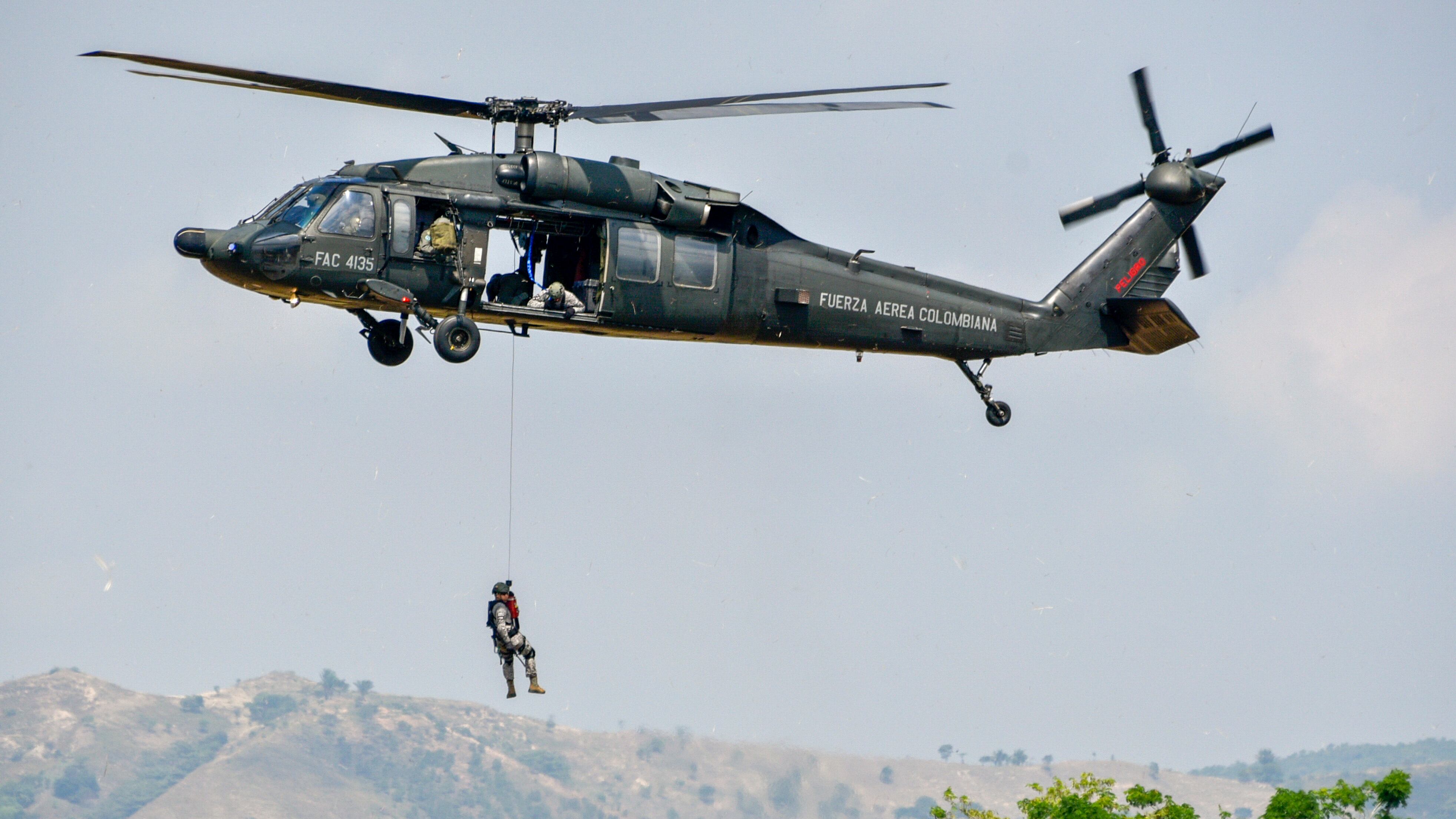 A soldier rappels from a helicopter during a demonstration by the military forces at President Ivan Duque's launch of the new national security and defense policy at the Tolemaida military fort in Cundinamarca, Colombia, on February 6, 2019. (GUILLERMO LEGARIA/AFP/Getty Images)