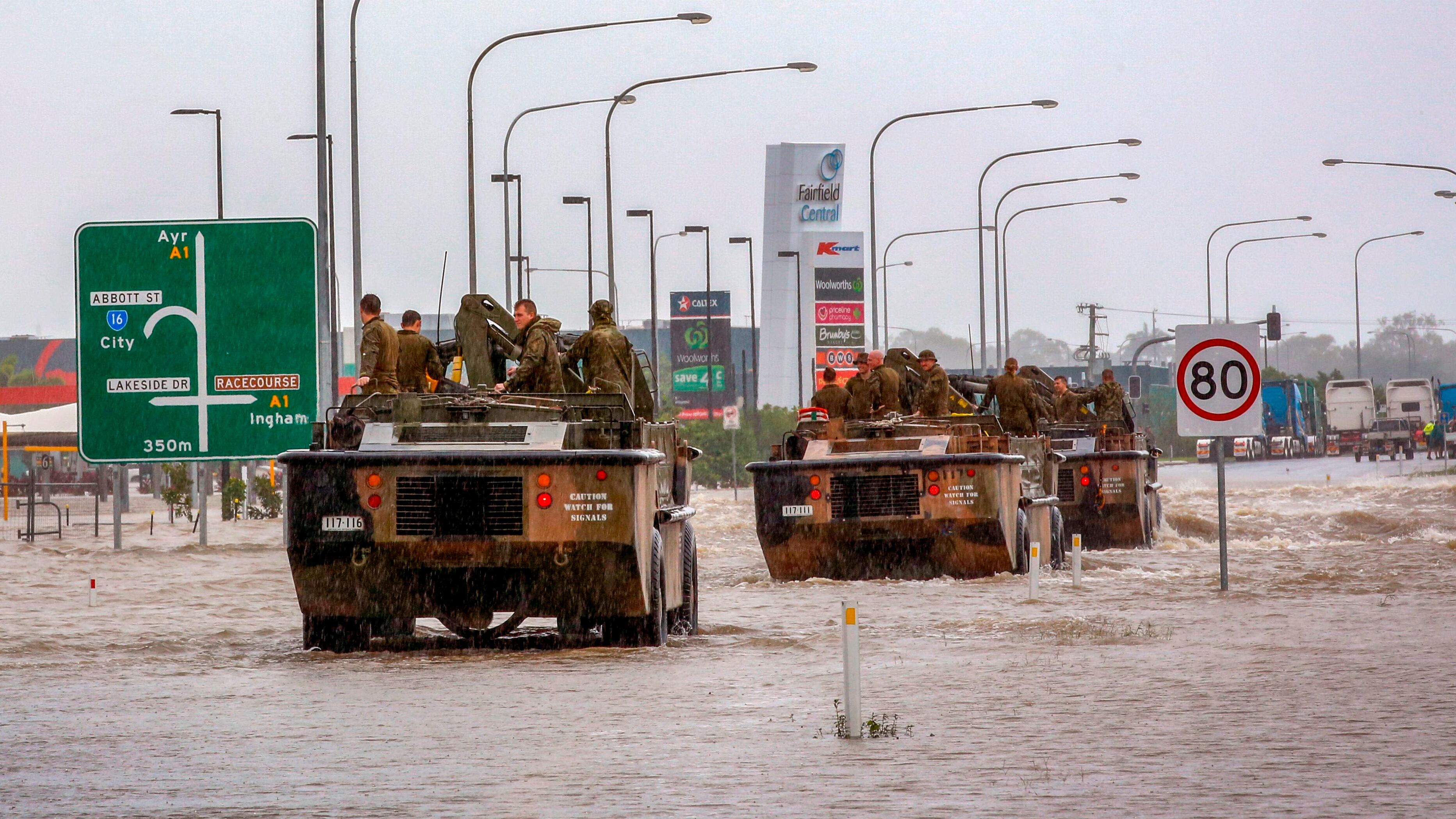 Australian Army vehicles enter Townsville to help evacuate flood-affected people on February 4, 2019, as the recent downpour in Australia's tropical north has seen some areas get a year's worth of rainfall in a week. - Australia's military has been deployed to tackle devastating "once-in-a-century" floods that have inundated homes, schools and airports in the country's northeast, forcing hundreds to flee and bringing crocodiles onto the streets. (STR/AFP/Getty Images)