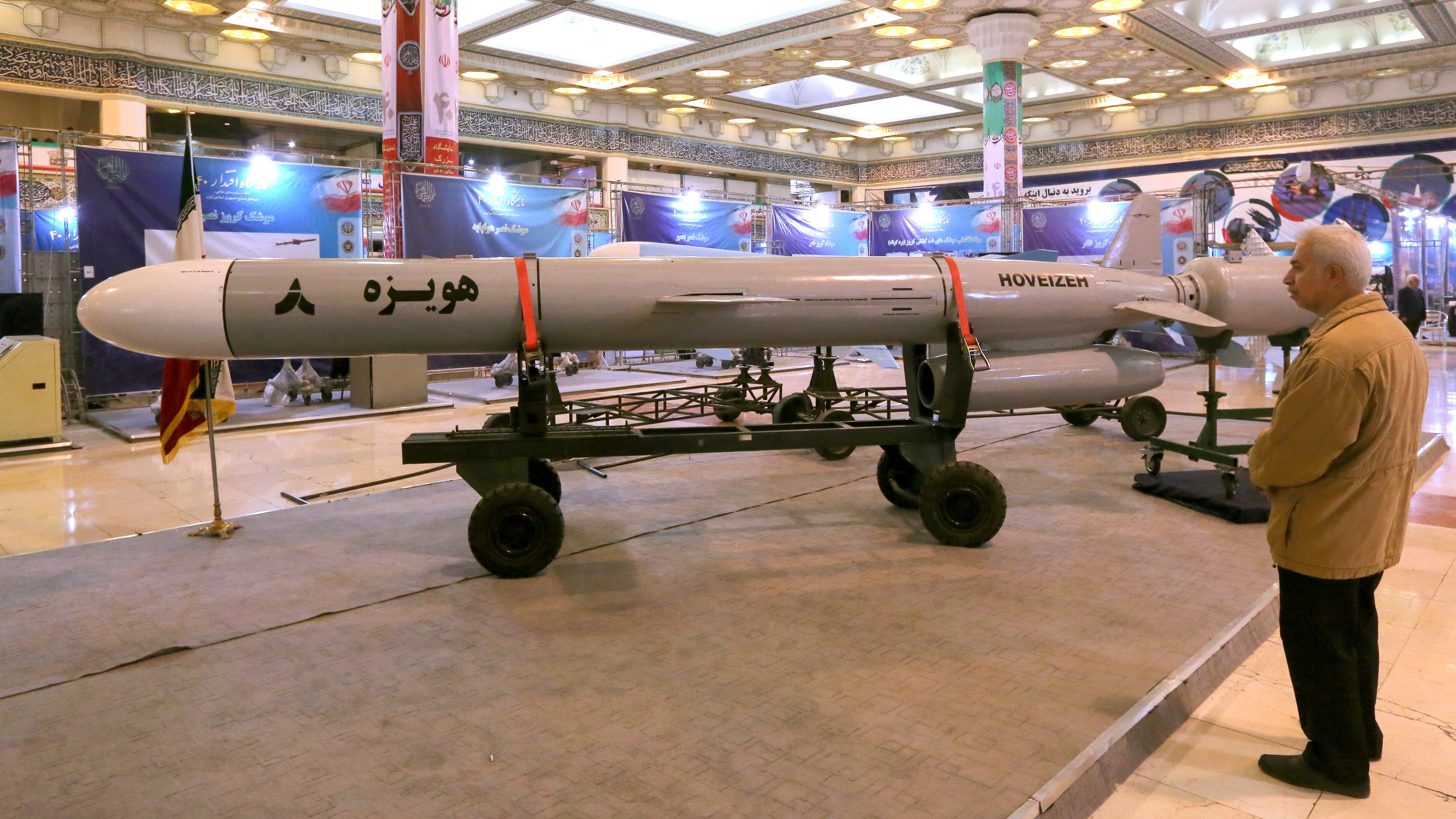 Hoveizeh, Iran's new cruise missile is shown during an exhibition in the capital Tehran on February 2, 2019. - Iran announced the successful test of a new cruise missile with a range of over 1,350 kilometers today, state TV reported. (ATTA KENARE/AFP/Getty Images)